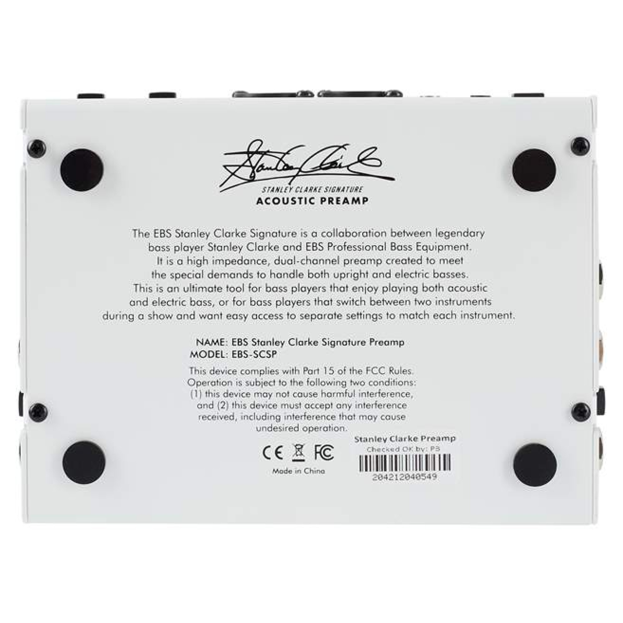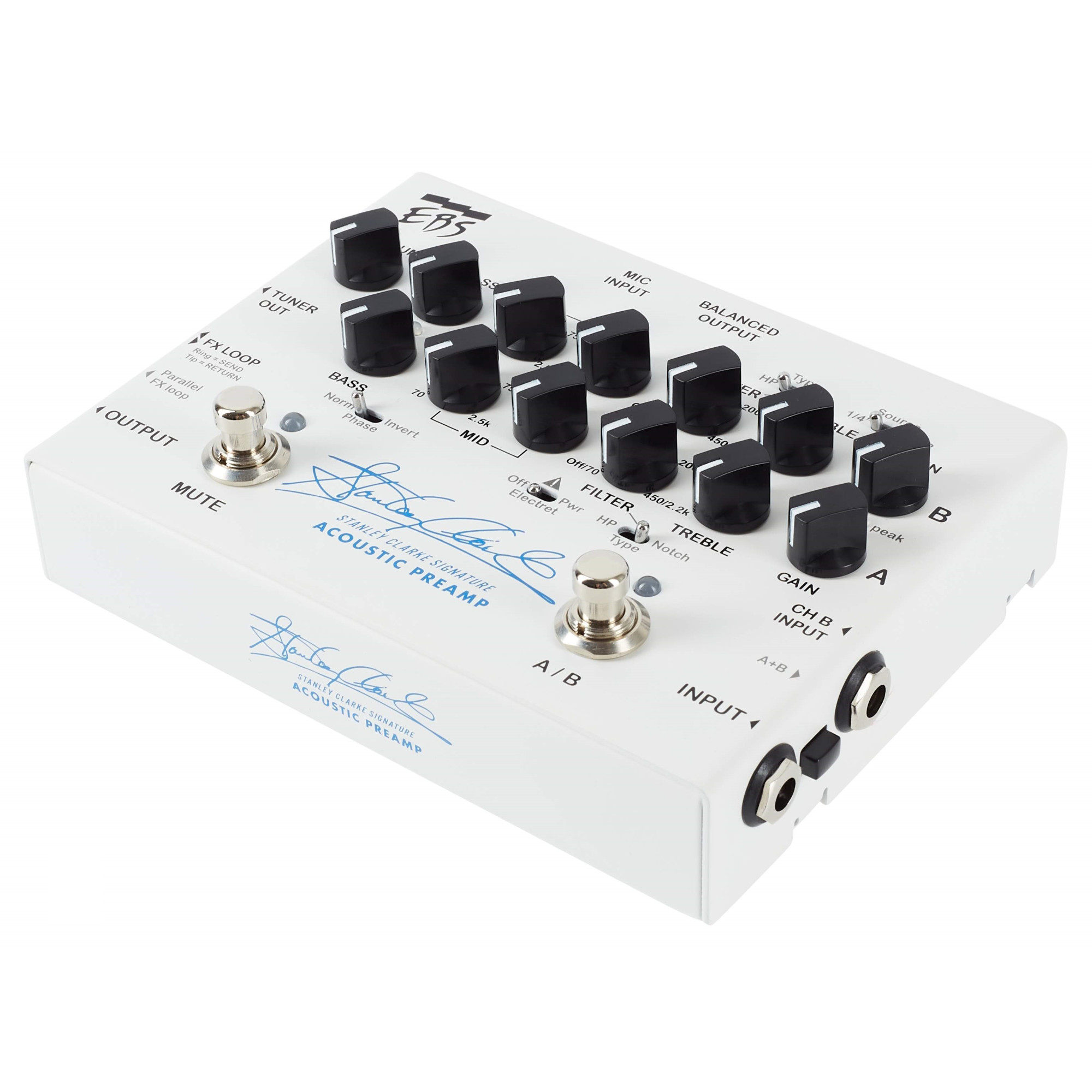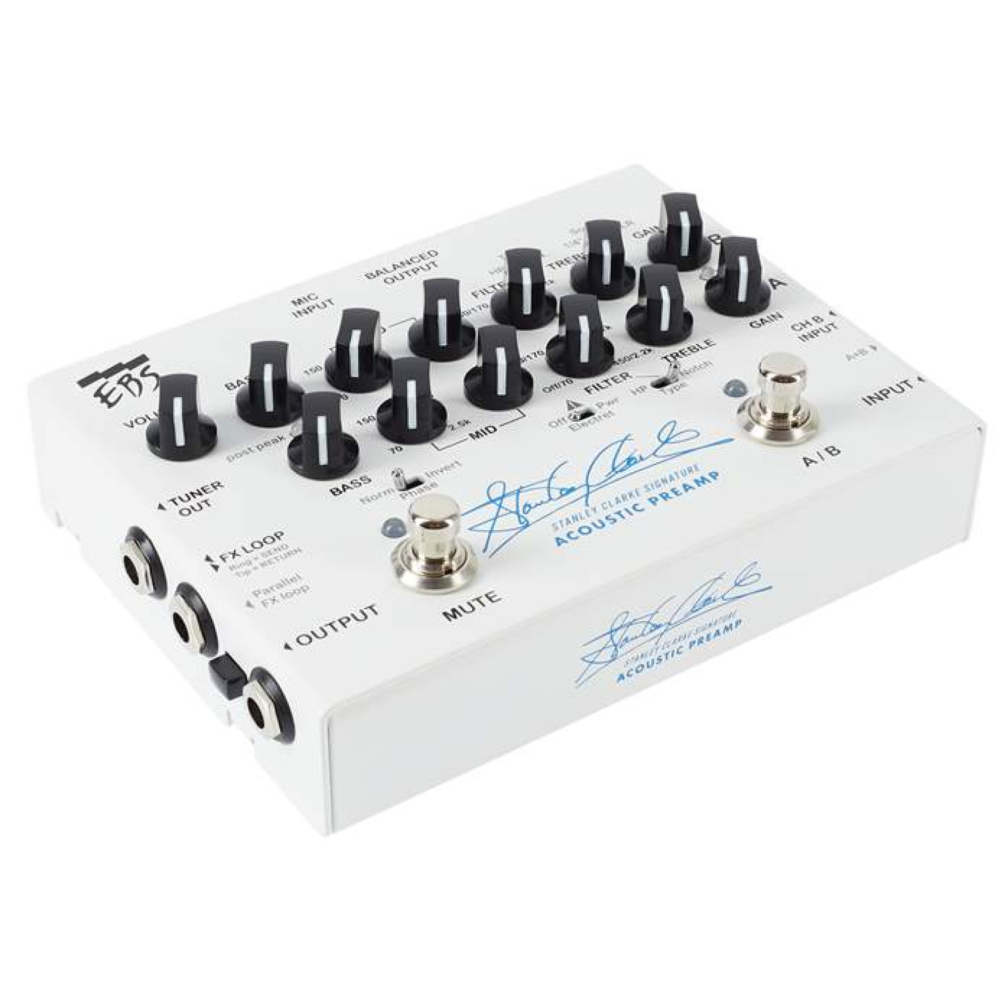 EBS Stanley Clarke Signature Preamp имеет также петлю FX Loop для внешних педалей эффектов, которая может быть включена после секции усиления, либо параллельно ей. Благодаря выходу для тюнера можно не волноваться, что Ваш «не тру байпас» тюнер будет пагубно влиять на чистоту сигнала. У педали есть выход на наушники и вход AUX, что делает её не только универсальным прибором для концертов и студийной записи, но и для репетиций и занятий на инструменте. Балансный выход позволяет подключать SCSP напрямую в микшерный пульт или аудио интерфейс компьютера. Весь этот богатый функционал педали говорит об одном: «подобных приборов для акустических инструментов до сих пор не было!»