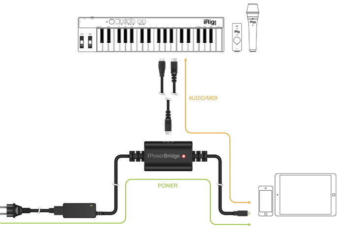 iRig PowerBridge оснащений двома незнімними кабелями і одним Mini-DIN роз'ємом. Один кабель підключається в електричну мережу, а другий - до iPhone, iPad або iPod touch. У центральному блоці розміщений Mini-DIN коннектор, що дозволяє підключити будь-який цифровий iRig пристрій, обладнаний Mini-DIN або Micro-USB портом. Використовуючи таке з'єднання, iRig PowerBridge безперервно живить і заряджає підключені до нього гаджети, в той же час пропускаючи через себе аудіо і MIDI інформацію, якою обмінюються iRig і iPhone, iPad або iPod touch.