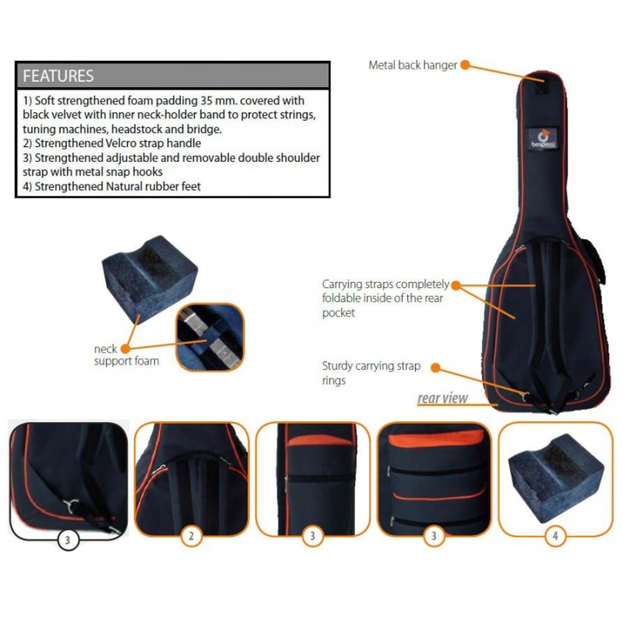 Чохол для електрогітари, серія Famous Line, виготовлений з міцного нейлону "Oxford cloth 600D" з посиленими швами. Товщина утеплювача становить 35 мм. Для аксесуарів передбачені 2 великих кишені, зверху і знизу. Бічна ручка для перенесення оснащена зручним ущільнювачем. Регульовані наплічні ремені з прихованим професійним кріпленням. Внутрішня частина чохла посилена для захисту струн і бриджу. Ззаду чохла є спеціальна петля для підвішування. Колір чорний.