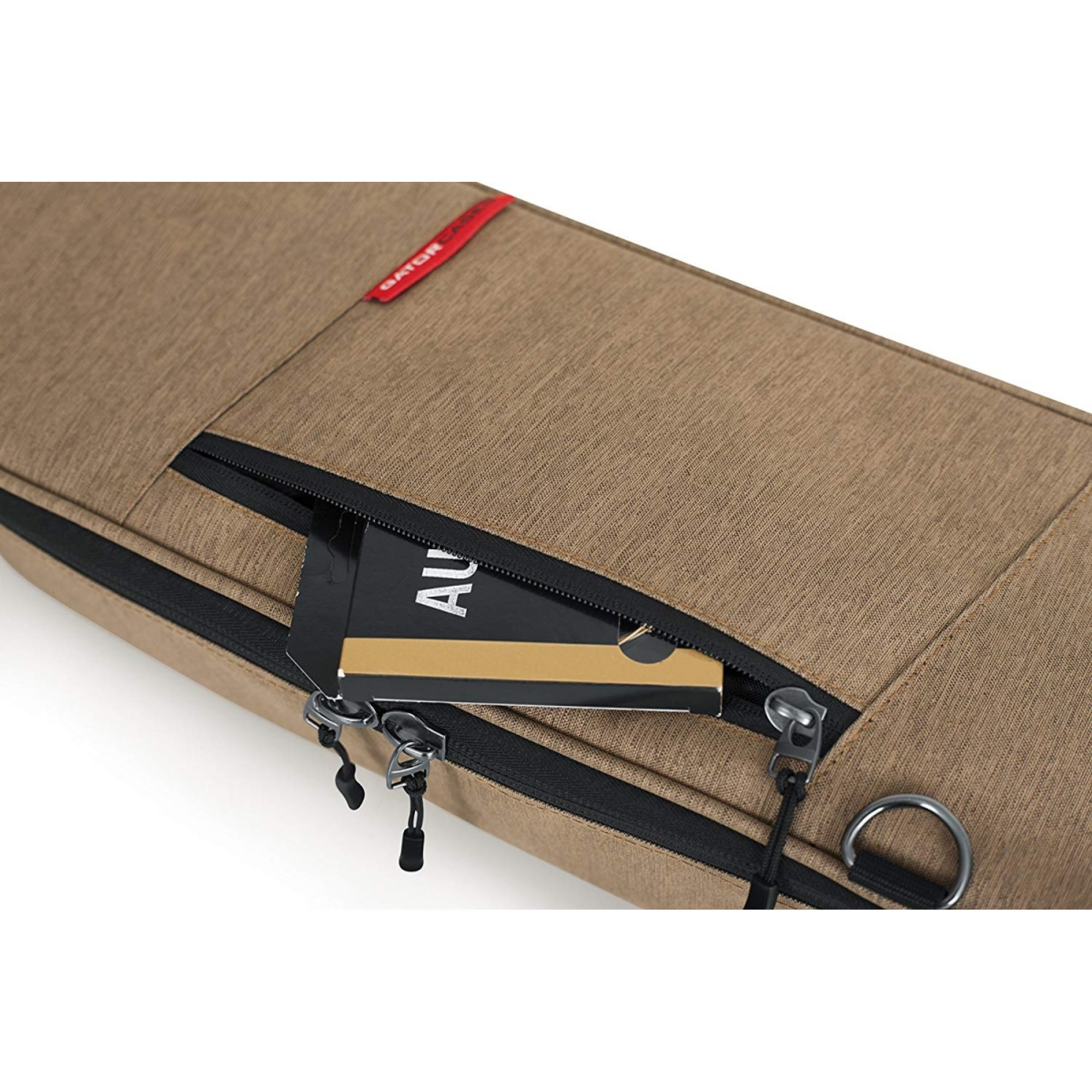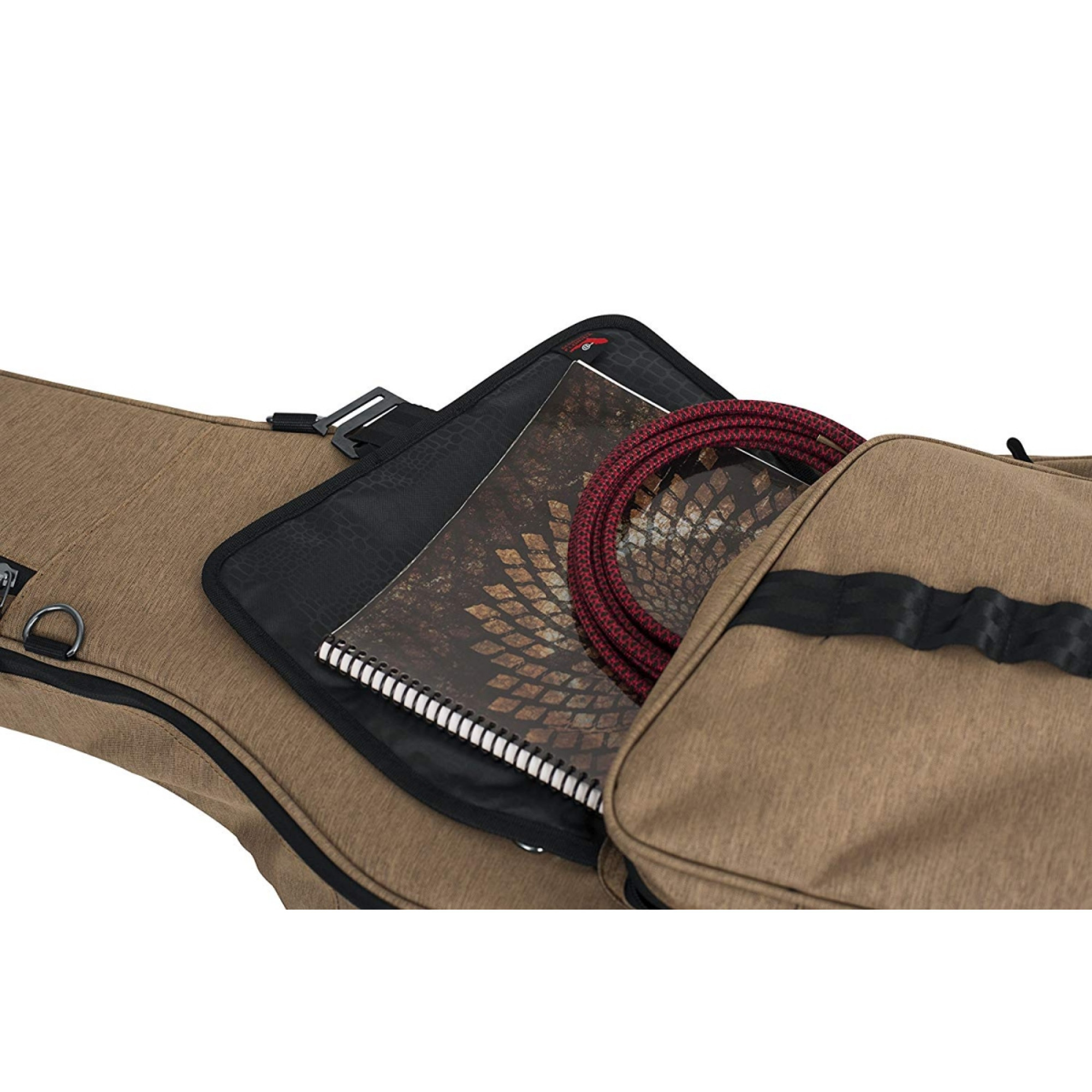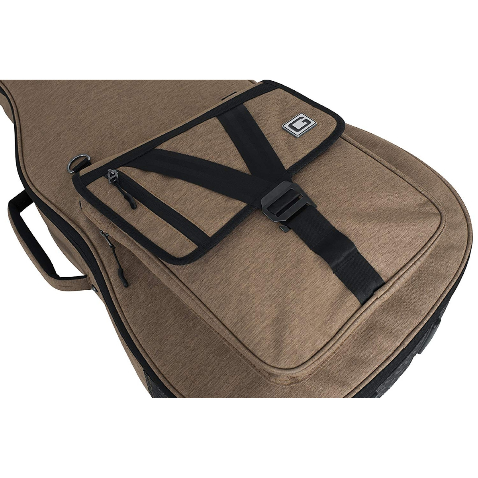 Чохол вирізняється функціональністю зовнішніх елементів. Велика фронтальна кишеня з блискавкою, клапаном, G-Hook-фіксатором та стропами дає змогу безпечно заповнити відділення аксесуарами – тюнером, нотами, ременем чи зарядними. Додаткова мала кишеня біля головки грифа забезпечує швидкий доступ до телефону, ключів чи дрібної електроніки. Прогумоване дно товстої структури захищає чохол від зношування, калюж та навіть випадково розлитих напоїв.
