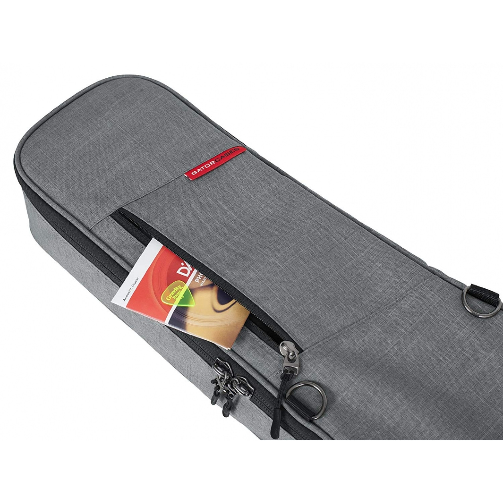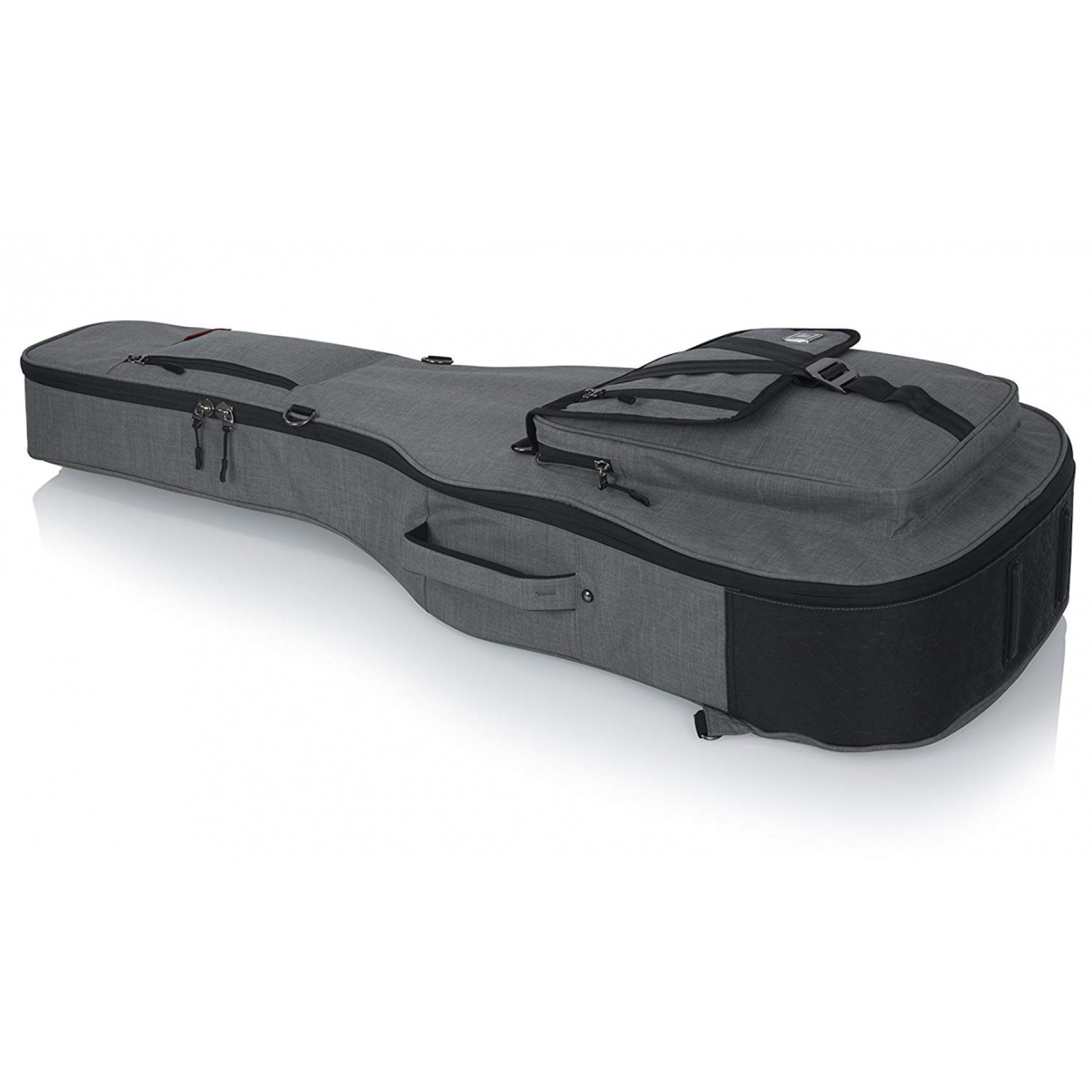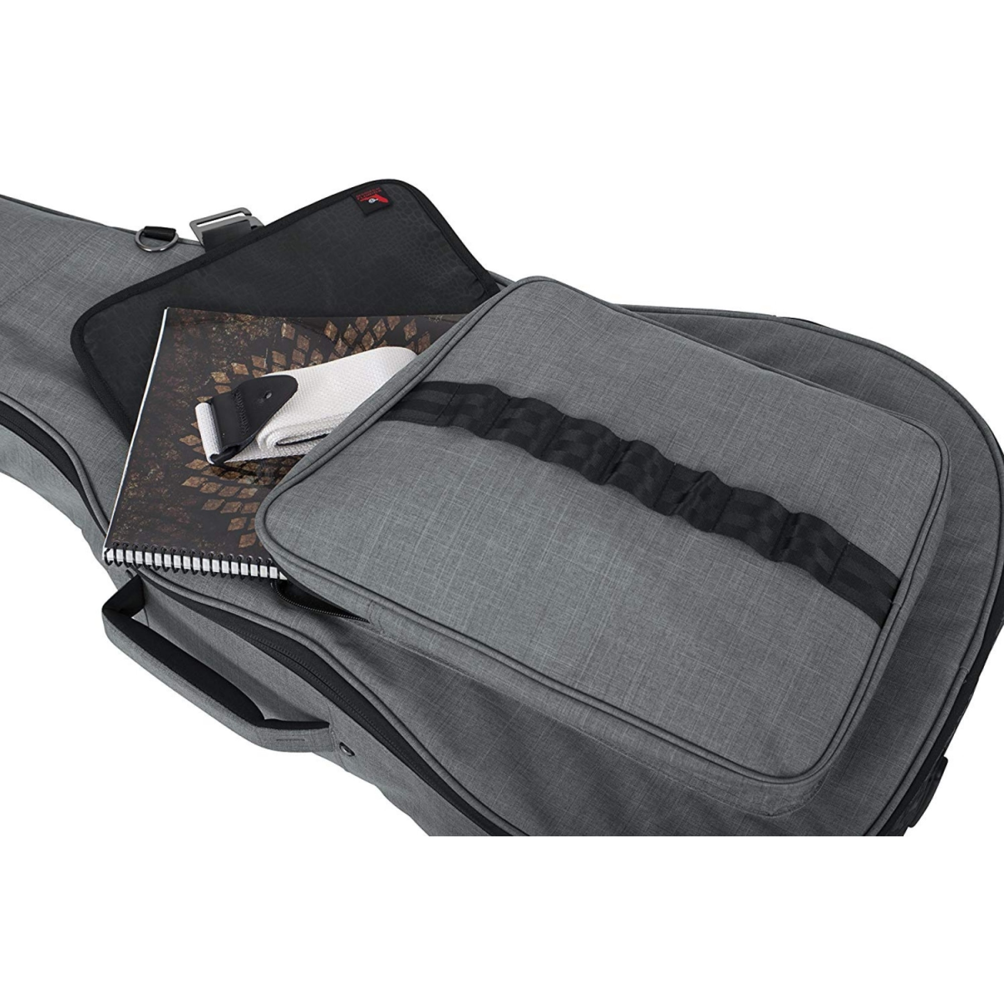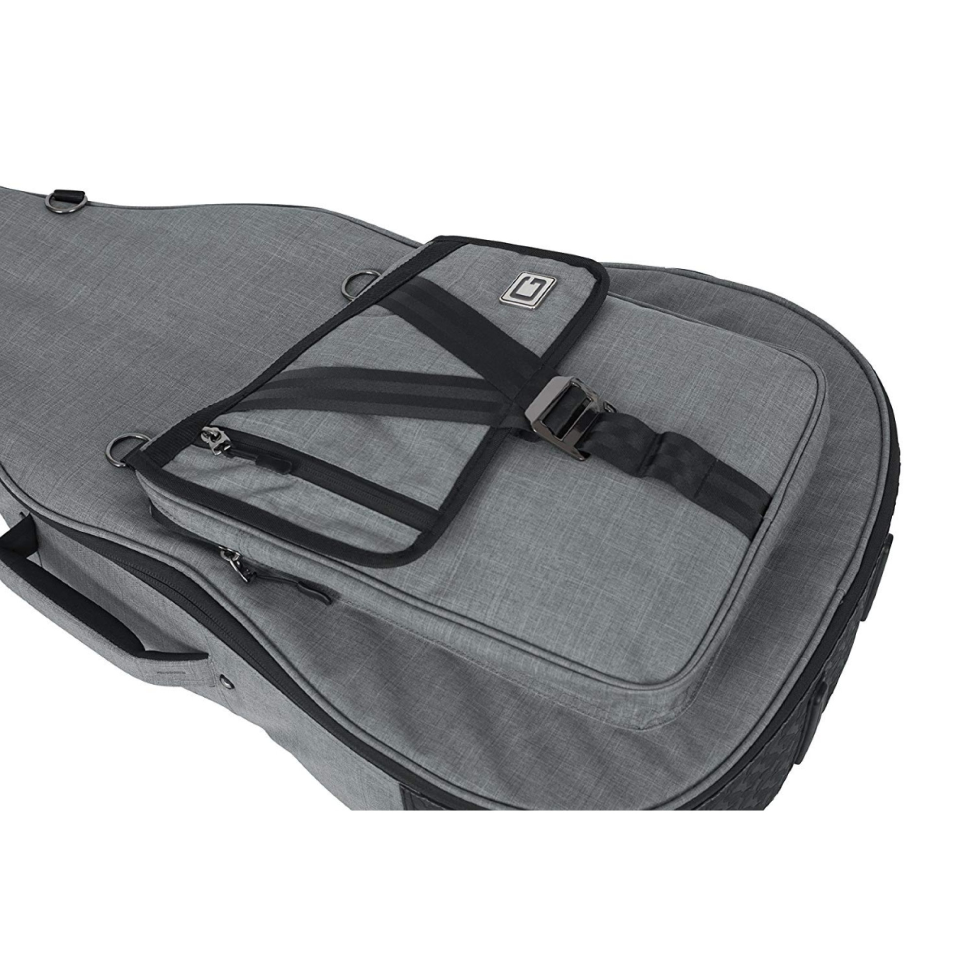 Особливої уваги заслуговує універсальна та знімна триточкова система внутрішніх ущільнювачів, яка надійно фіксує головку грифа, шию та нижній ендпін, запобігаючи зміщенню гітари під час транспортування. Для аксесуарів передбачена містка фронтальна кишеня з клапаном, фірмовою застібкою G-Hook і декількома точками фіксації, що дозволяє заповнювати її максимально та зберігати надійне закриття. Додаткова мала кишеня служить для швидкого доступу до смартфона, ключів чи дрібної електроніки.