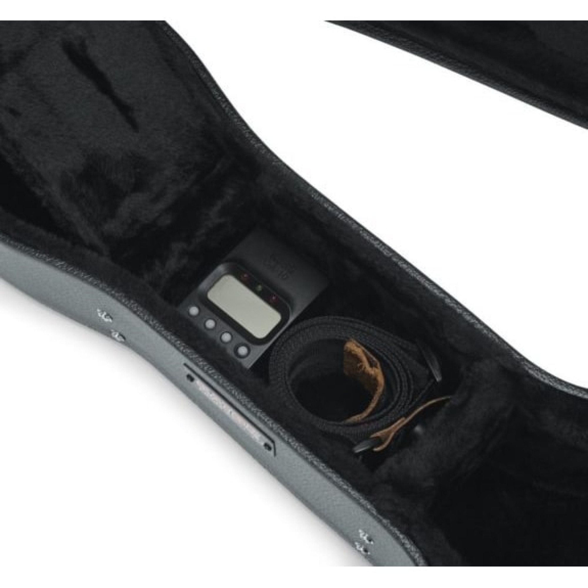 Практичність моделі доповнюється внутрішнім відсіком для аксесуарів, куди легко помістити струни, медіатори, тюнер або інші необхідні дрібниці. Кейс розроблений і підтримується командою Gator у США, що підтверджує високий стандарт якості та надійності кожного елемента.