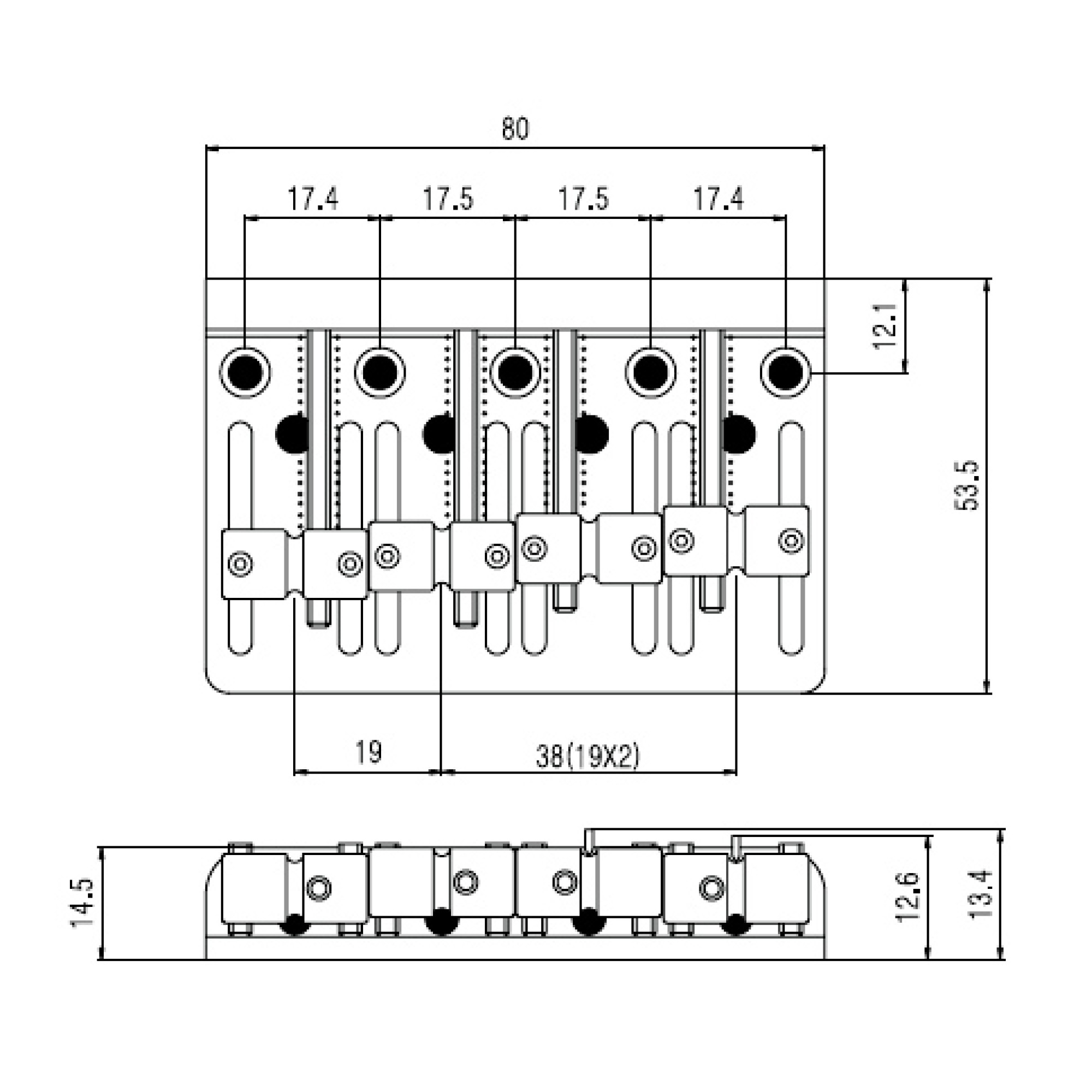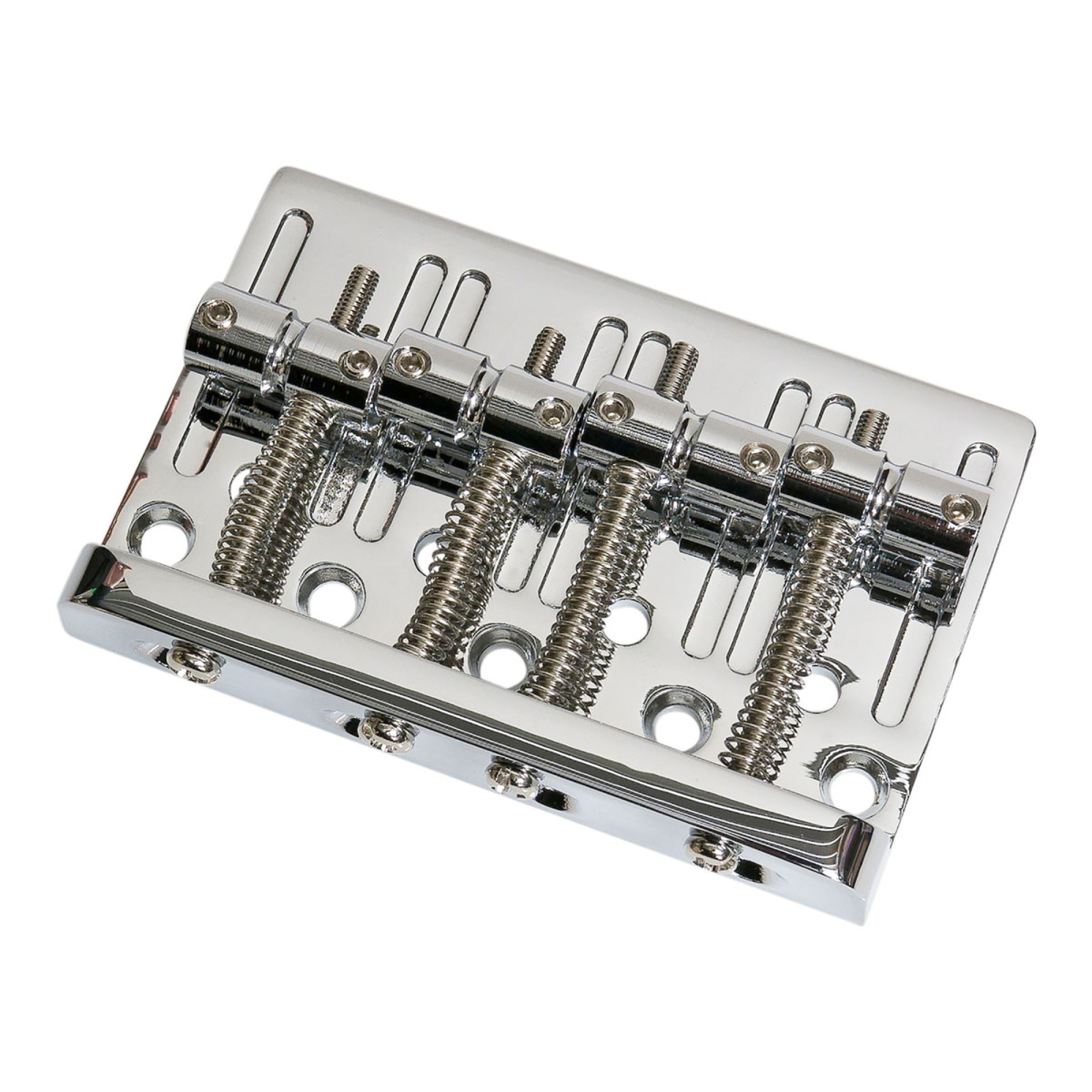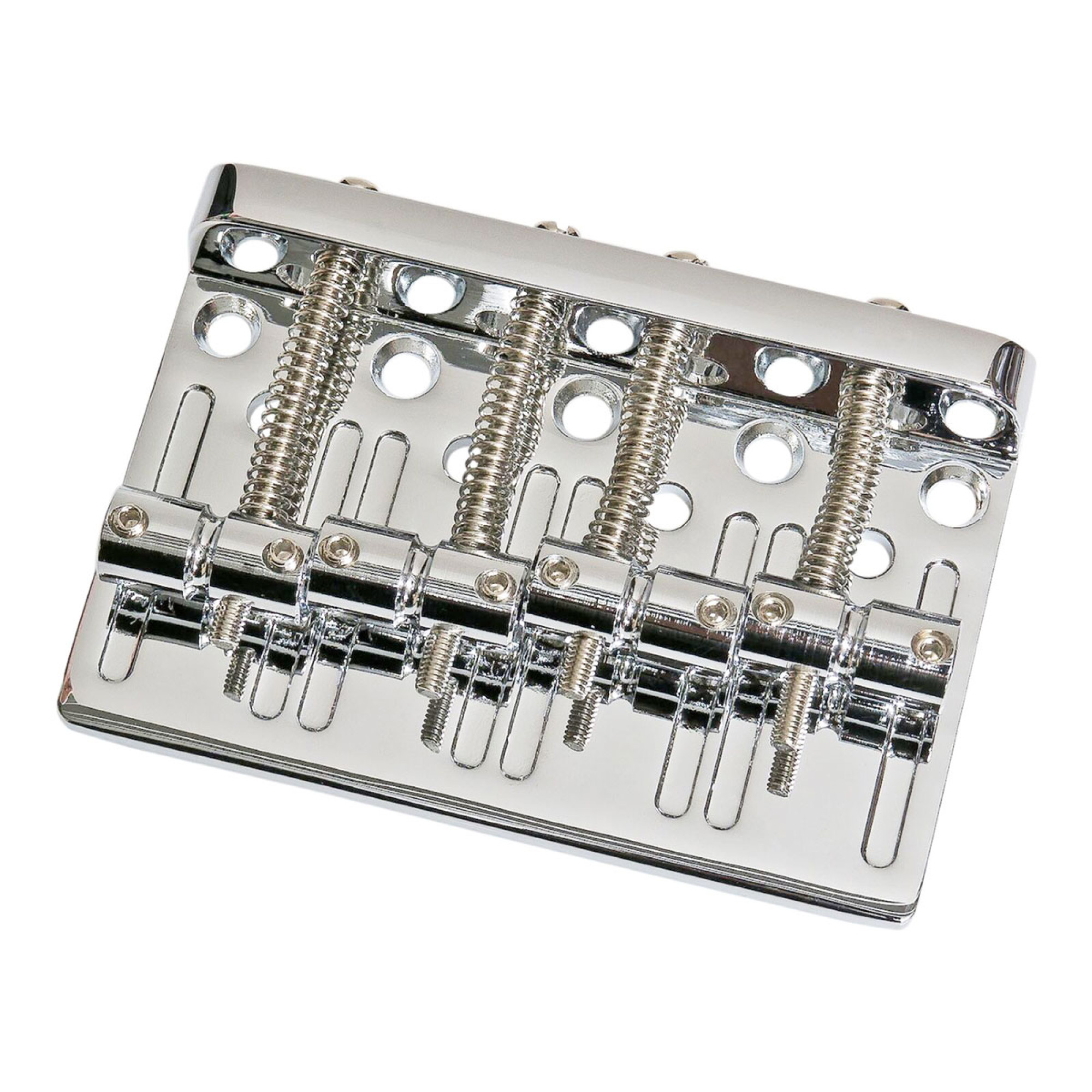 Бридж для 4-струнної бас-гітари, сідла з латуні, відстань між струнами 19мм, розміри 80х53.5мм, міжцентрову посадочних гвинтів 4х17.5мм, 5 посадочних гвинтів з кріпленням в корпус, 2 варіанти закріплення струн: на бриджі / крізь корпус.