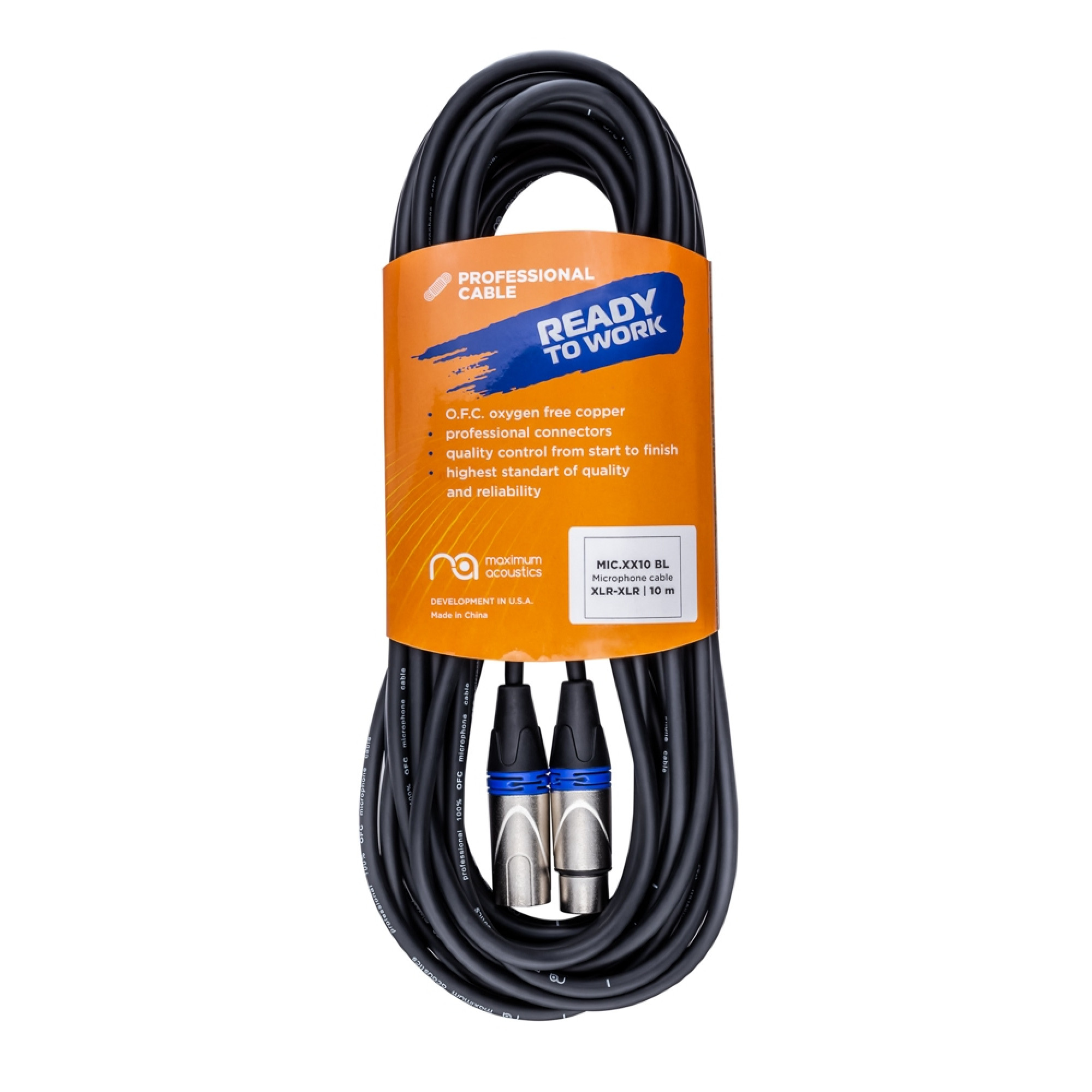 Професійний мікрофонний кабель від бренду Maximum Acoustics, виготовлений з 6 мм екранованого кабелю з використанням безкисневої міді (OFC) та оснащений конекторами XLR-male – XLR-female. Дана модель має довжину кабелю 10 м. Колір кабелю чорний, а маркувальних кілець конекторів – синій.