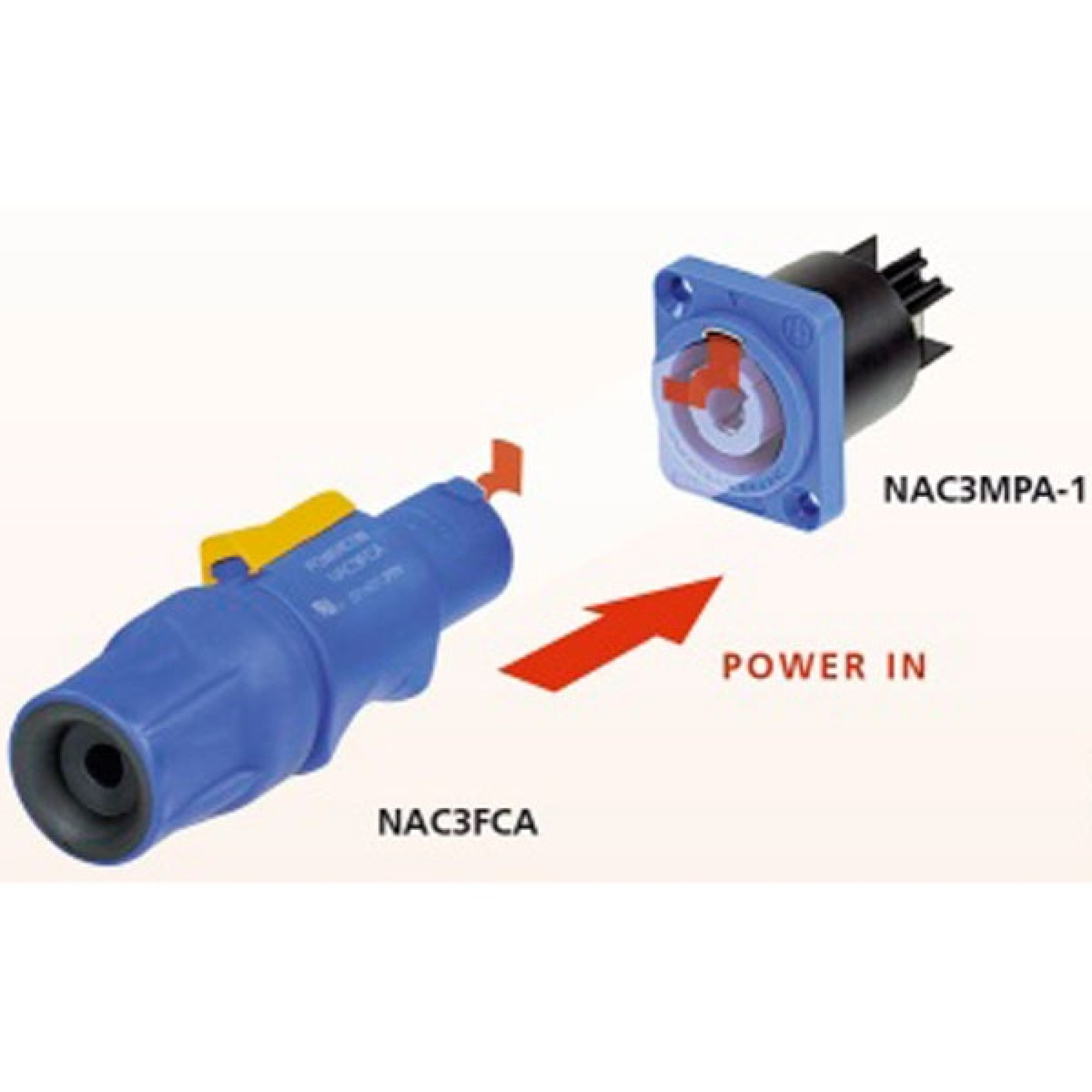 Професійний кабельний 3-контактний роз'єм живлення PowerCON тато. Роз'єм powerCON є спеціальним мережевим роз'ємом з замком має 3-контактне з'єднання високовольтних ліній для живлення потужних приладів. Є попередній заземлюючий контакт, замість під'єднується окремого заземлення на шасі приладу. Краща компоновка з міцним корпусом в поєднанні з фіксуючим механізмом необхідна для того, щоб гарантувати безпечне підключення до джерела живлення.