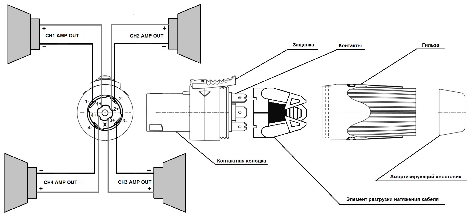 Типова конструкція і підключення 8-кабельних роз'ємів speakON