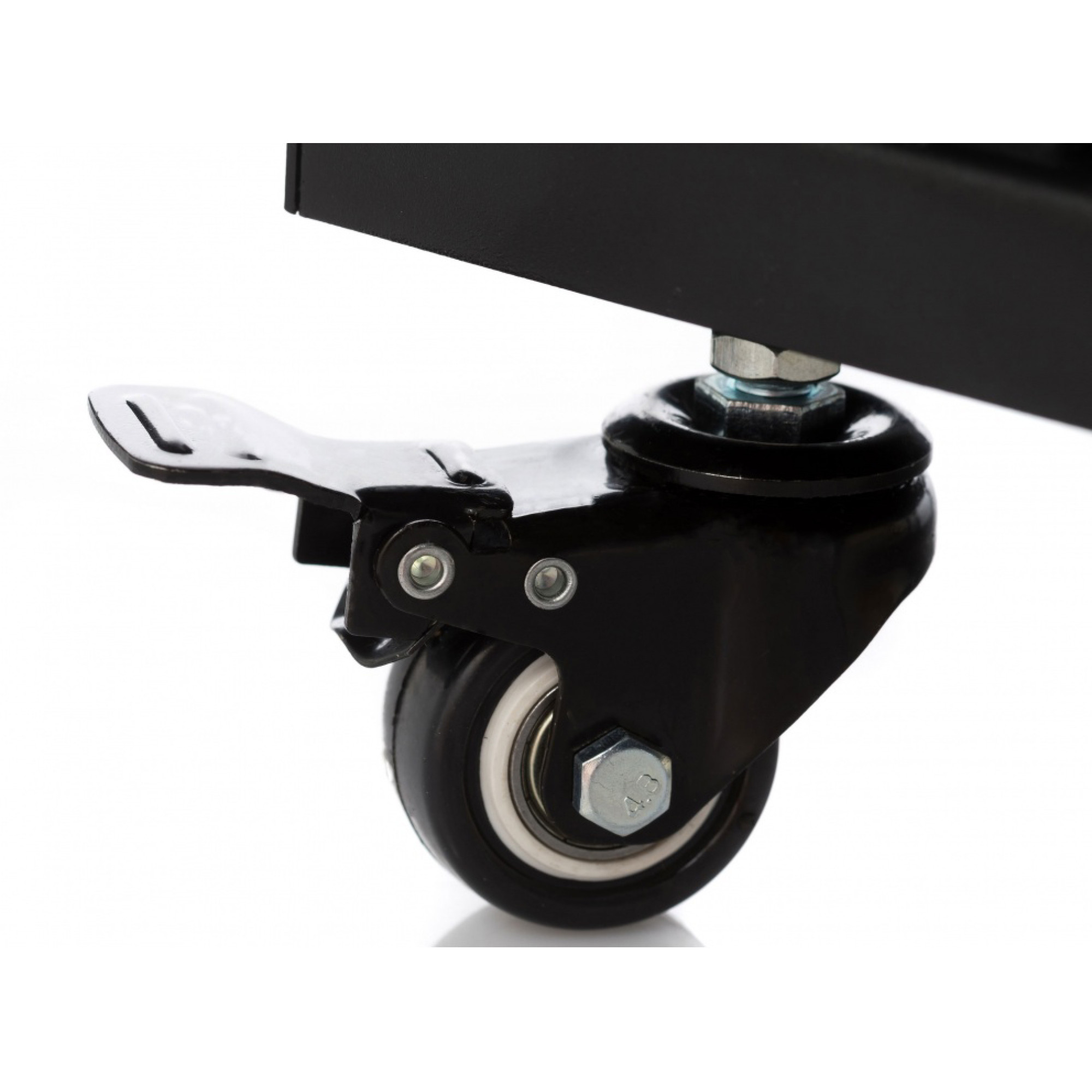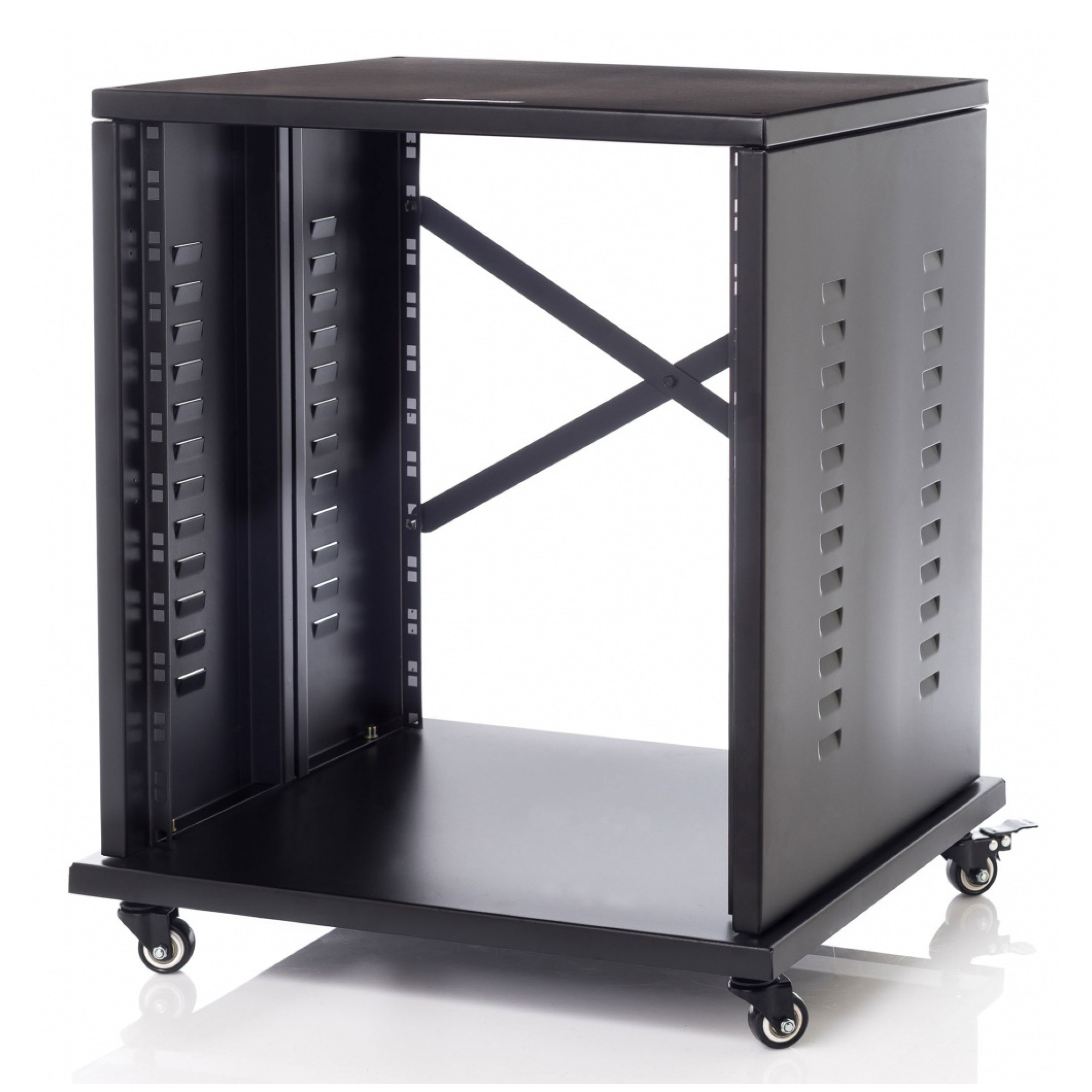 19-дюймова стійка на 12 осередків (12U). Виготовлена зі сталі. 4 ролики з блокуванням. Стабілізаційна планка у стилі X.