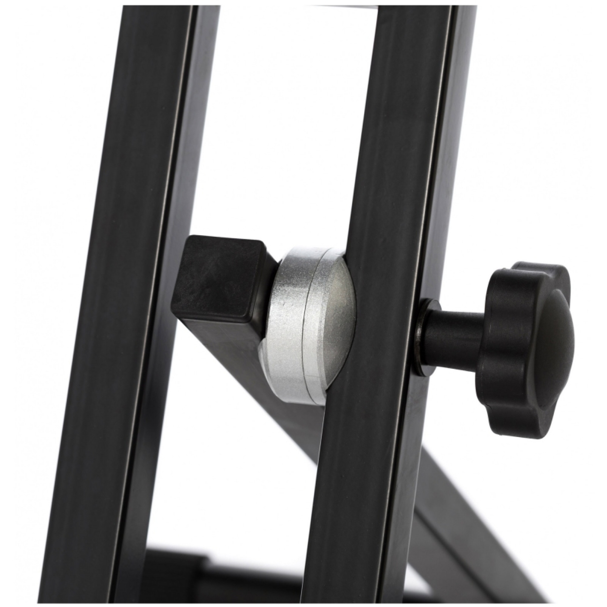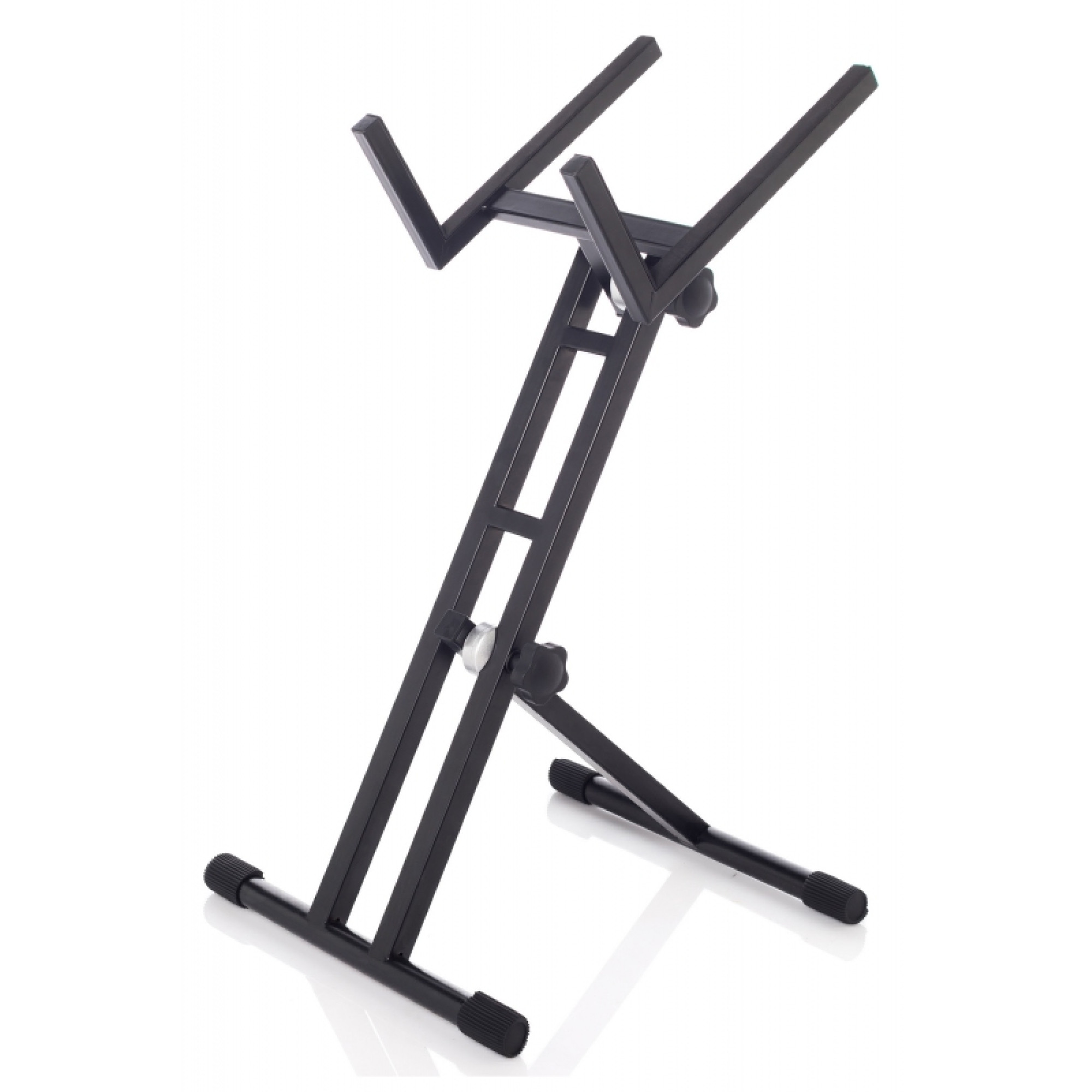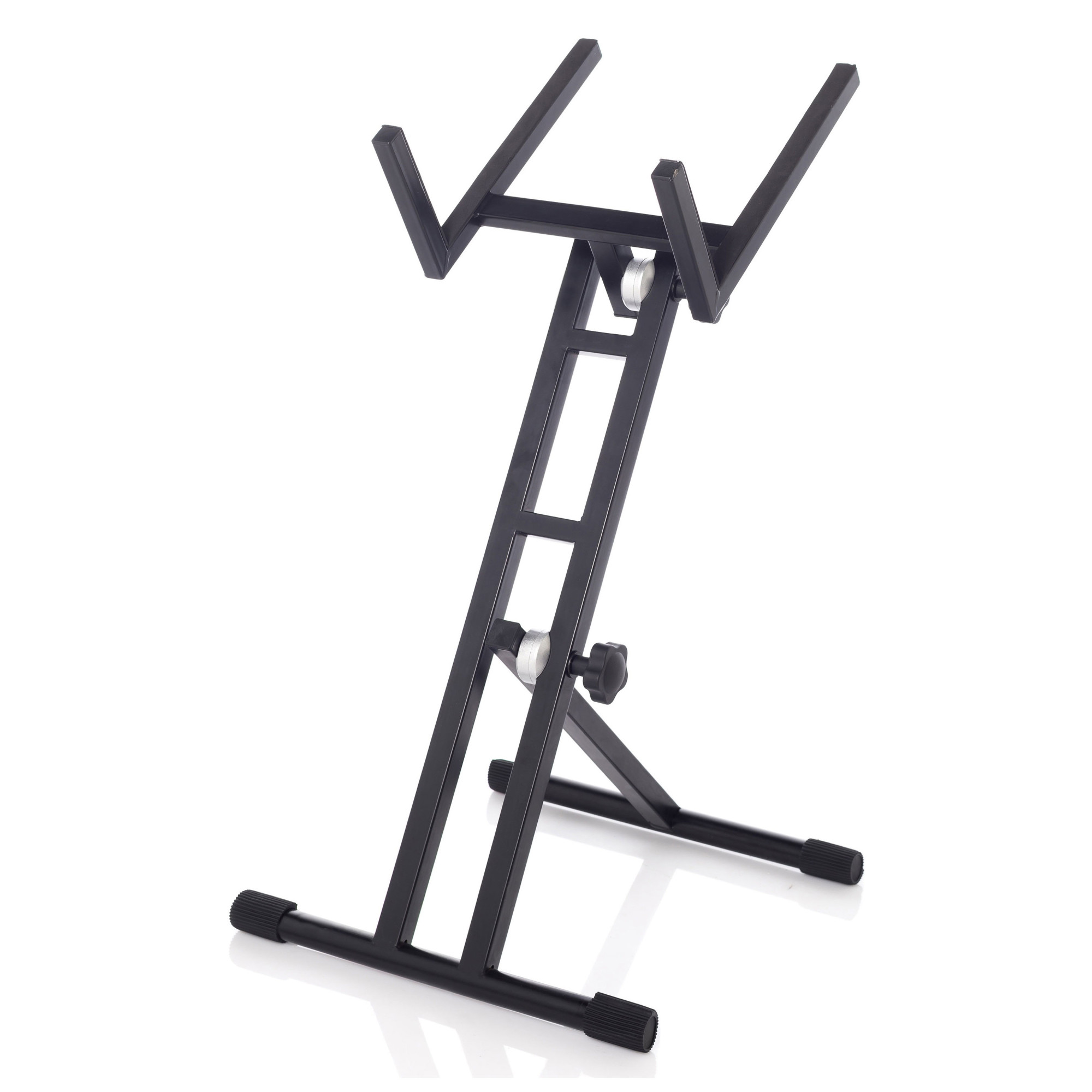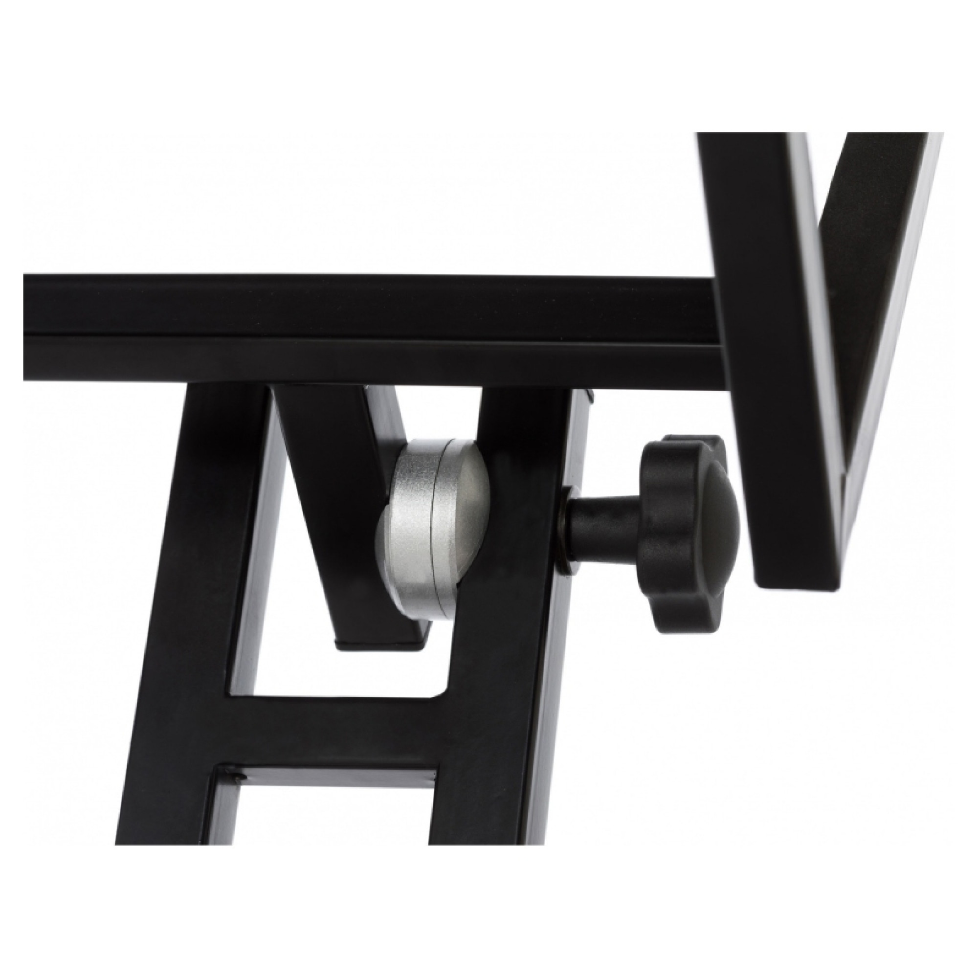 Металева стійка чорного кольору для звукового обладнання з можливістю регулюванням висоти та нахилу. Оснащена ніжками з гумовим покриттям для протистояння ковзанню.