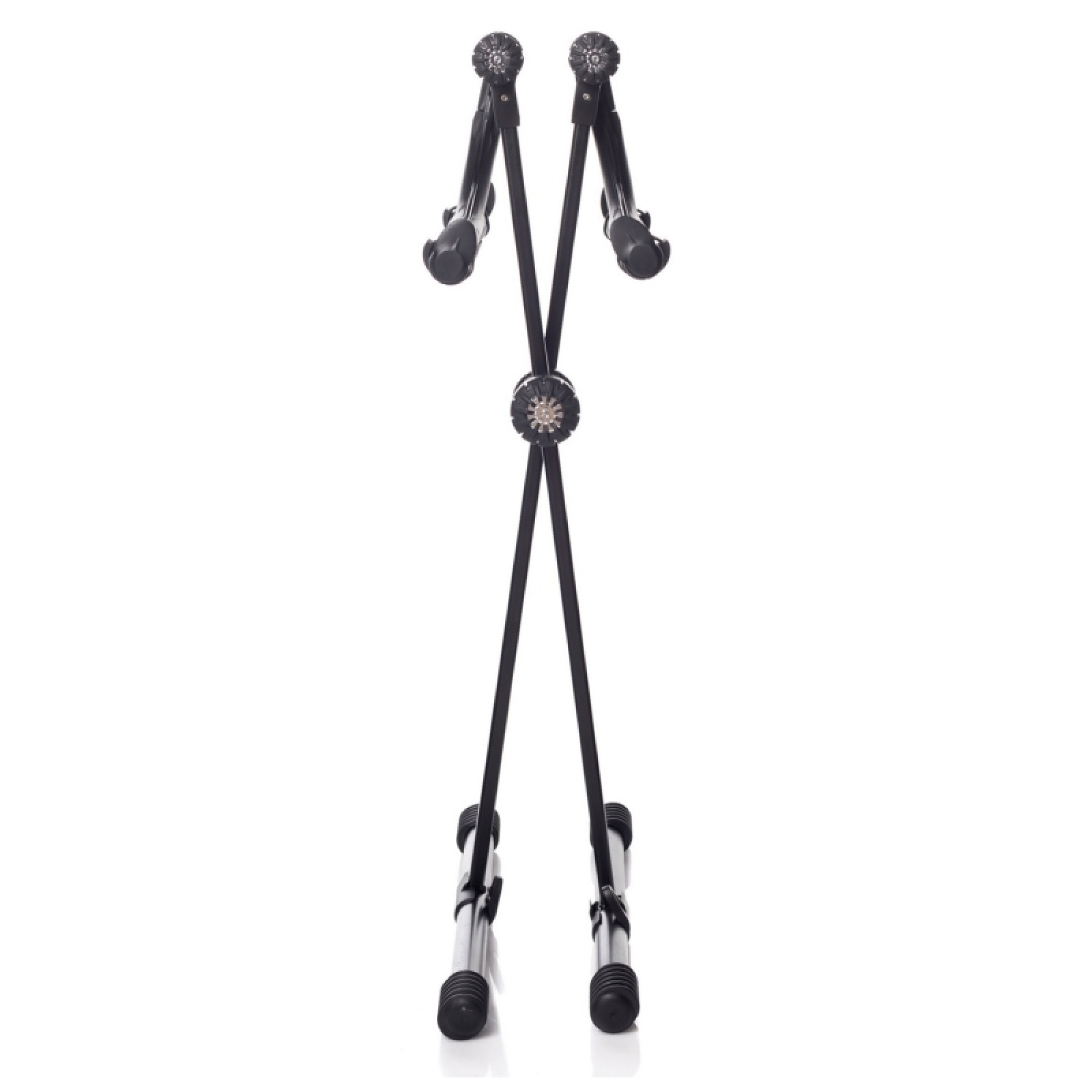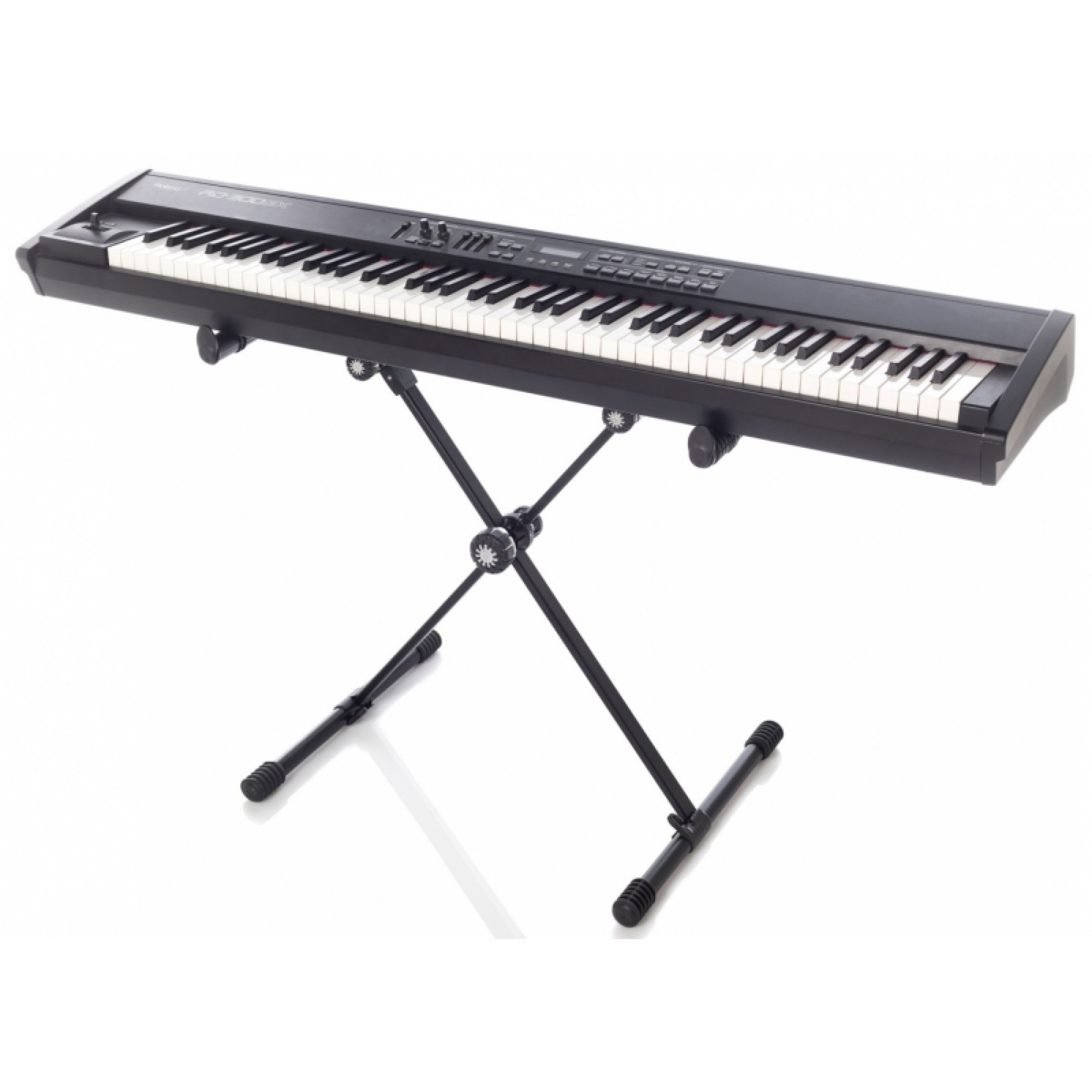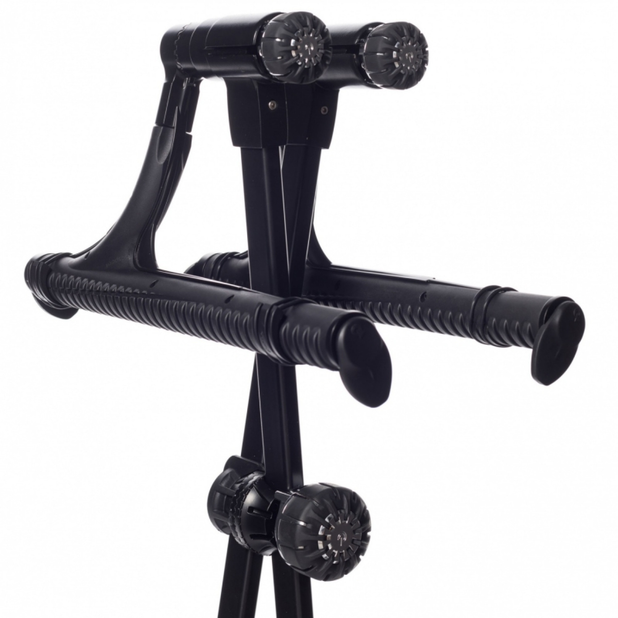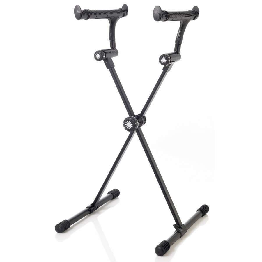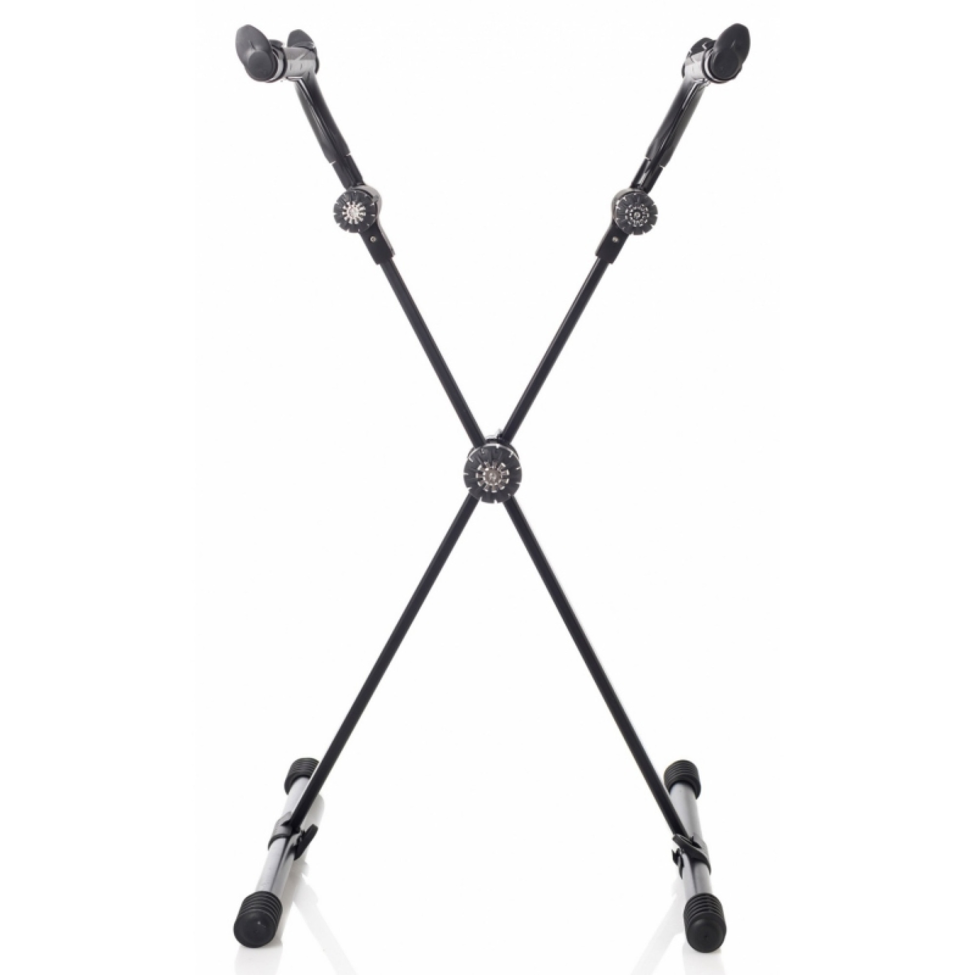 Перша в світі стійка для клавішних з незалежним регулюванням верхньої і нижньої частин: підходить для будь-якого доступного простору. Вона може утримувати важкі клавіатури, такі як електричні піаніно, а також невеликі портативні пристрої. Виготовлена зі сталевих труб 30x15x1,5 мм з епоксидним порошковим покриттям. Центральне і верхнє з'єднання з алюмінієвого сплаву з системою крокодилів для регулювання розкриття стійки. Всі ручки виконані з хромованого цинкового сплаву з гумовим покриттям. Верхні плечі зроблені з сердечником зі сплаву цинку і з нейлоновим зовнішнім покриттям. Обертові гумові блоки для розміщення і вирівнювання клавіатури. Повністю складна, щоб займати мінімальний простір.