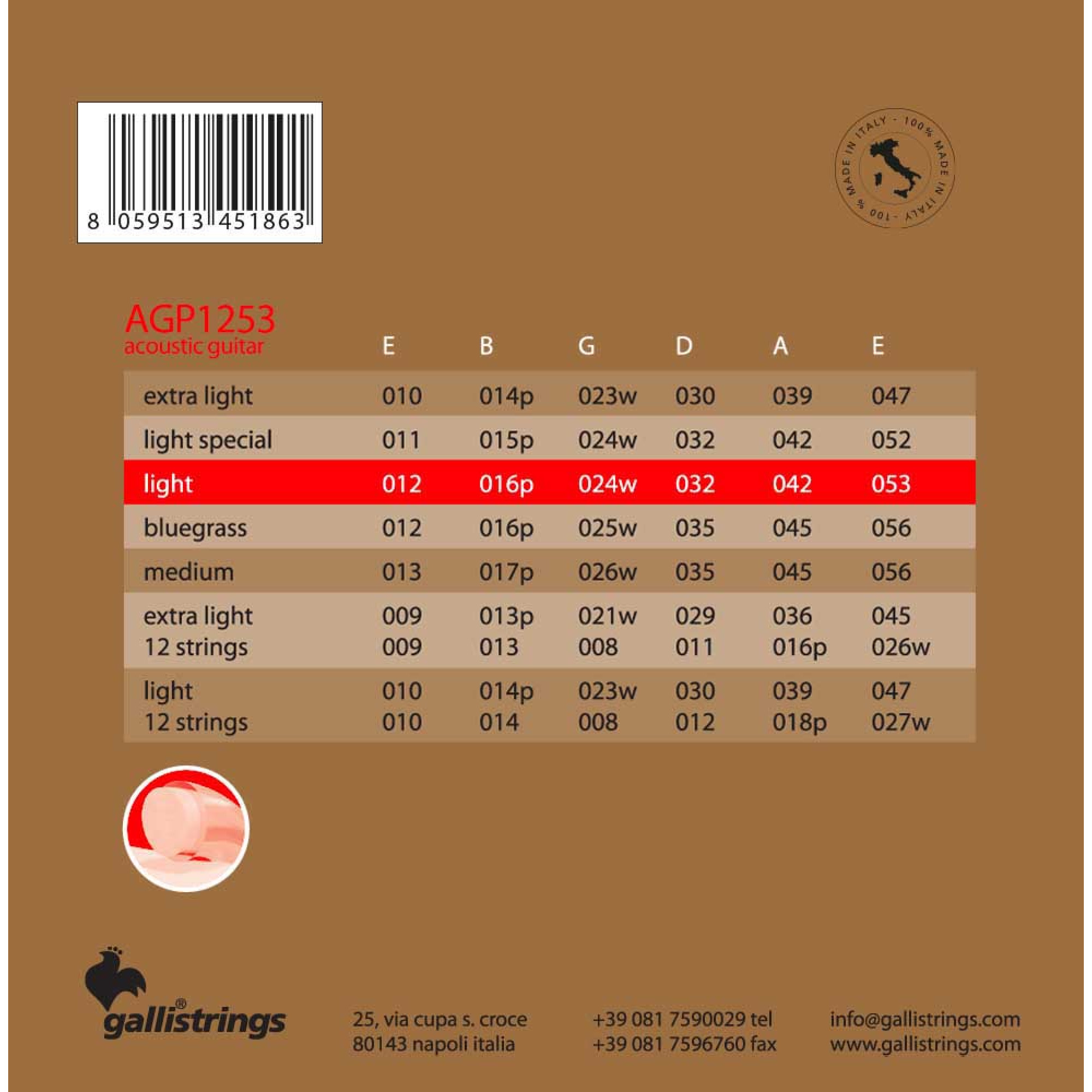 Комплект Galli® Strings AGP1253 LIGHT із 6 струн, легкого натягу, матеріал фосфорна бронза, калібр .012 - .053 PROCOATED.