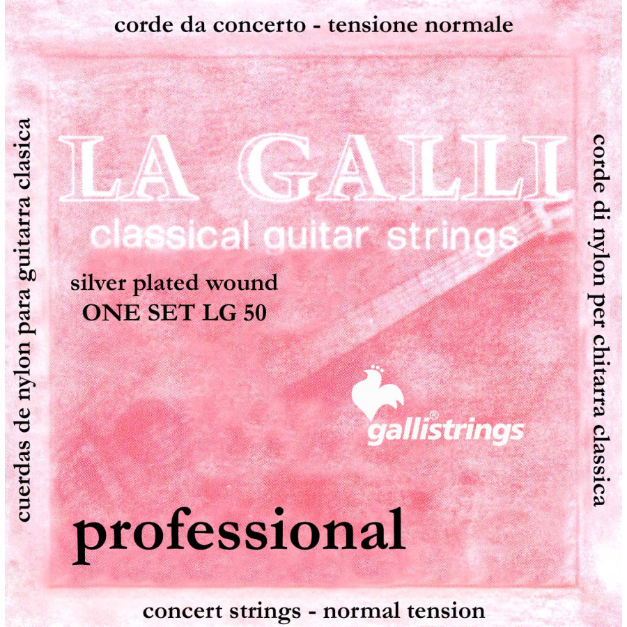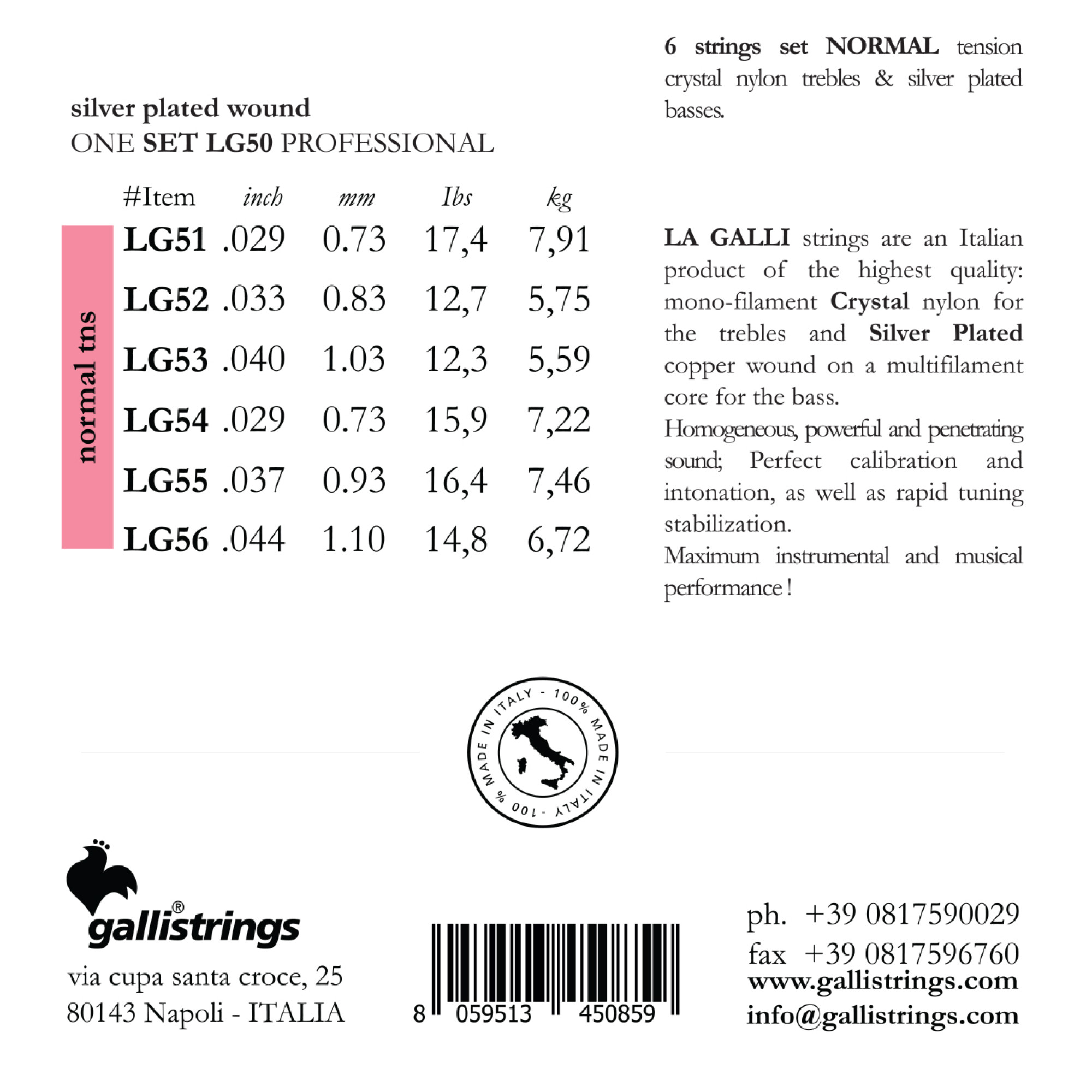 Gallistrings LG50 NORMAL — комплект струн для класичної гітари середнього натягу. Верхні струни виготовлені з моноволокна білого нейлону, що забезпечує чіткість і чистоту звучання. Басові струни мають посріблену мідну обмотку на багатоволоконному сердечнику, що додає звуку глибину та насиченість. Ці струни поєднують високу міцність і відмінну звукову якість, ідеальні для гравців середнього рівня.