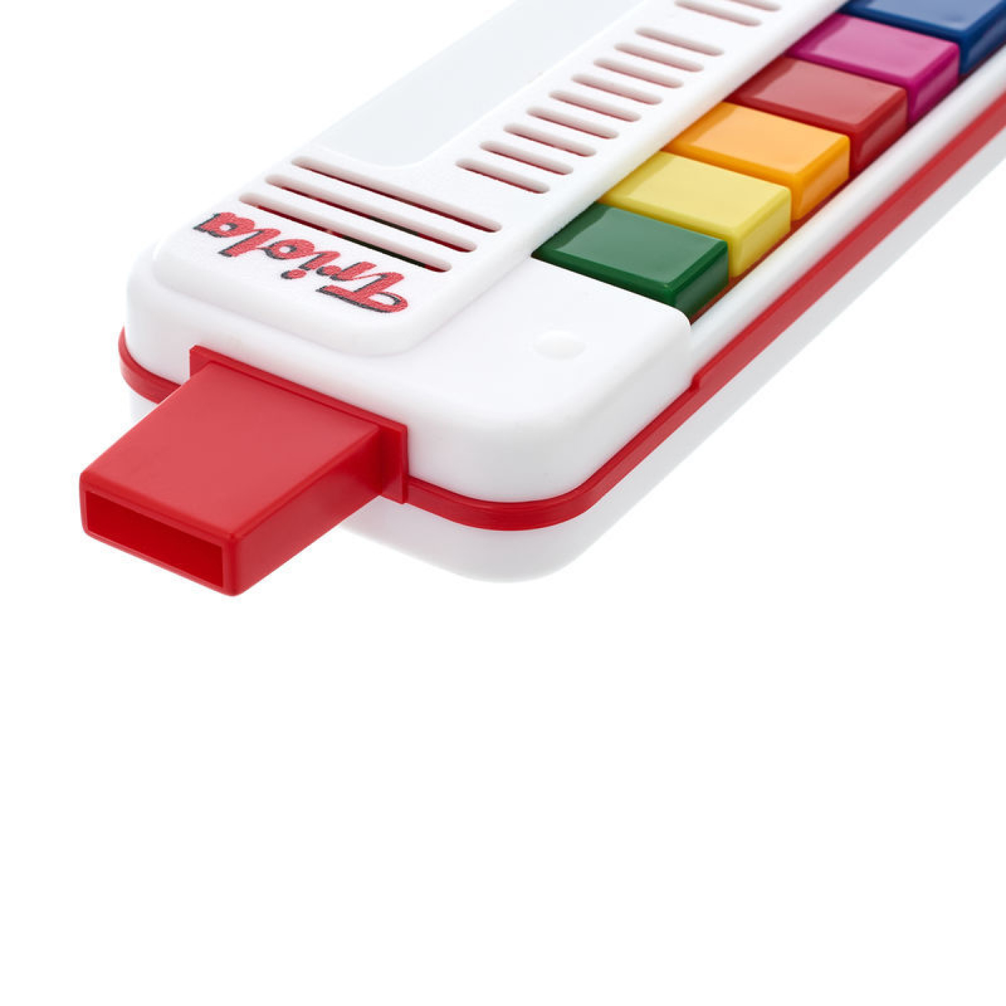 Triola - це кольорове введення в музику для дітей. Грати на цьому інструменті дуже легко - просто дуйте в мундштук і натискайте кольорові клавіші, відповідно до розфарбованих нот (в комплекті) улюблених дитячих пісень. Завдяки цьому діти граючись навчаються читати ноти з листа.