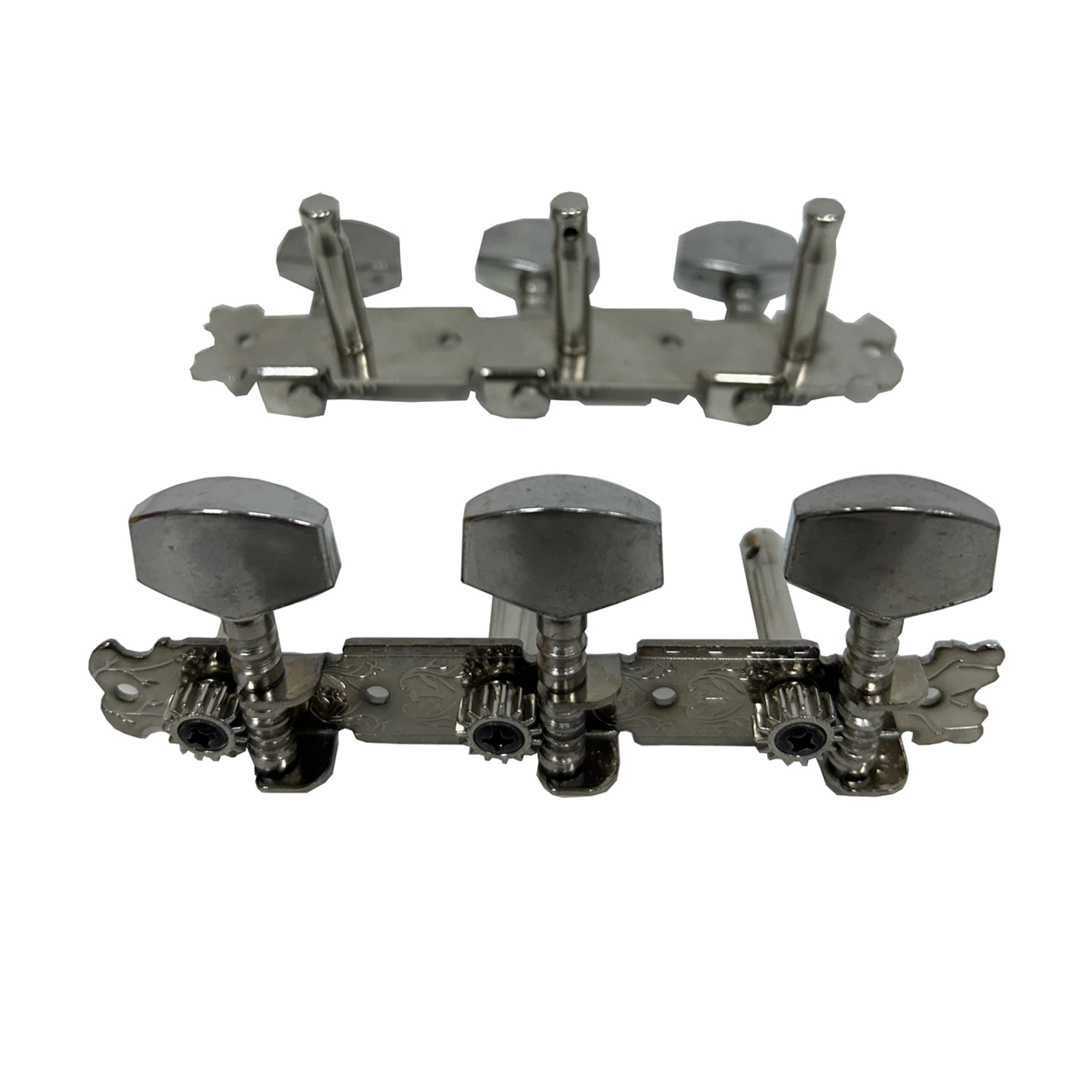 Tuning Mechanics on a bar for a 6-string acoustic or classical guitar are an important component of the guitar, responsible for transmitting sound vibrations from the strings to the guitar body. These pegs are made of metal and chrome plated, which not only gives them an aesthetic appearance, but also provides protection against corrosion, increasing the duration of their use. Metal chrome tuners are very popular among guitarists of all skill levels as they can suit the needs of both beginners and experienced players.