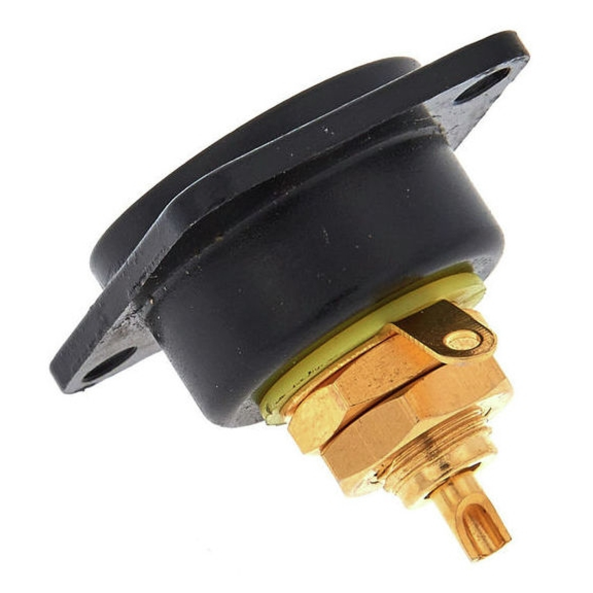 Phono socket in black chrome D-shape housing, yellow isolation washers, solder version.