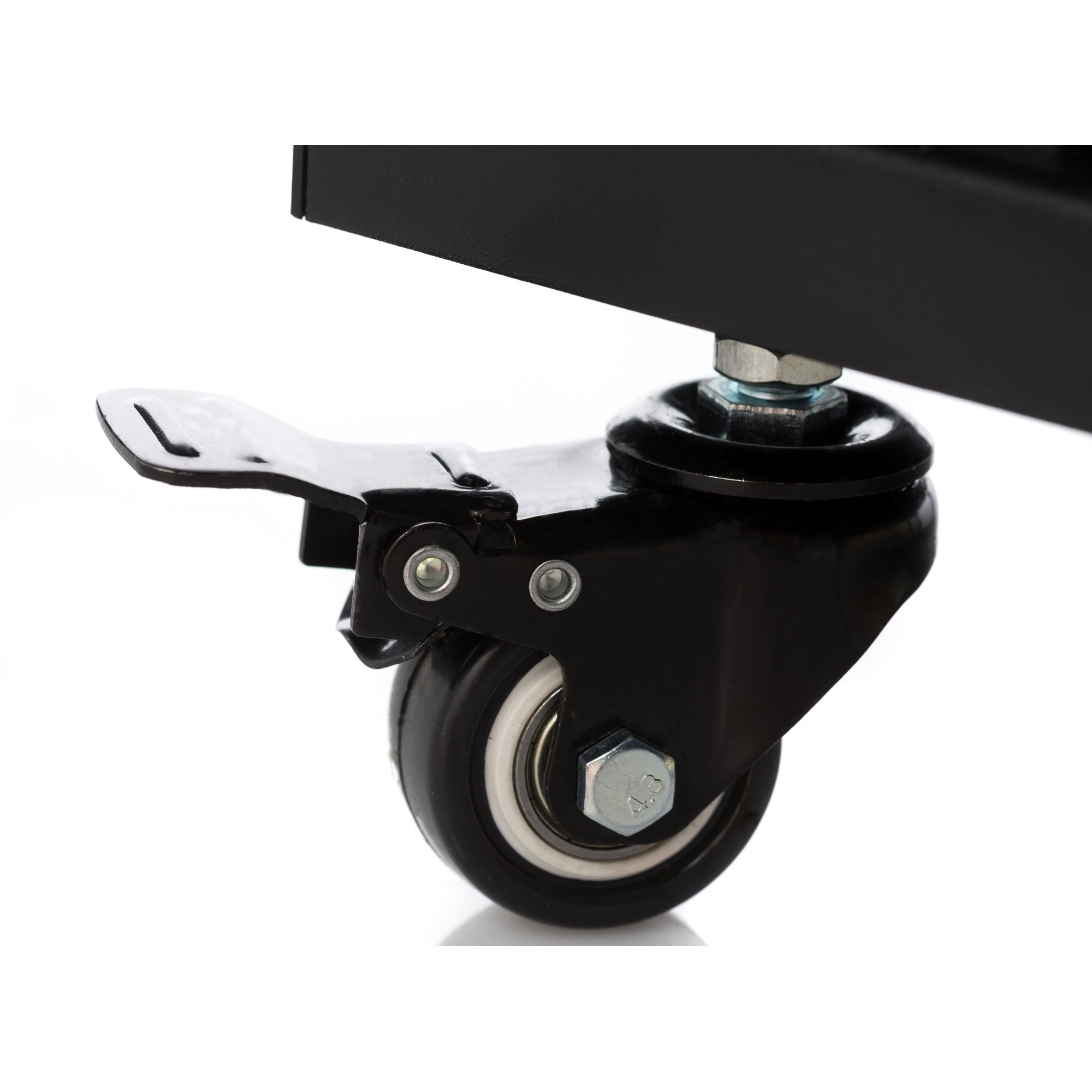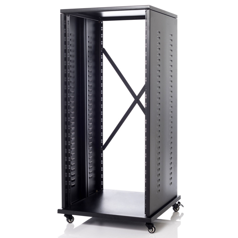 19" rack with 24 cells (24U). Made of steel. 4 casters with locking. X style stabilization bar.