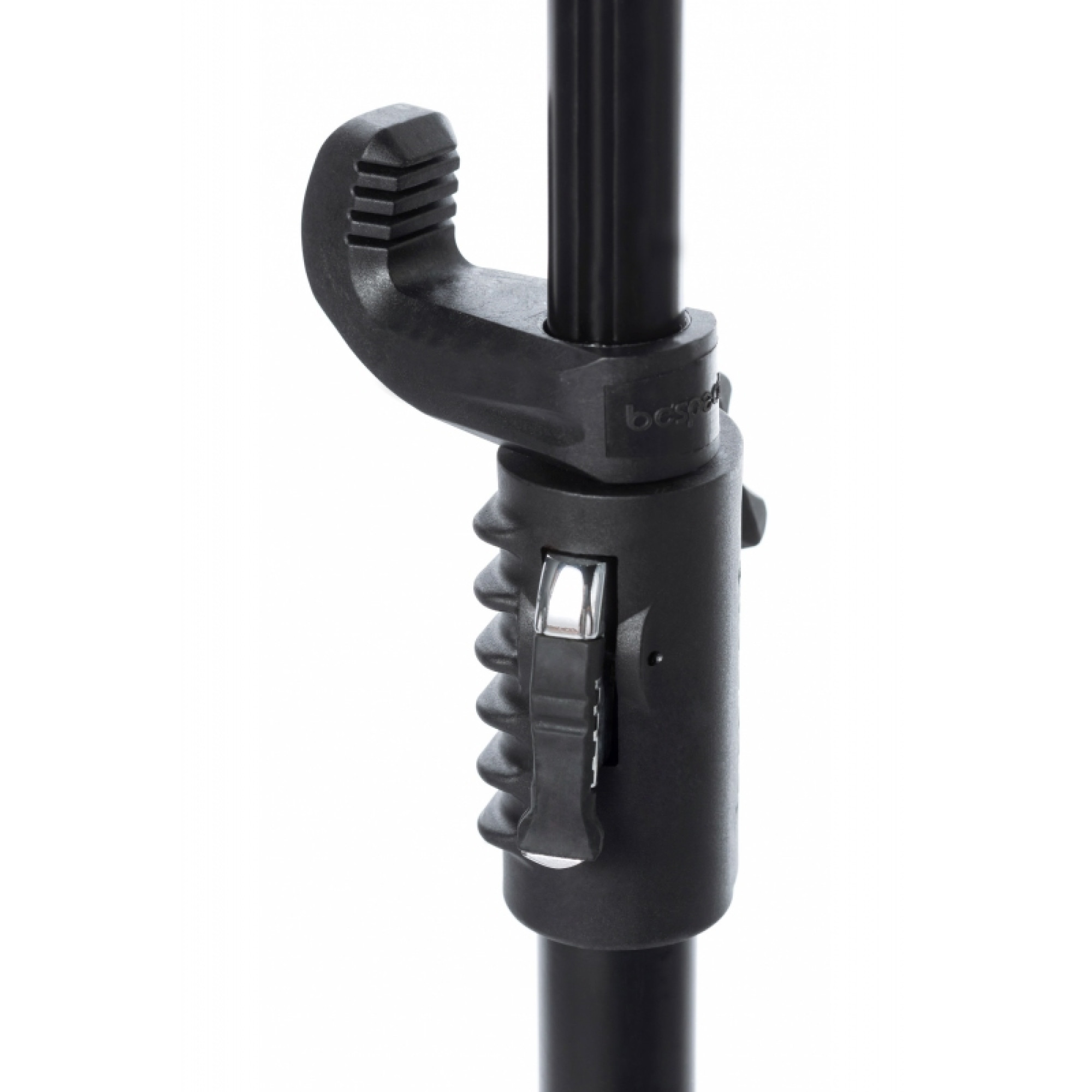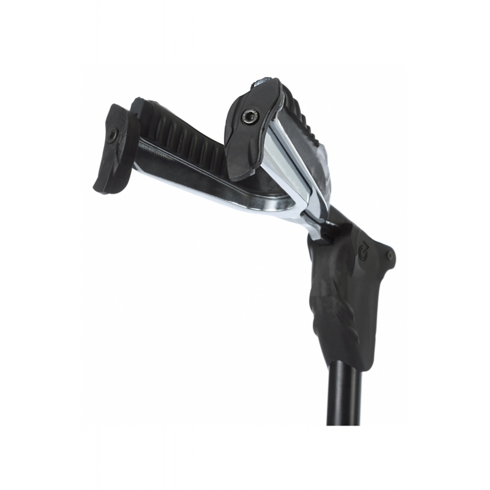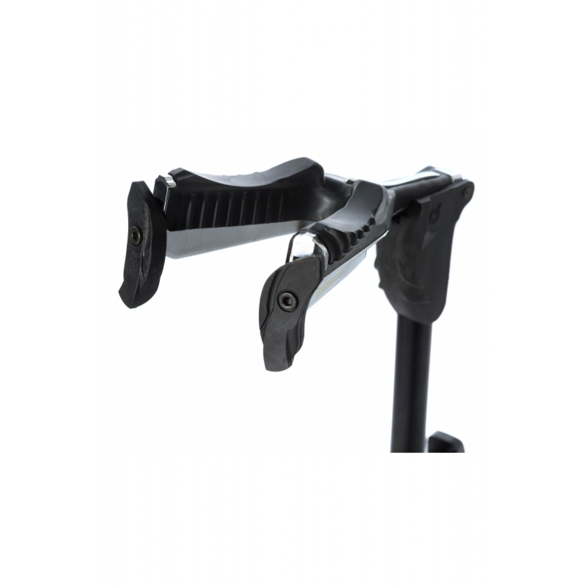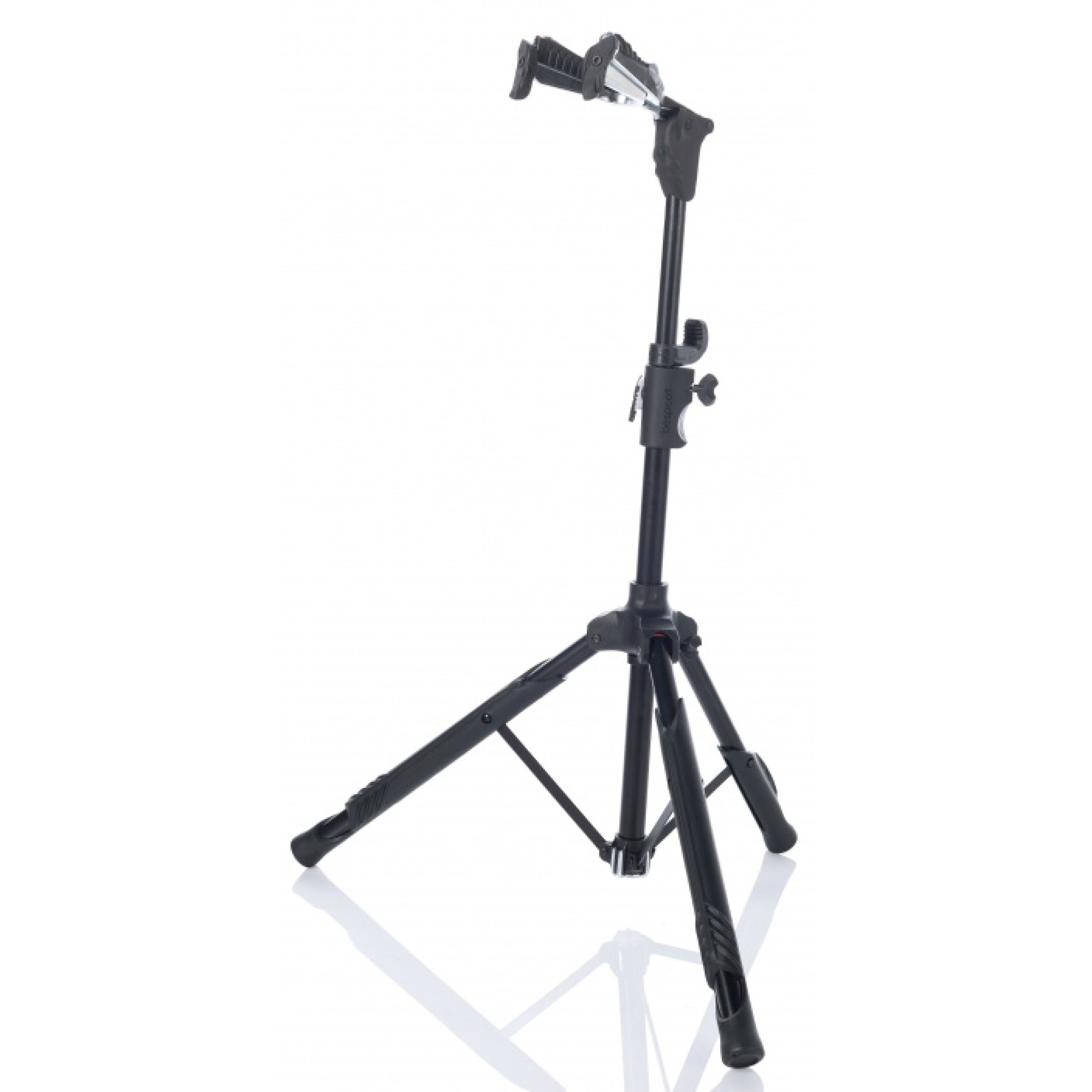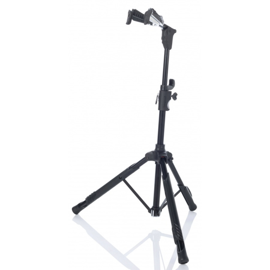 Universal guitar stand with automatic fixation of the neck. The design is made of chrome-plated zinc alloy, covered with soft natural rubber, providing strength to the rack and at the same time protects the guitar surface from damage. The lower support of the deck is also covered with natural rubber and has connectors for fixing the mediators. Adjusting the height of the rack is carried out using a mechanism with a metal rod.