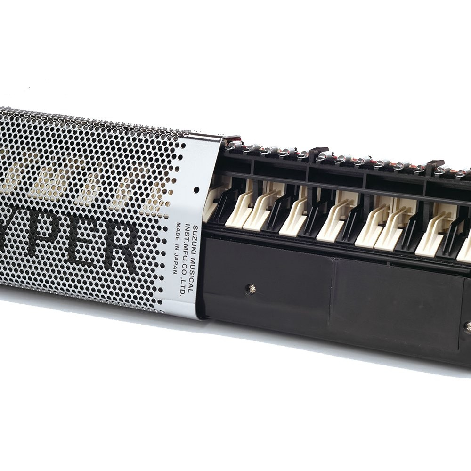 The newest member of the Hammond-Suzuki Melodion family is the 44HP or “High-Power” model. Taking the 44 a step beyond, the 44HP has new reeds that give a brighter, louder sound. The perforated body allows more sound to escape, making this model perfect for electric band use. Like the 44, the 44HP has a built-in microphone, however this deluxe Melodion is the first to sport a 44-note keyboard and a built-in microphone with volume control. Its strong yet lightweight construction is built to last, like any Hammond. Its tone is warm and deep, from the phosphor bronze reeds.
