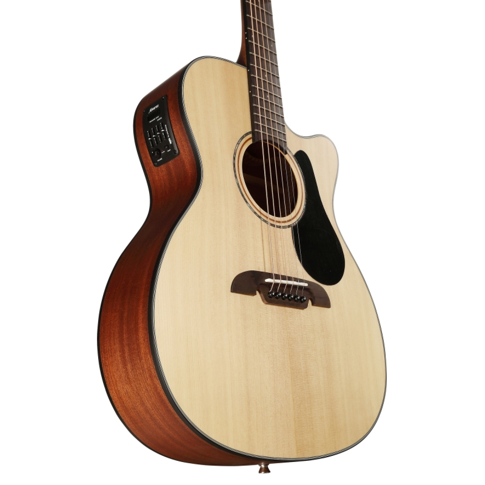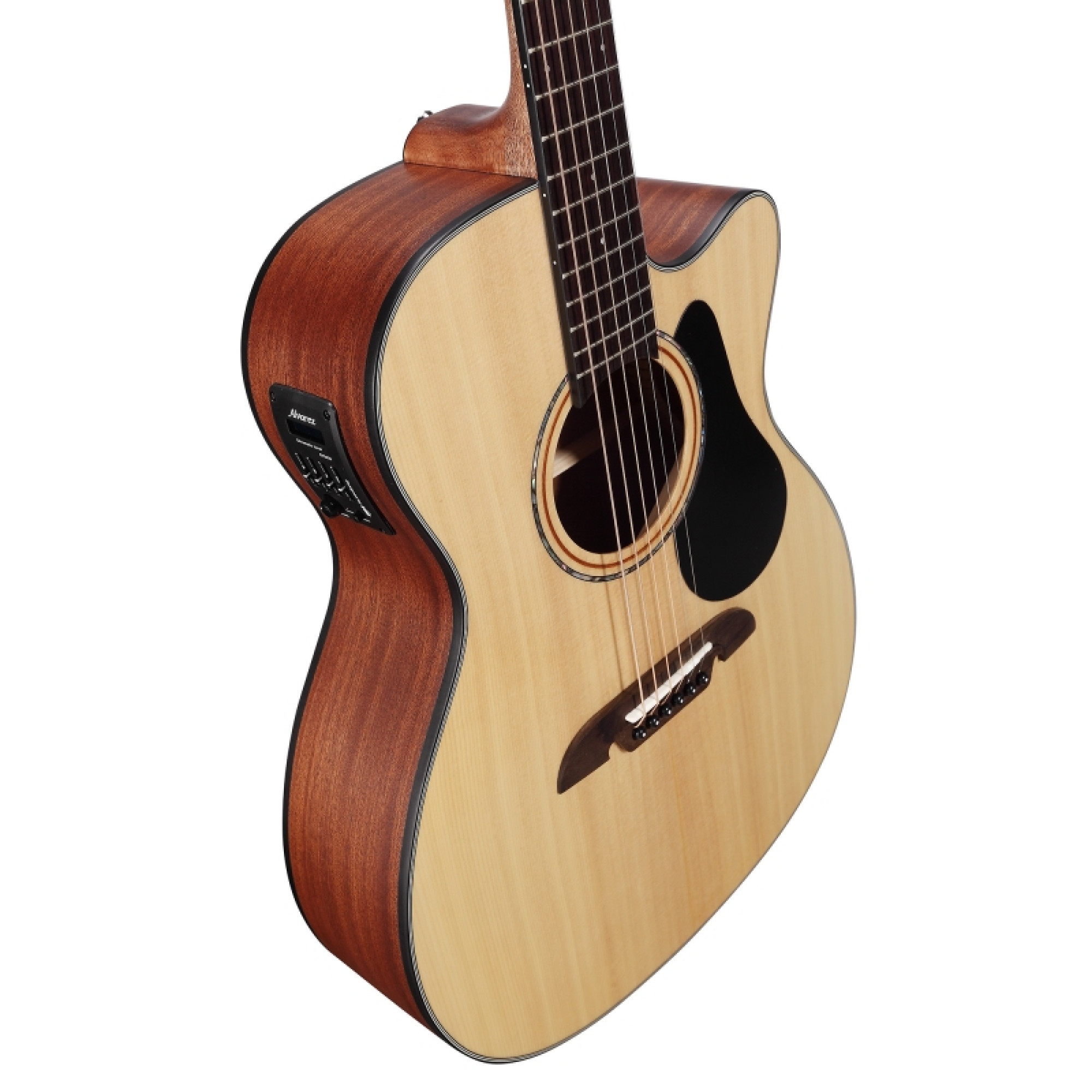 The Alvarez AF30CE is a Folk/OM electro-acoustic guitar that combines elegance, comfortable playability, and rich tone. It is part of the 30th Artist Series and offers a quality rarely seen in the entry-level price range. The solid Sichuan A spruce top delivers a bright, open tone, while the African mahogany body adds warmth and natural depth to the sound. The semi-gloss finish allows the instrument to breathe and resonate freely, which improves the overall sound dynamics.