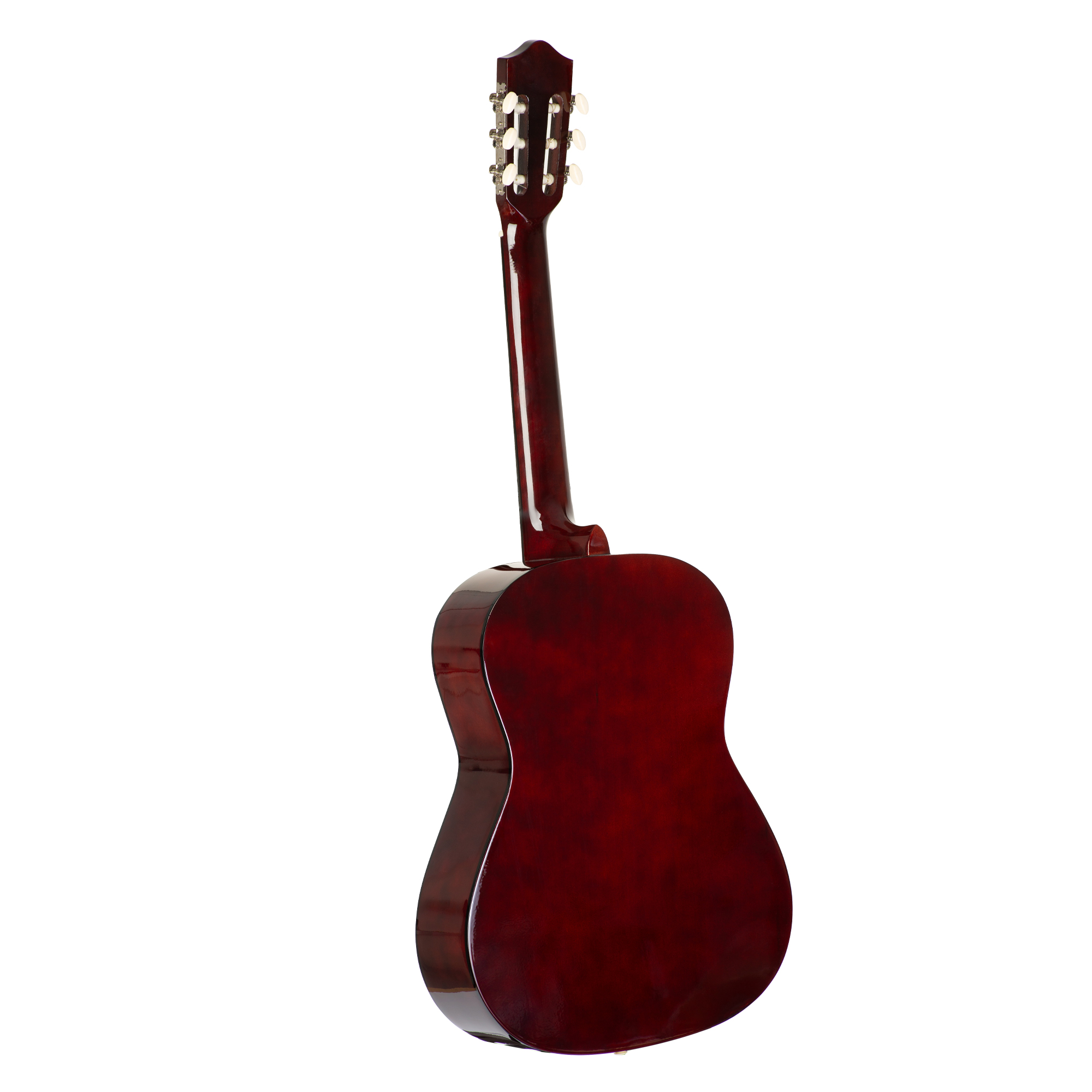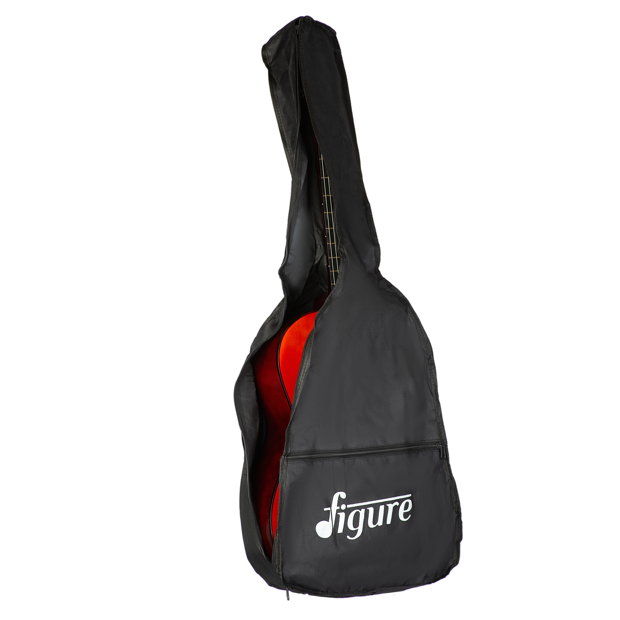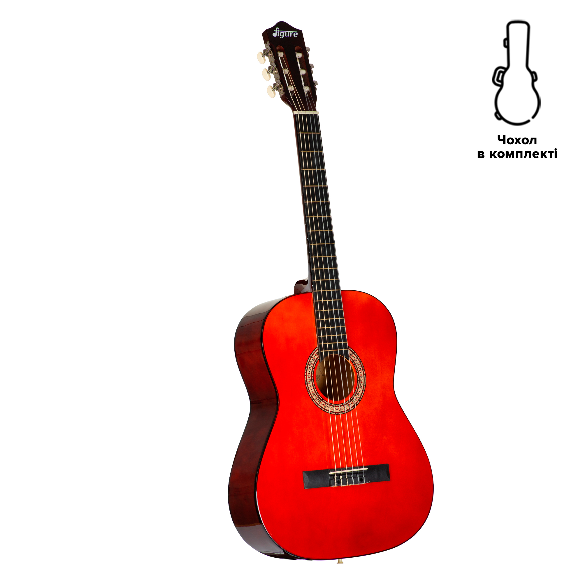 Figure 104OR is a six-string classical guitar with a linden body. Linden is a very light and fairly soft wood, which provides a good balanced sound. Nylon strings are thicker and qualitatively soft. The tension is low, and the fingers feel very comfortable. The mirror varnish gives the guitar a more ornate look. The gig bag is included. The 104 series is available in three colors – ginger, black and natural.