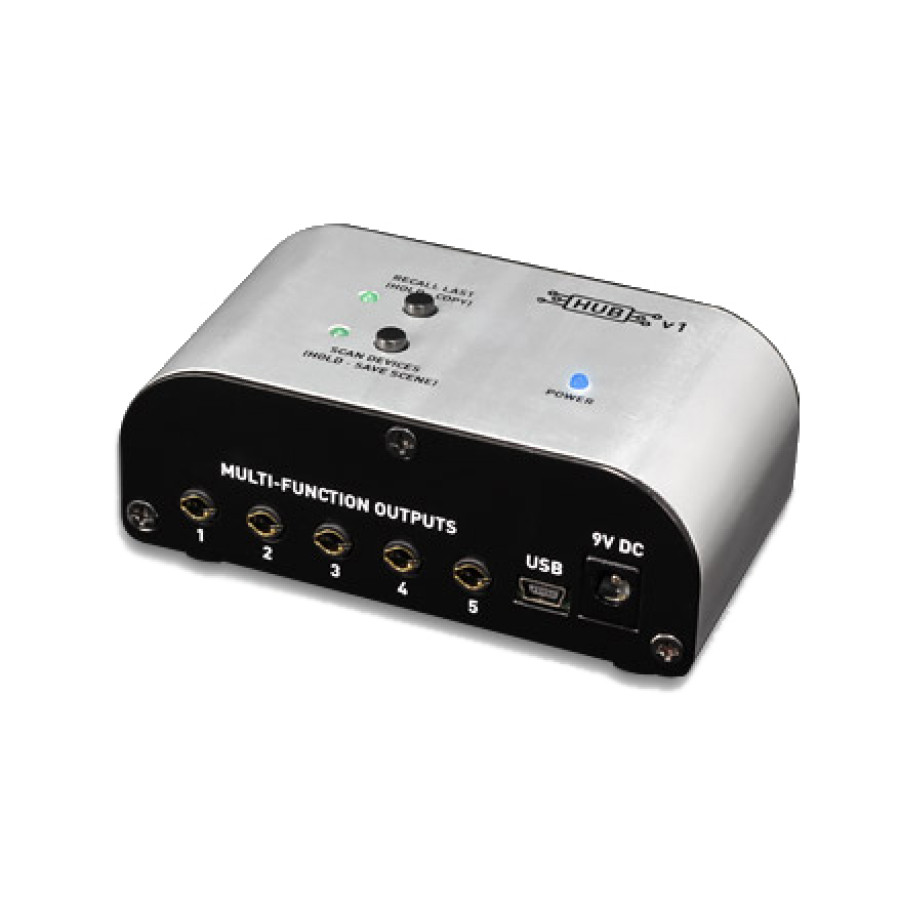 The Hub’s connections include standard 5-pin MIDI IN, MIDI OUT/THRU, passive “TRS” expression pedal input, a Hot Hand Sensor Input, mini USB port, and 5 Multi-Function outputs. Connect the Dual Expression Pedal and the Hot Hand Wireless Effect Controller to the Hub and assign external control to any pedal on your board. Each scene can contain any number of external control configurations, including simultaneous Hot Hand and Expression Pedal control of multiple parameters on multiple pedals.