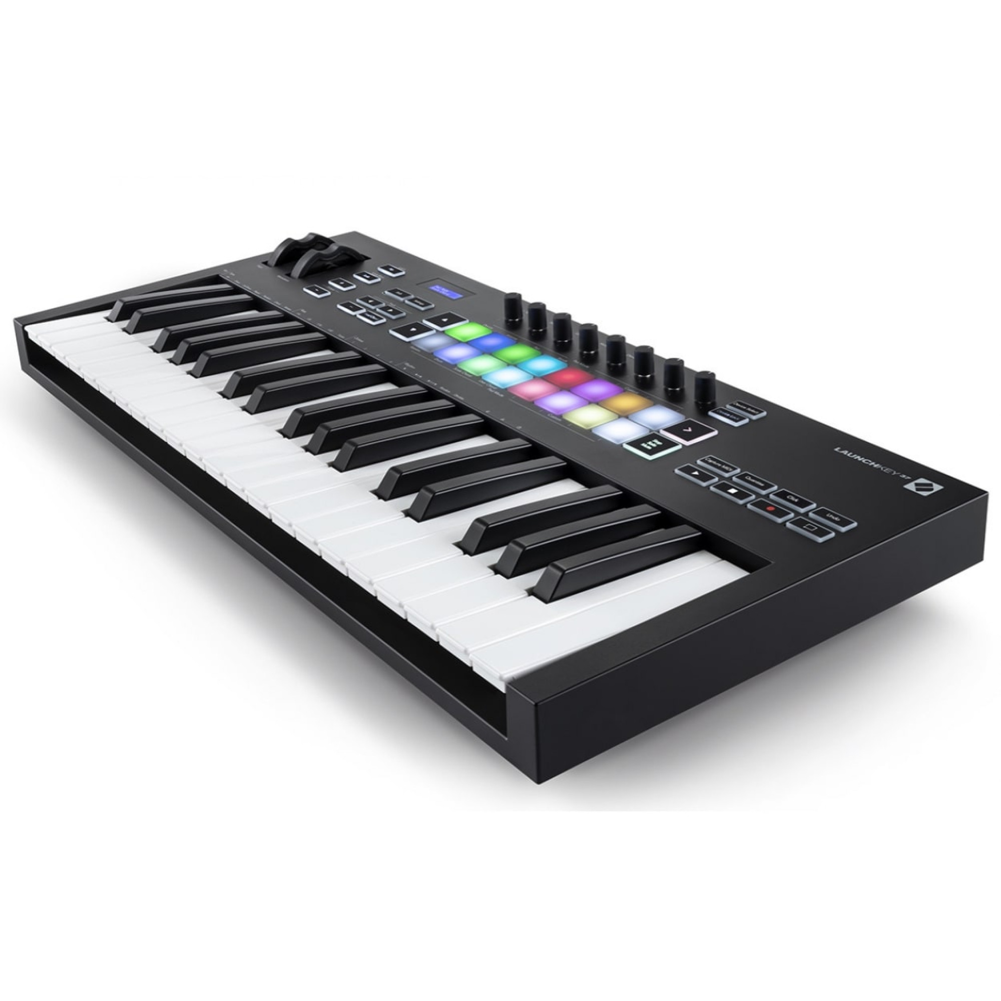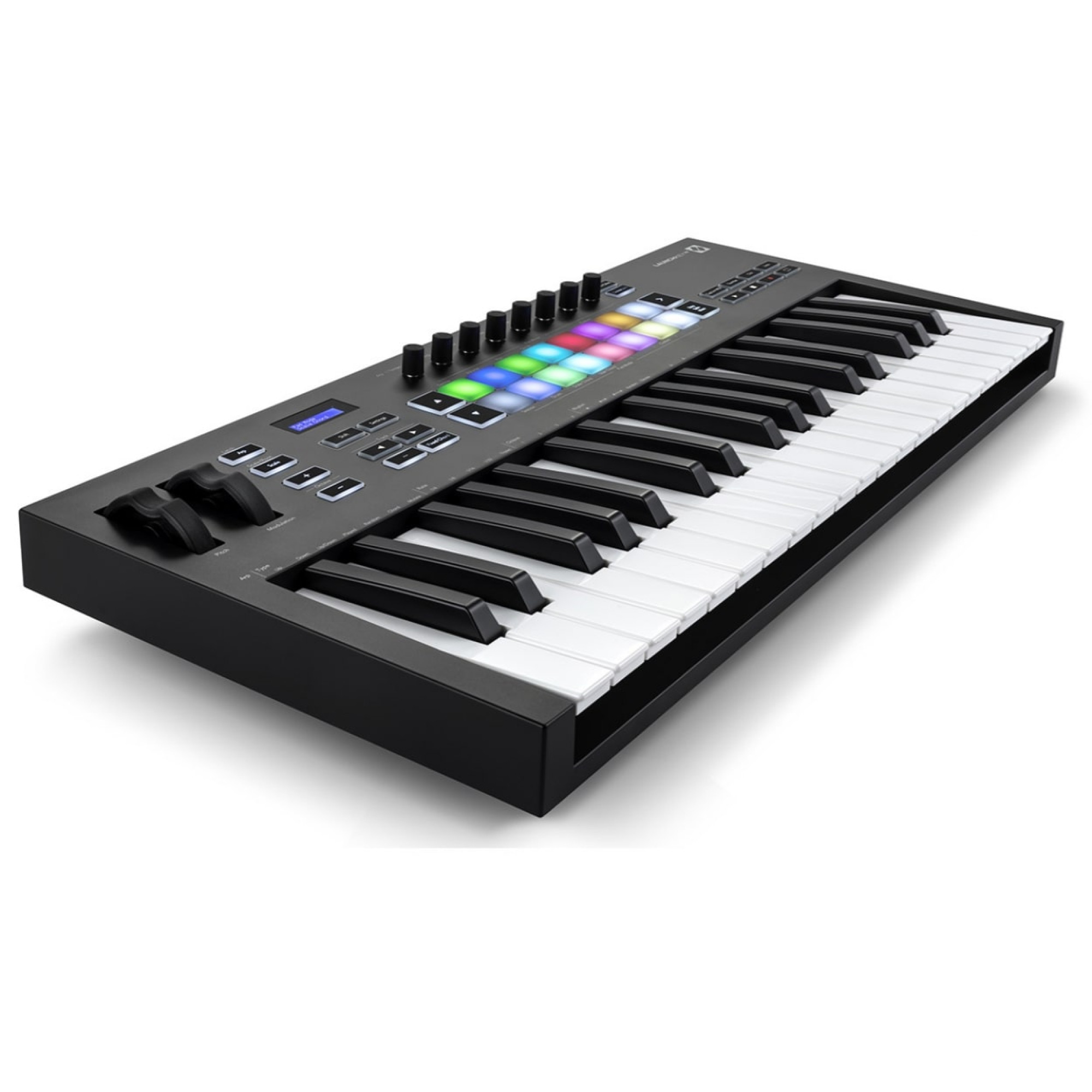 MIDI keyboard, 37 velocity-sensitive keys, pedal input, controls: modulation and pitch bend wheels, 16 pads, 8 knobs, navigation keys, USB powered, color - black.