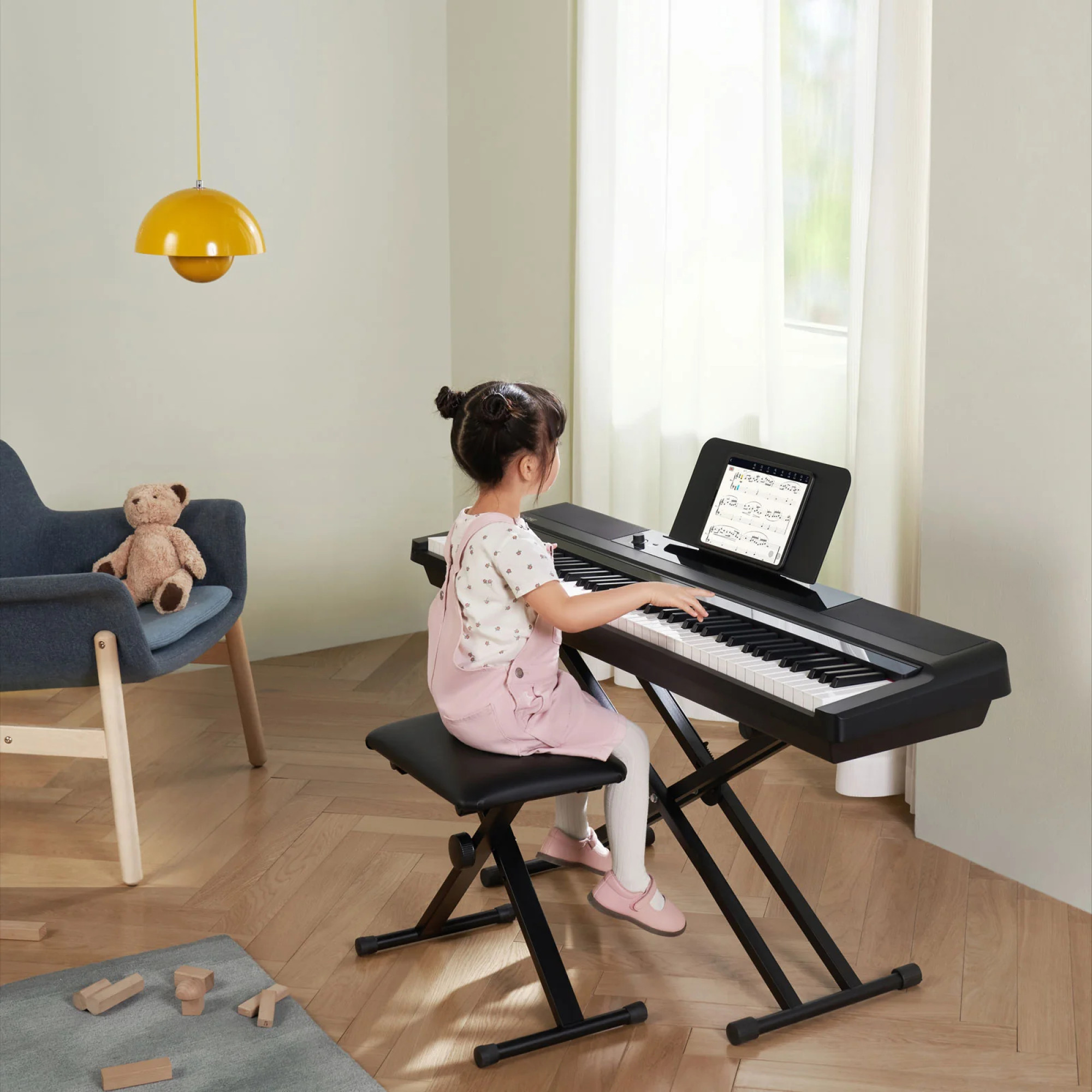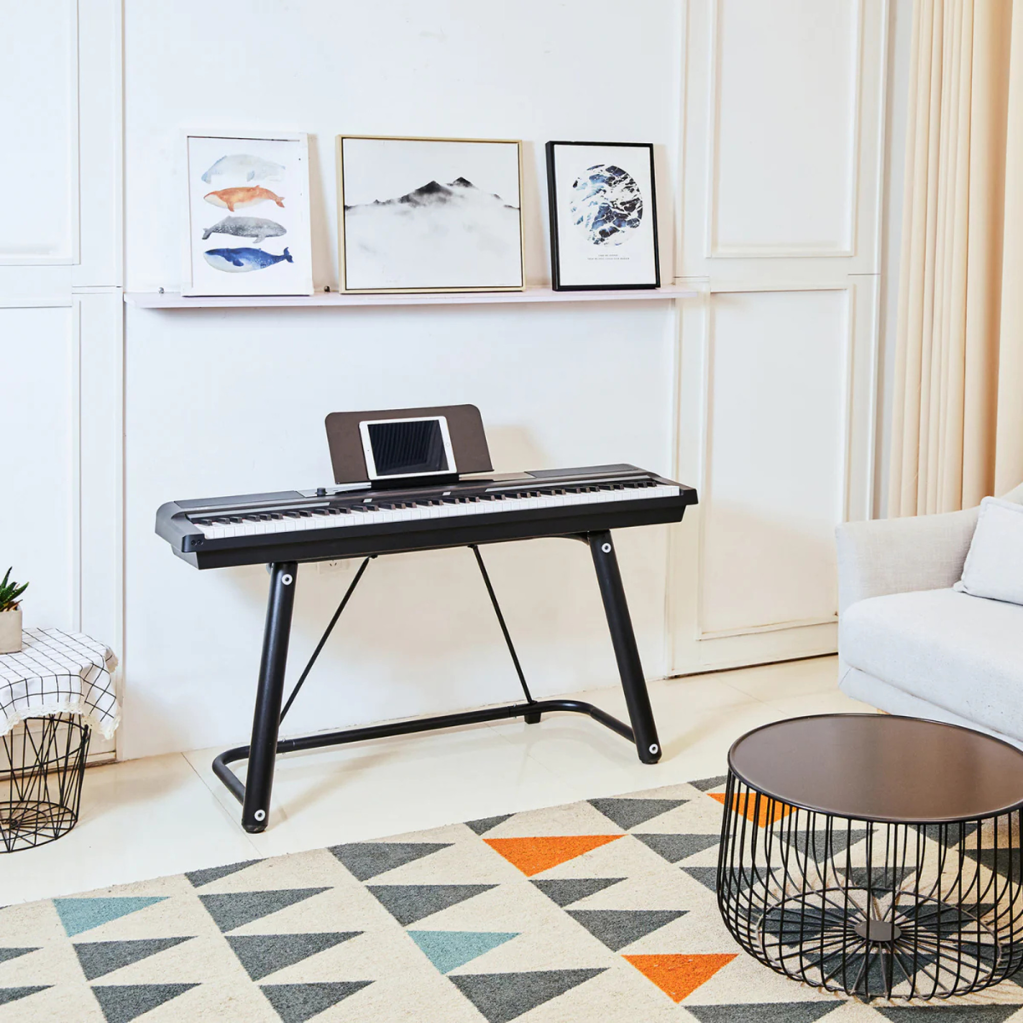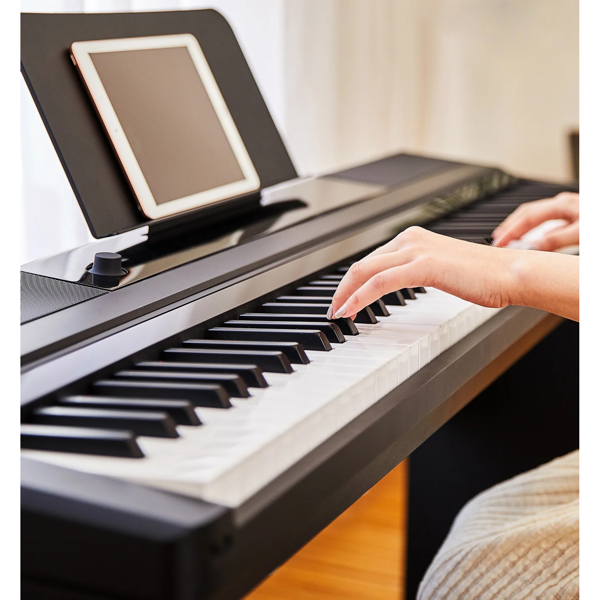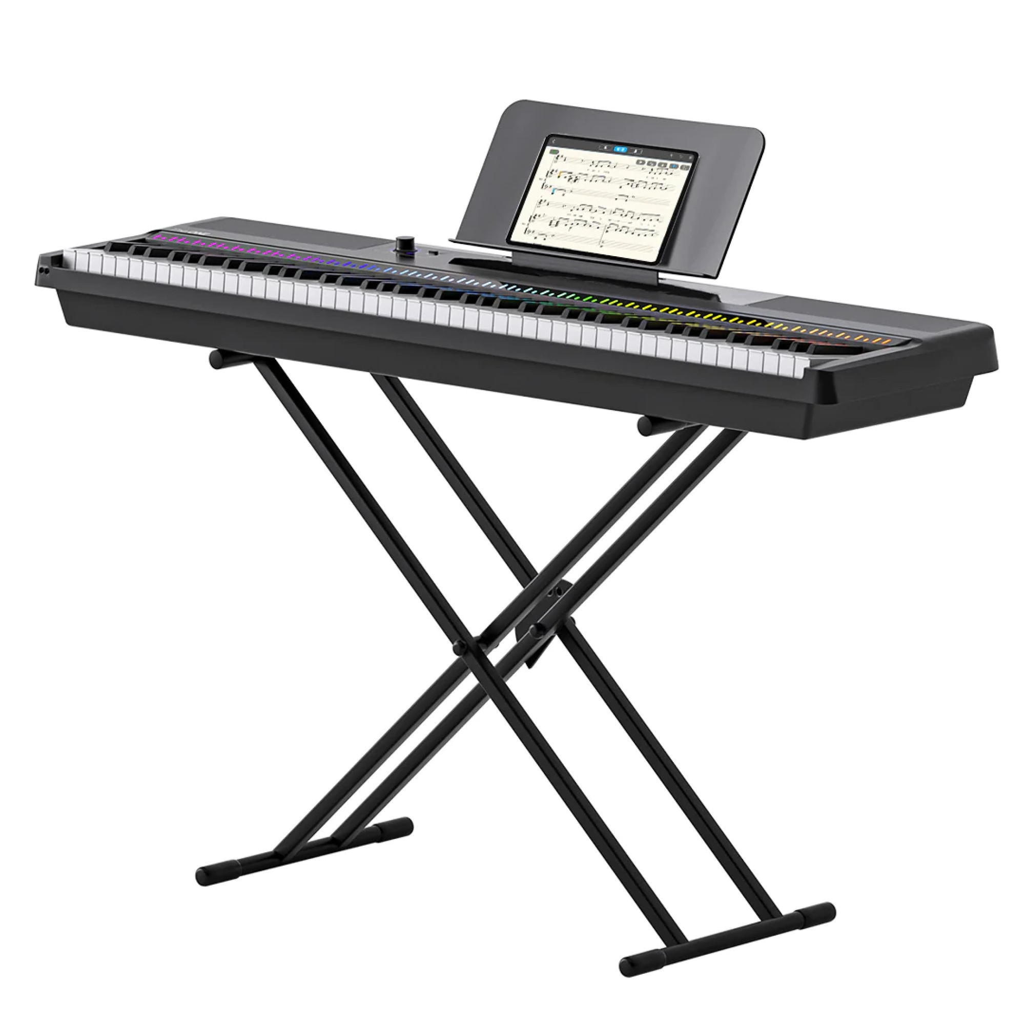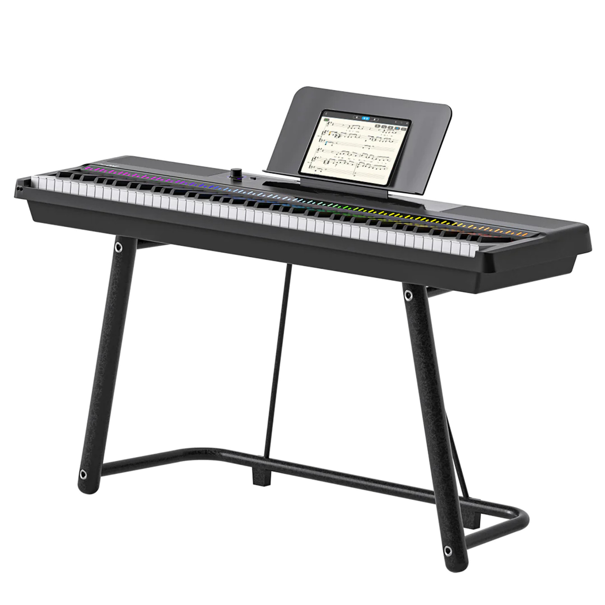 The ONE NEX is a high-end digital piano that features full-size hammer-action keys for an authentic playing experience. The ONE NEX features 88 weighted standard keys that are sized to match the keys of a standard acoustic piano. Hammer action provides the most realistic feel, while touch response allows for more convincing and dynamic sound. With built-in 88 multi-colored LED lights, plus 4,000+ notes, 100 instructional videos and fun games in the free app, this digital piano will have you playing in minutes. It's more than just a piano, it's also a piano teacher.