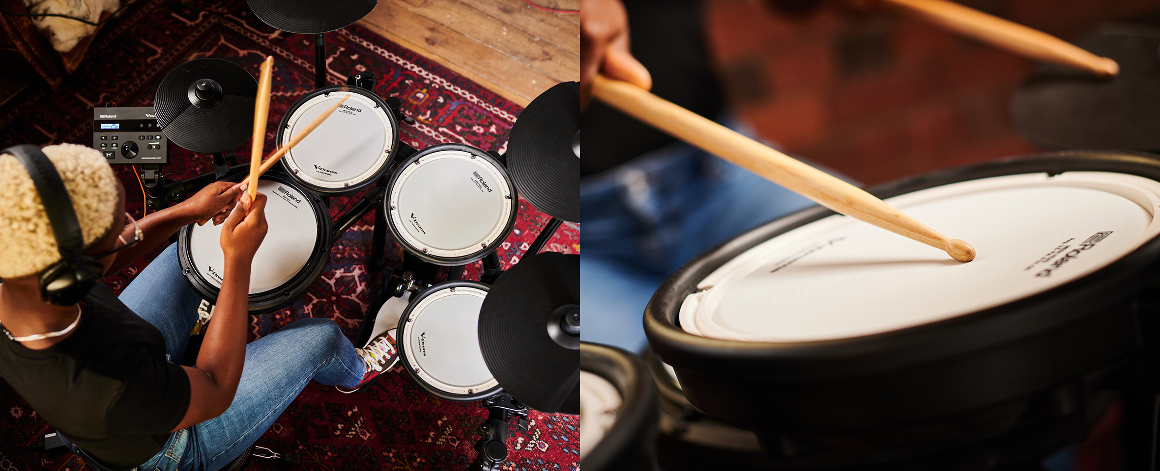 - The snare and tom pads are equipped with double mesh membranes that match the feel of acoustic drumming and respond to the finest nuances of playing