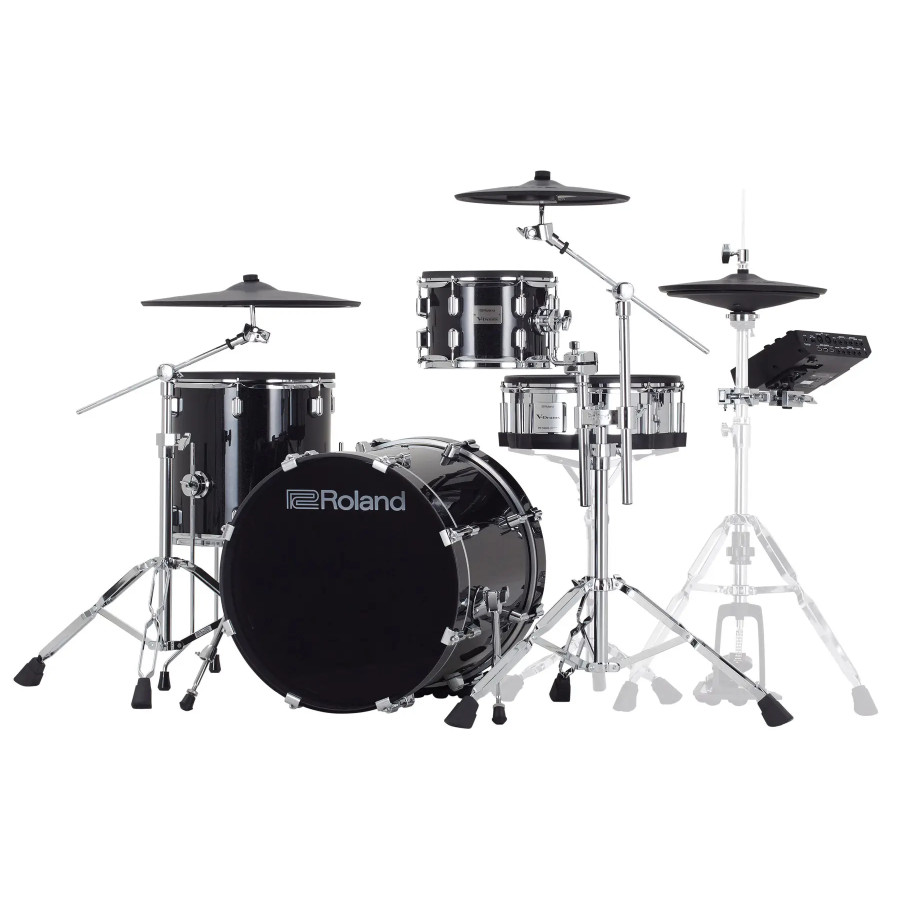 When you need the glamour and presence of a full acoustic drum set on stage – but with the convenience and control of electronic drums – the Roland VAD504 is the perfect solution. This premium “one-up, one-down” kit features wood shells with full depth and diameter, covered with attractive wraps and mounted on double-braced chrome stands. Roland’s advanced digital sensor technology and dynamic TD-27 drum module provide the sound and response to match, with every stroke, ghost note, roll, and swell expressed in incredible detail. Building on the previous VAD503 model, the VAD504 adds a digital hi-hat for even greater expression, plus heavy-duty cymbal stands inherited from the flagship VAD706. The TD-27 module has also been updated, bringing you new kits and samples, expanded processing options, and more. With the impressive looks, familiar layout, and inspiring playability of a high-end acoustic kit, the VAD504 makes any drummer feel instantly at home. There’s a 14-inch stainless steel snare, 10-inch rack tom, 14-inch floor tom, and 20-inch kick constructed with full-depth wood shells, adding to the authenticity and providing genuine acoustic feel under the sticks and beater. A full complement of cymbals includes a 14-inch V-Hi-Hat, 14-inch crash (with thin profile and textured finish), and an 18-inch ride for superior playability and natural appearance on stage.