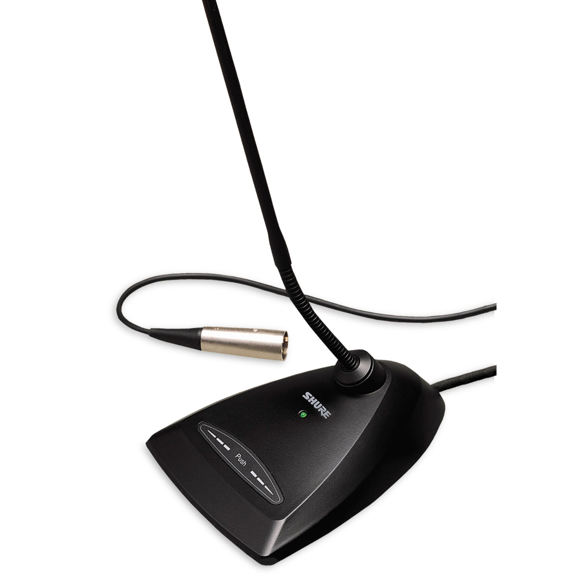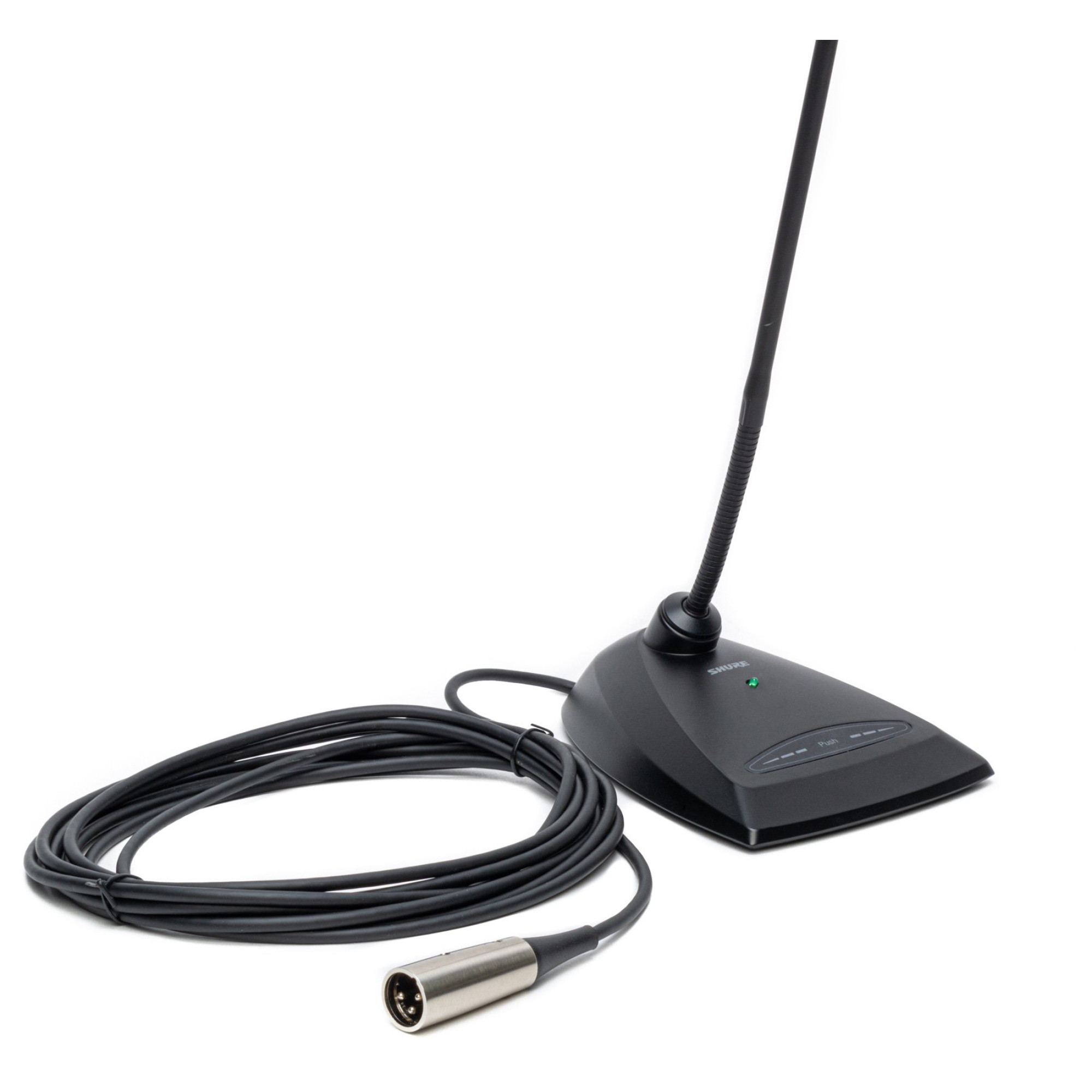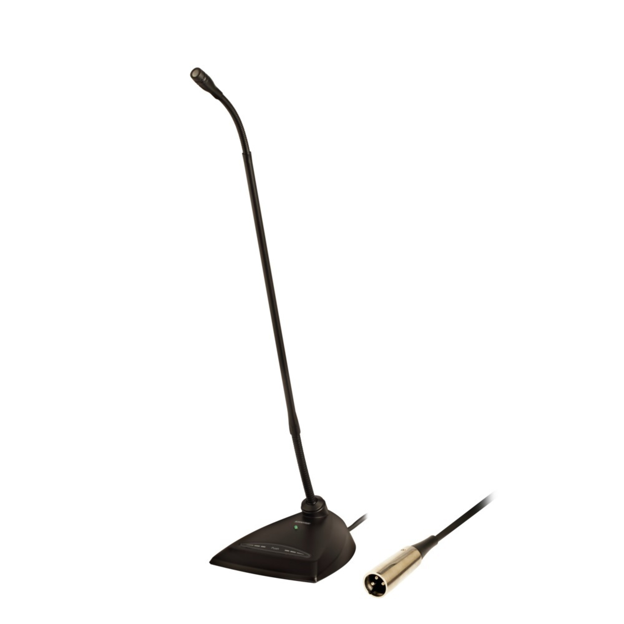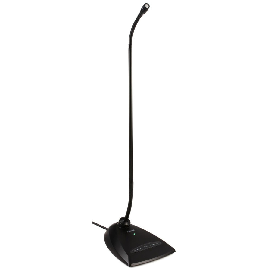 The 18" (45.7 cm) Microflex MX418D/C Cardioid Gooseneck Conference Microphone brings a whole new meaning to the word "flexible". The desktop stand of this microphone allows you to place it anywhere. This microphone is an excellent choice for courtrooms, houses of worship and convention centers. The desktop base has a programmable on/off switch with LED indicator for easy operation. Easy-to-change cartridges provide wide frequency response and accurate sound reproduction for a wide range of applications (cardioid – C, super-cardioid – S and omnidirectional cartridge – O). The Shure MX418 features high sensitivity and a balanced, transformerless output for maximum EMI/RFI immunity, even over long cable runs.