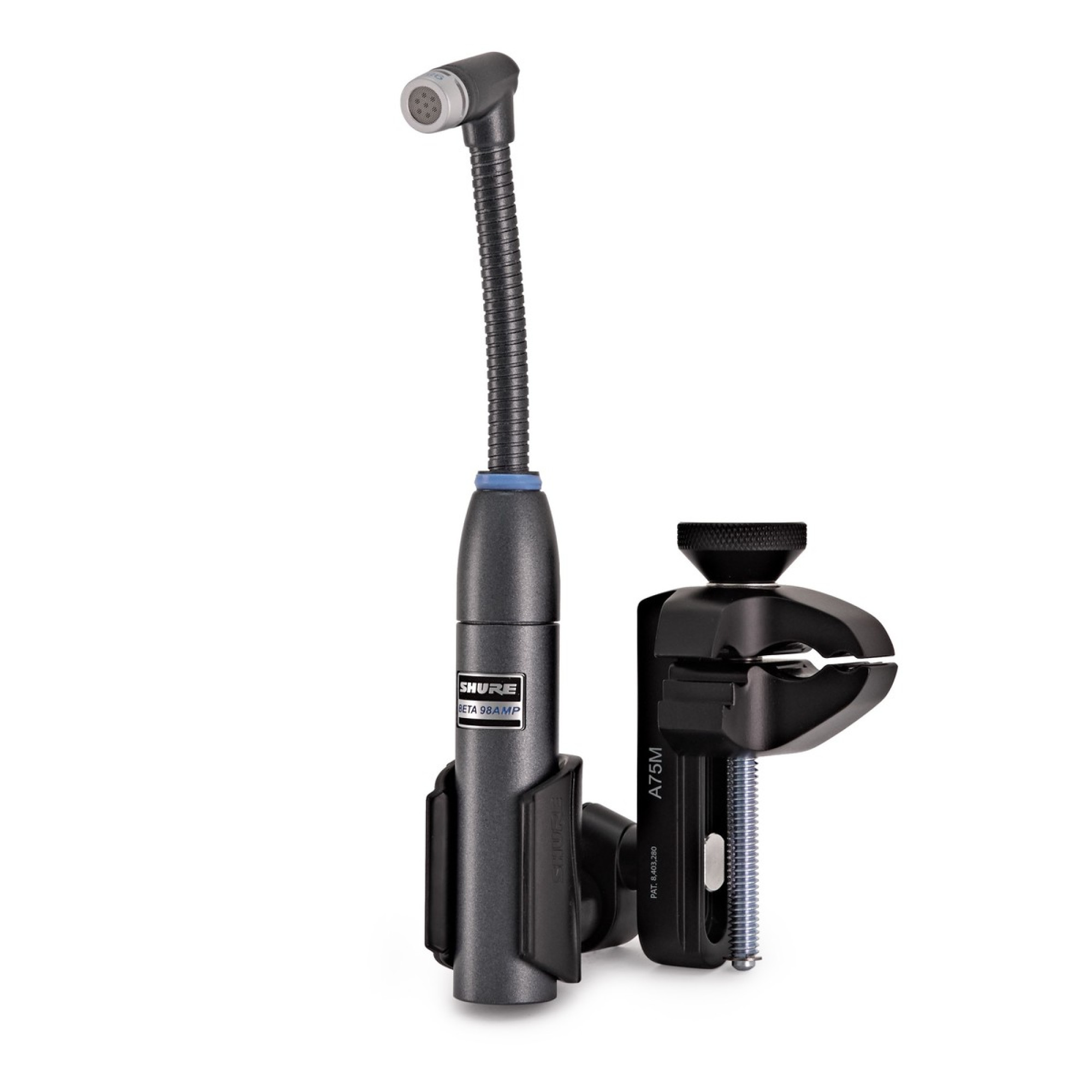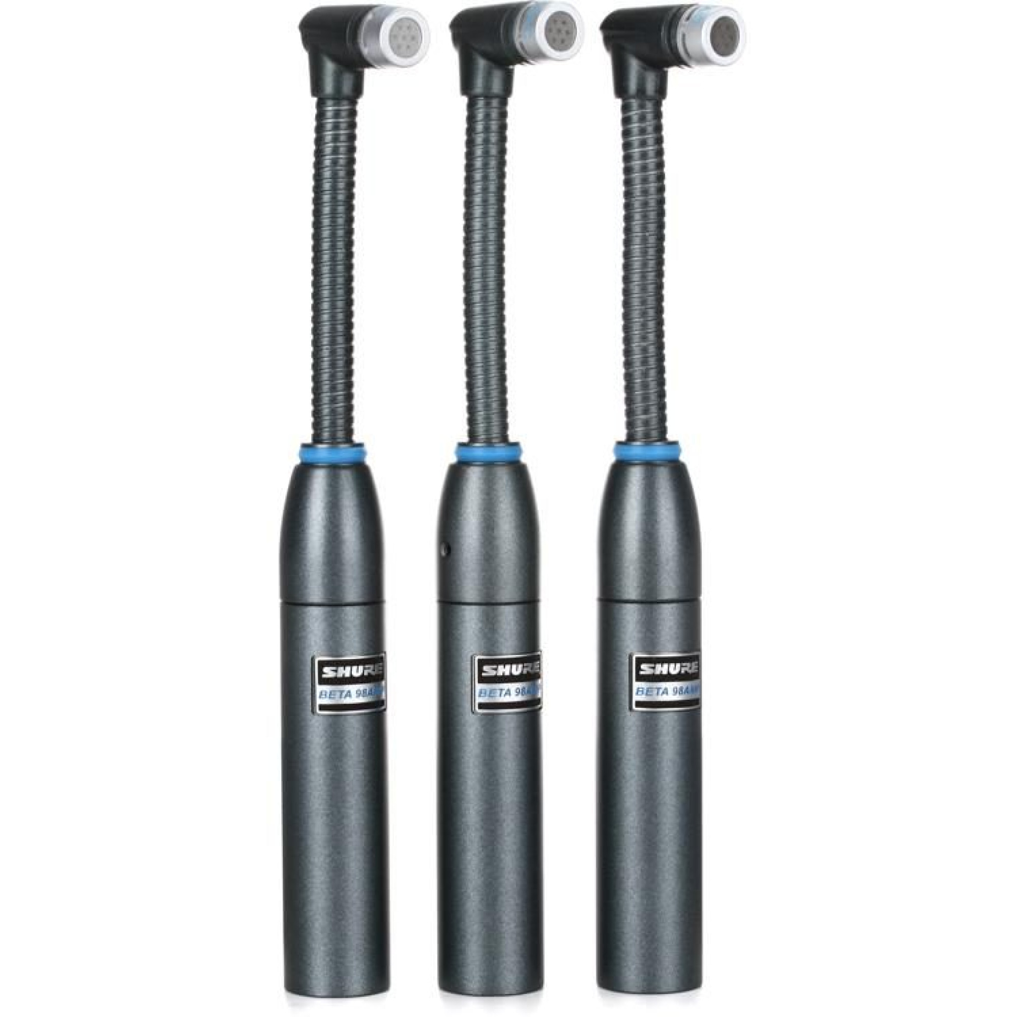 The Shure Beta 98AMP C-3PK drum microphone combines an integrated preamplifier with a miniature cardioid capsule to provide a smooth, natural tailored response for drums and percussion. The Beta 98AMP/C has a wide dynamic range and has a sound pressure level (SPL) capability 7dB higher than other Beta 98 versions. Uniform cardioid polar pattern provides maximum gain-before-feedback and rejection of off-axis sound for smooth high-end response and control. The Beta 98AMP/C has a miniature design that lets it be positioned in spaces where a full sized mic won't fit, and the included A75M universal microphone mount allows accurate and secure placement in any configuration. Includes a flexible gooseneck, snap-fit windscreen, and zippered carrying pouch.