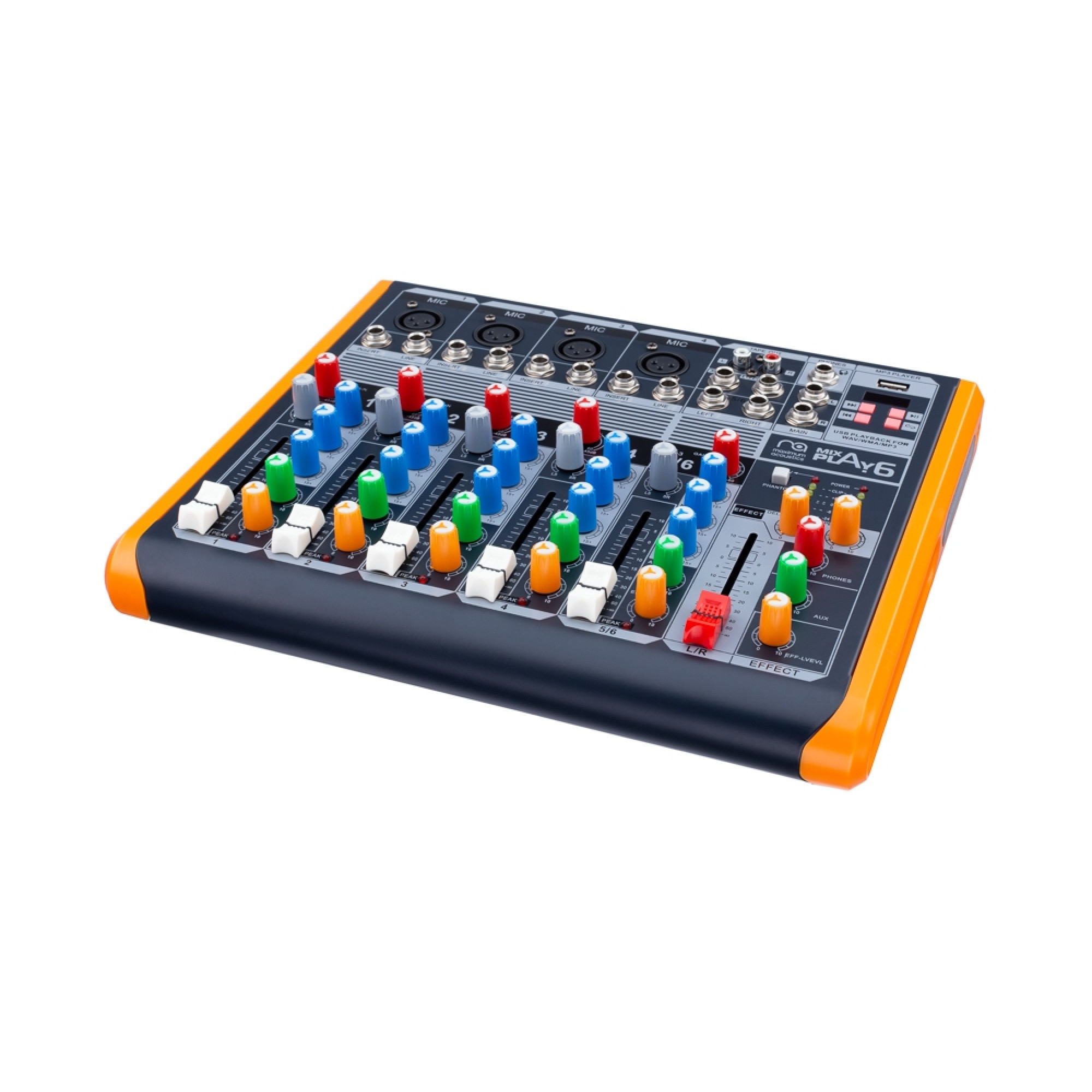 Mixing console Mixaplay.6 is an electronic music-acoustic device that has wide service capabilities - equalizer, 6-channel preamp, effects channel, reverb, delay, monitor, pan, return, insert, etc. – and allows the musician to combine (mix) various acoustic properties of the sound of musical instruments in wide combinations. Maximum Acoustics Mixaplay.6 is equipped with an MP3 player and a USB input.