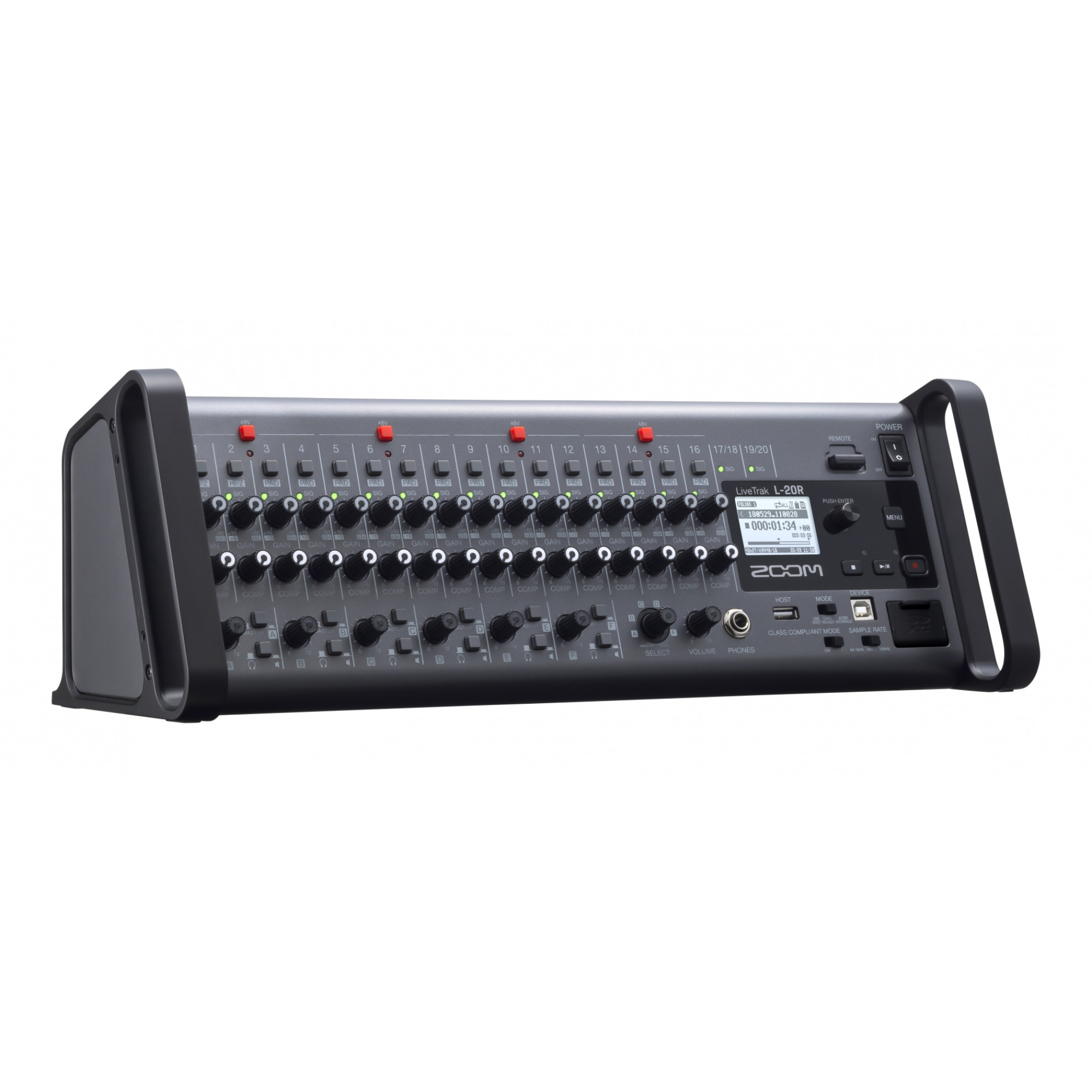 The Zoom LiveTrak L-20R is a rack-mountable digital mixer that allows musicians to control their live mix right from the stage with the use of an iPad. With wireless control, 20 discrete channels, 22 tracks of recording and six custom monitor mixes, the L-20R offers a complete solution for any venue.