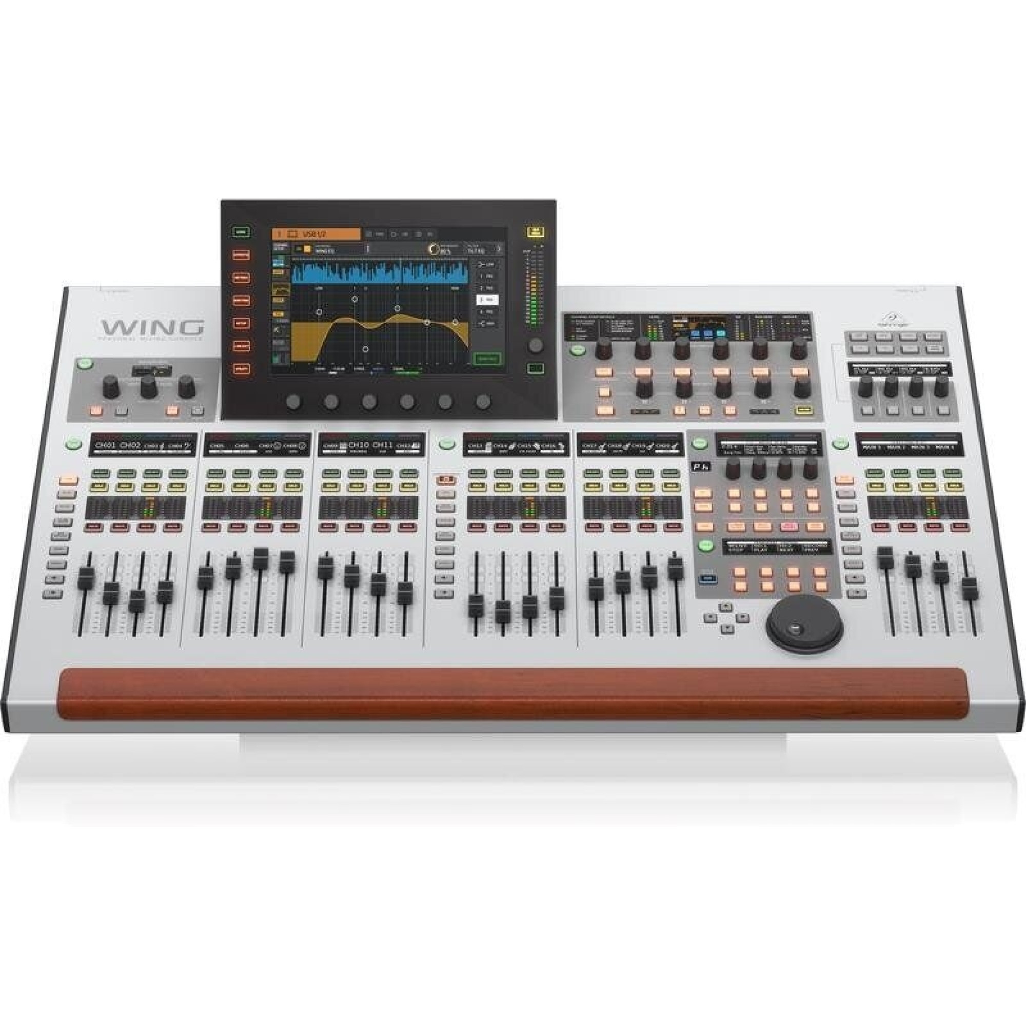 The WING control surface utilizes a large capacitive touchscreen interface with touch-sensitive rotary controls for a new ease of operation. Three separate fader sections and a Custom Controls section can be tailored easily and intuitively to meet your personal requirements. No matter if you need a specific bus send fader next to the corresponding channel fader, or a dedicated “money” channel always at your fingertip, or even sharing the surface with two engineers - WING can be configured to elevate your production to a new level. You can even replace and customize the massive wooden armrest with something funkier if you like. The technical drawing can be found in the Downloads section of the product page.