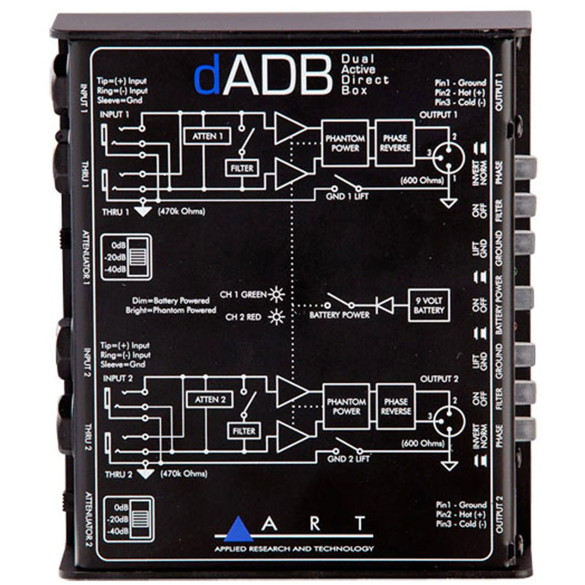 The ART dADB dual active direct box acts as two independent, high quality active interfaces for connecting instrument, line, or speaker level signals to balanced inputs. The high impedance ¼-inch inputs are buffered and converted by extremely low noise active electronics to deliver isolated, balanced, low impedance outputs.