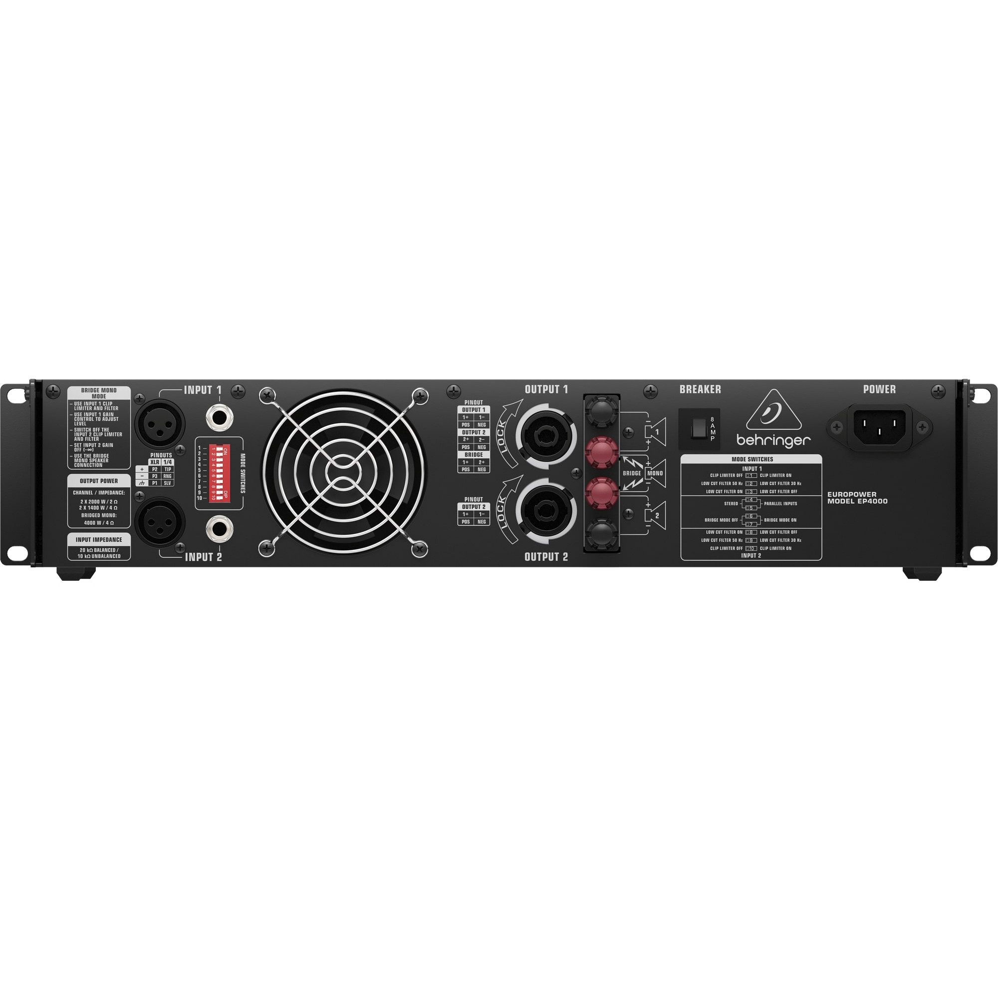 Stage vibrations, mic thumps and wind noise can cause ultra-low frequency sounds, or infrasonics – and while technically inaudible, they can be a real drain on power resources. As a solution, the EP4000 features a defeatable Low Cut Filter that eliminates frequencies below either 50 or 30 Hz (depending on your PA system’s capabilities) – for better sonic performance, as well as the ultimate in loudspeaker protection. The rear panel also contains the Stereo or Bridge (mono) mode switches.
