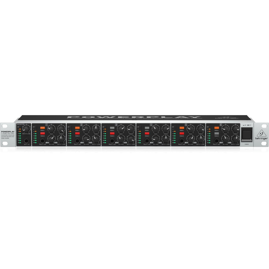 - 6 independent high-power amplifier sections provide up to six stereo mixes with individual balance controls