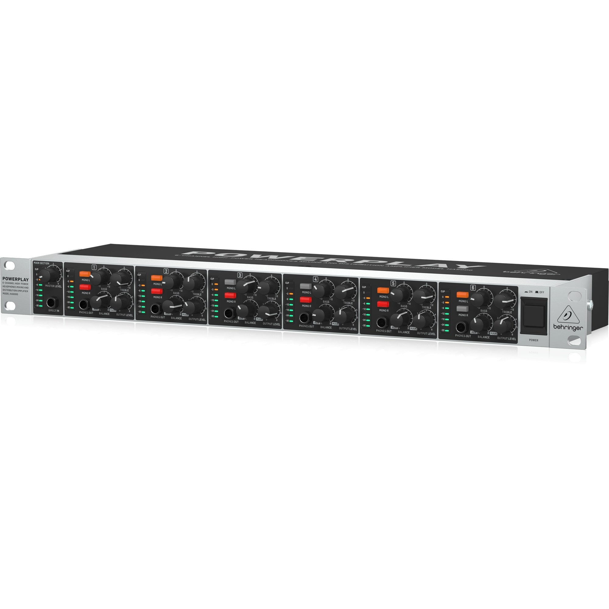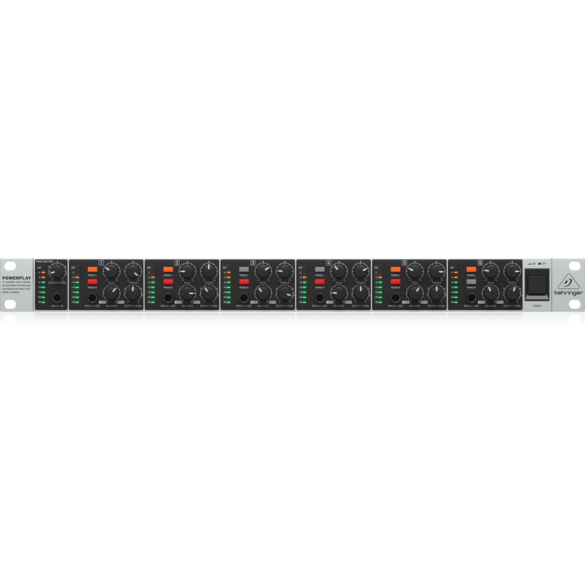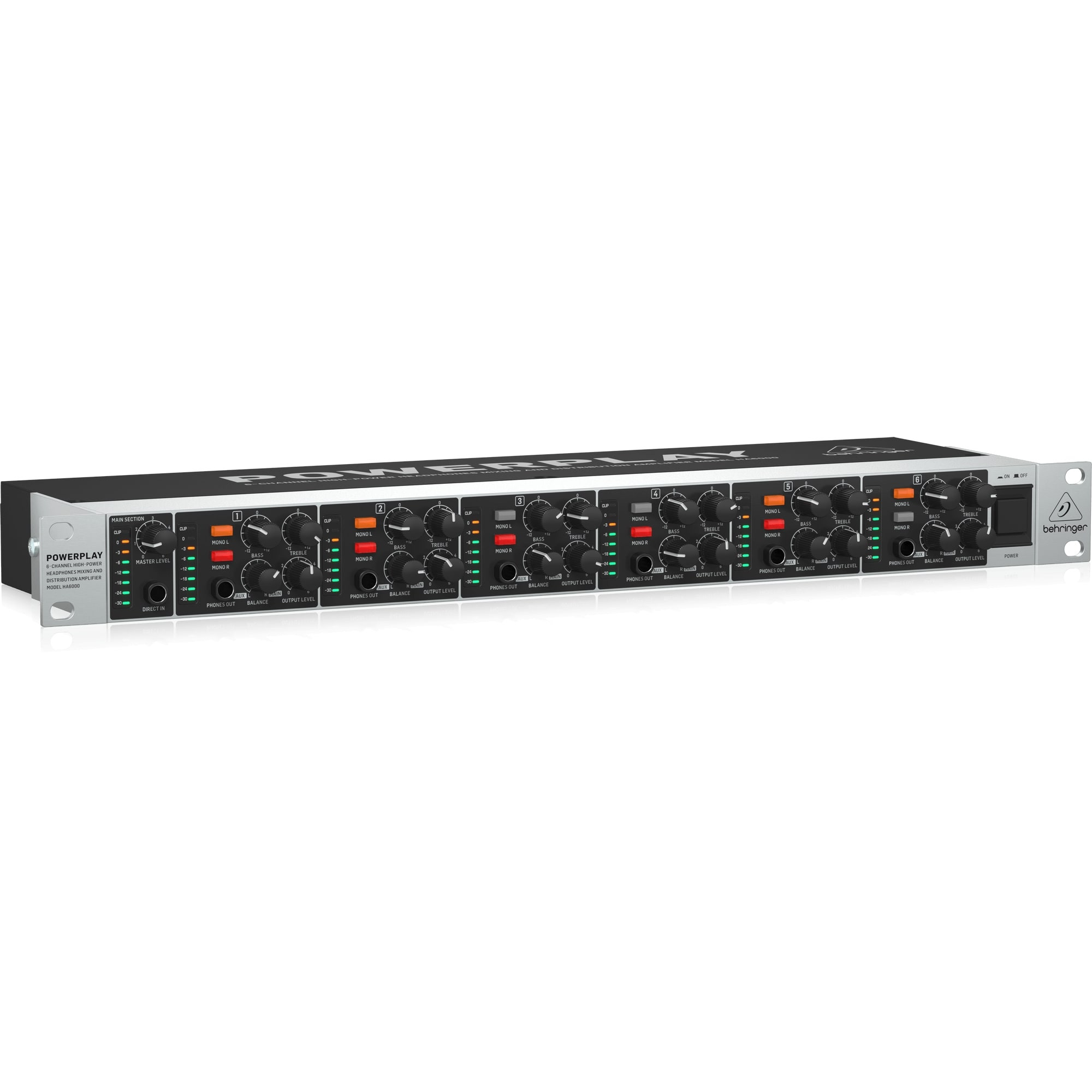 The HA6000 offers 6 high-power amplifiers that can drive loads down to 8 Ohms. Each amplifier features its own 2-band EQ, 8-digit LED output meter, Left and Right Mono switches, and a ¼" stereo Aux input to mix in any instrument or sound source and a dedicated ¼" Phones Out jack. HA6000’s Main Section features a 8-segment LED input meter, Direct In ¼" jack and Master Level dial.