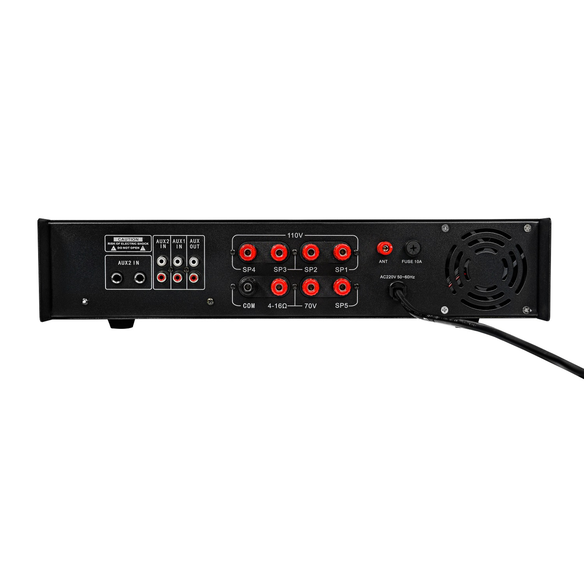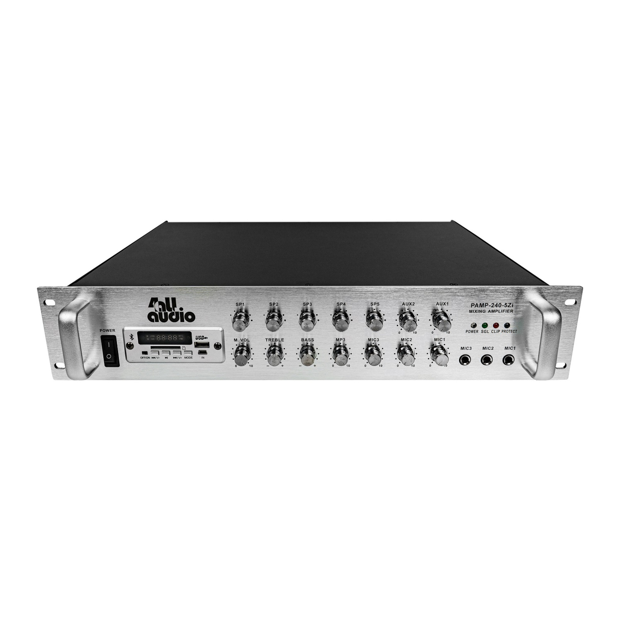 This amplifier provides audio in the frequency range from 40 to 18,000 Hz. A signal-to-noise ratio of over 70dB ensures clear audio reproduction. The amplifier is equipped with three microphone inputs on TRS 1/4” connectors and two AUX inputs on RCA and TRS connectors, which allows you to connect a variety of sound sources. The device also has a USB port and a slot for SD cards, a built-in MP3 player, an FM tuner, and Bluetooth, which provides additional possibilities for audio playback. Outputs include 70V / 100V for each zone, 70V / 100V total output, as well as 4-16 Ohm output and an additional AUX output (on RCA connectors).