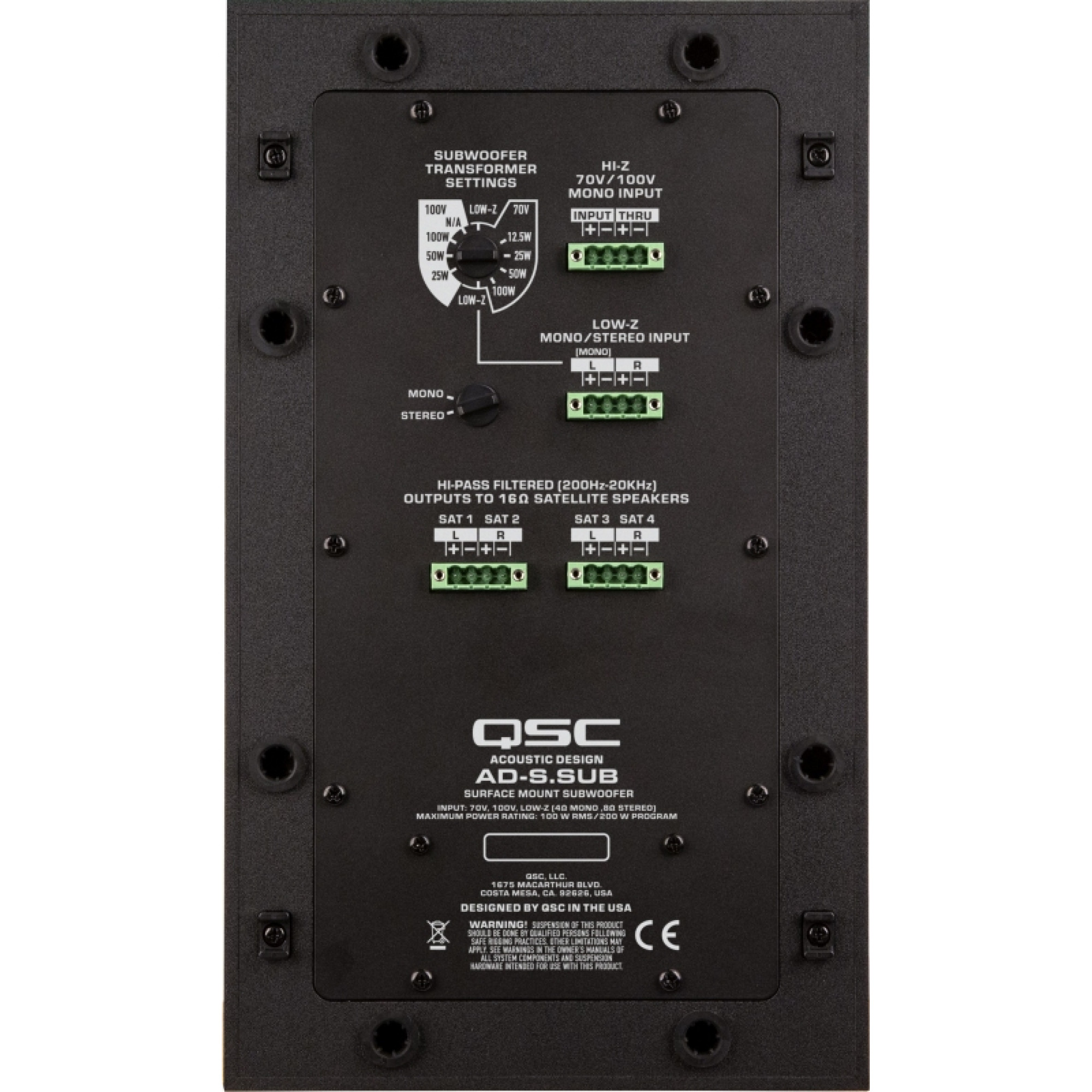 The QSC AD-S.SUB is part of the AcousticDesign Series SUB/SAT loudspeaker solution, which is ideally suited for background music applications that require depth and clarity even at lower volume settings. The AcousticDesign Series SUB/SAT loudspeakers are specifically designed to be mix-and-match capable; meaning any combination of satellites may be paired with any subwoofer in the AD Series SUB/SAT line.