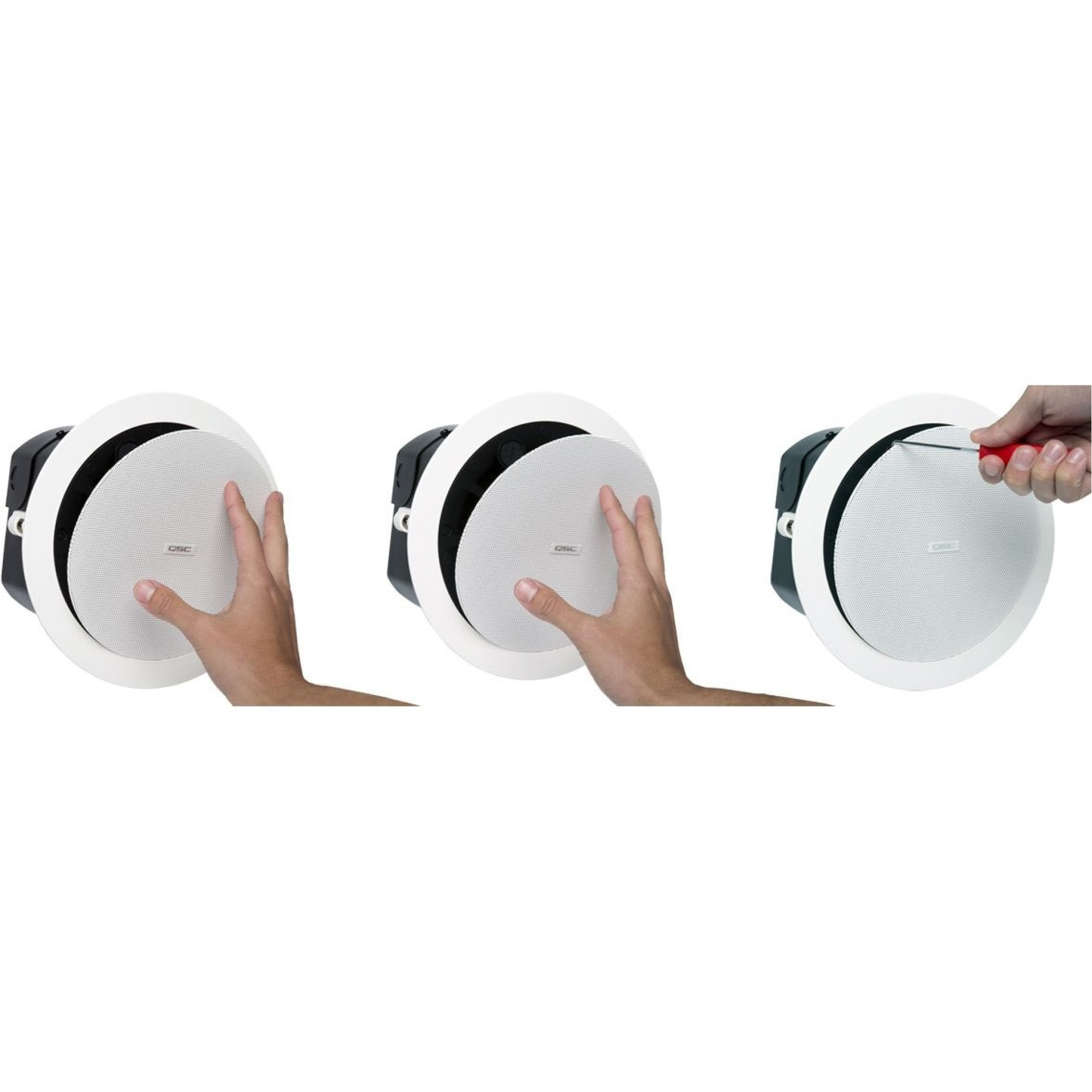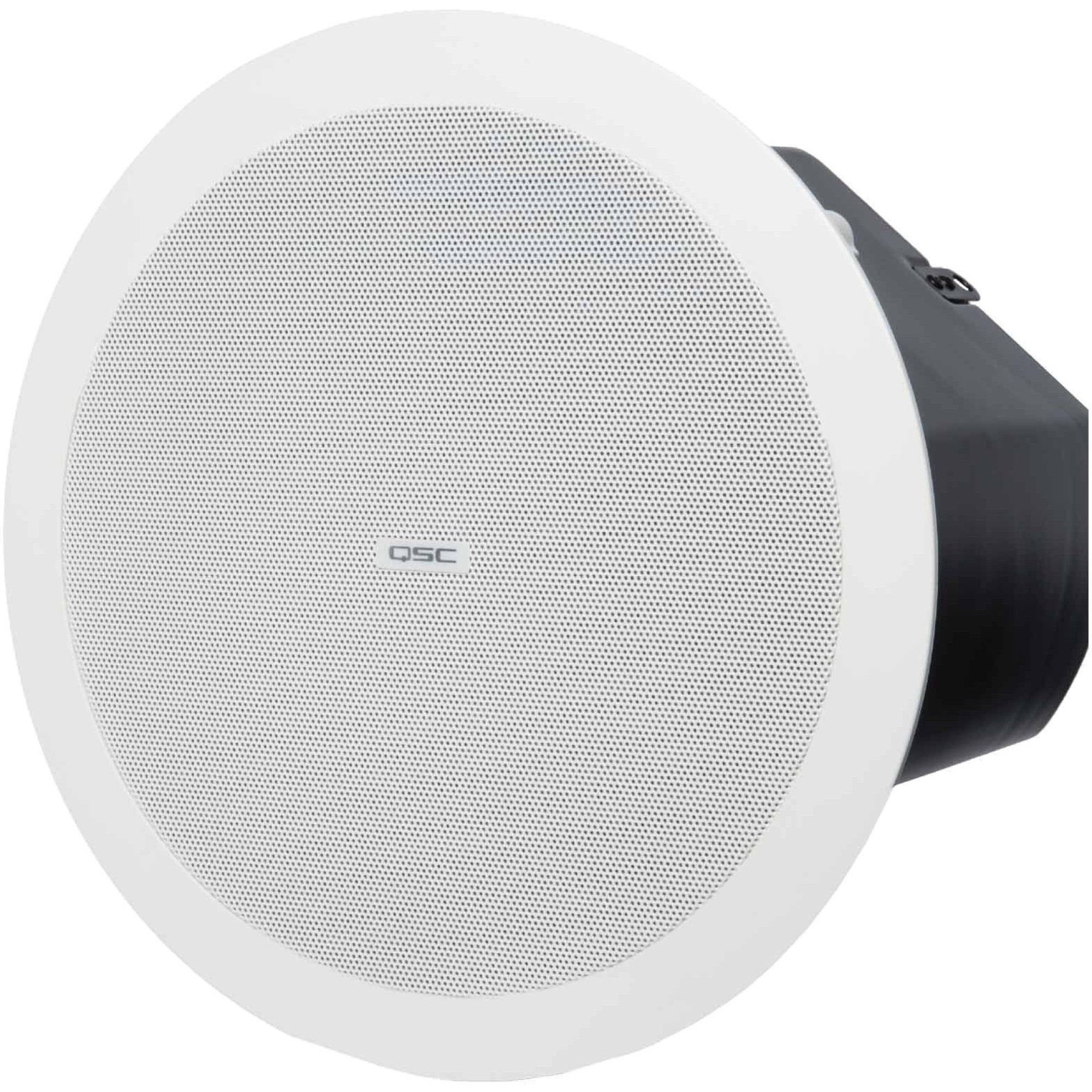 The QSC AcousticDesign AD-C4T is a 4,5" two-way ceiling loudspeaker ideally suited for a wide variety of foreground and background sound reinforcement applications which utilize 70/100V or 16 Ohm bypass configurations. The AcousticDesign Series offers integrators a premium quality installed sound solution where performance, consistent coverage, and aesthetics are paramount. Specifically designed to maintain a consistent tonal characteristic across the entire family in ceiling, surface, and pendant applications, the AcousticDesign Series allows integrators seamless transitions within blended installations. The AD-C4T features a high quality 4,5" weather treated paper cone woofer with a 1" voice coil and a 0.75" aluminum dome tweeter which is positioned on a DMT waveguide. DMT (Directivity Matched Transition) is QSC’s design philosophy where the high frequency waveguide is matched to the natural conical behavior of the woofer at the crossover point. The result is a coherent transition between transducers with improved off-axis power response for consistent 150° conical DMT coverage.