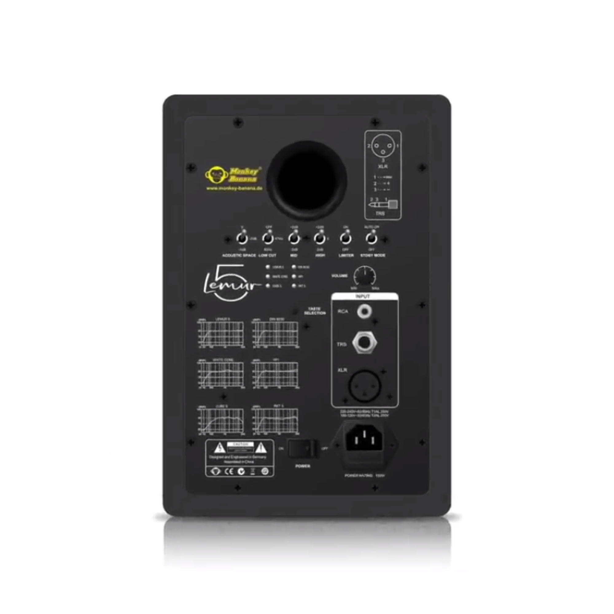 Lemur5 got it´s very own signature and on demand it can also sound like other well-known speakers. The build in digital signal processor in combination with the modelling technology and it´s other components makes this possible. Next to 6 different Speaker Presets , room compensation fine tuning functions like 3 Step Low Cut, Midrange Bell Filter, High Shelfing Filter and other features such as Limiter On/Off function, standby On/Off function are available.