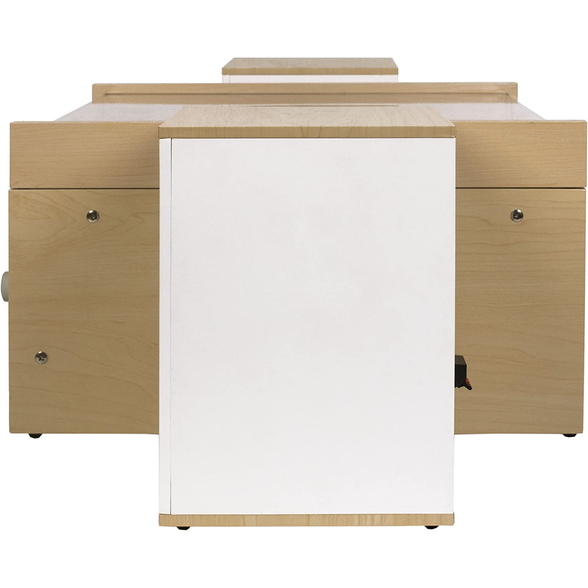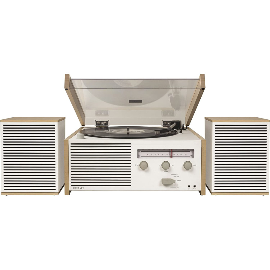 Simplicity meets functionality in the Switch II all-in-one turntable system. Reminiscent of modernist architecture, the Switch II turntable offers an uncluttered, mid century-inspired designed packed with today's tech. The system includes a belt-driven 2-speed turntable, playing 33 1/3 and 45 RPM records. The built-in Bluetooth receiver allows you to stream music from your favorite devices to the two included passive stereo speakers. There is also a headphone jack for private listening. The stark white body features matte grey knobs that blend in seamlessly and complement any decor.