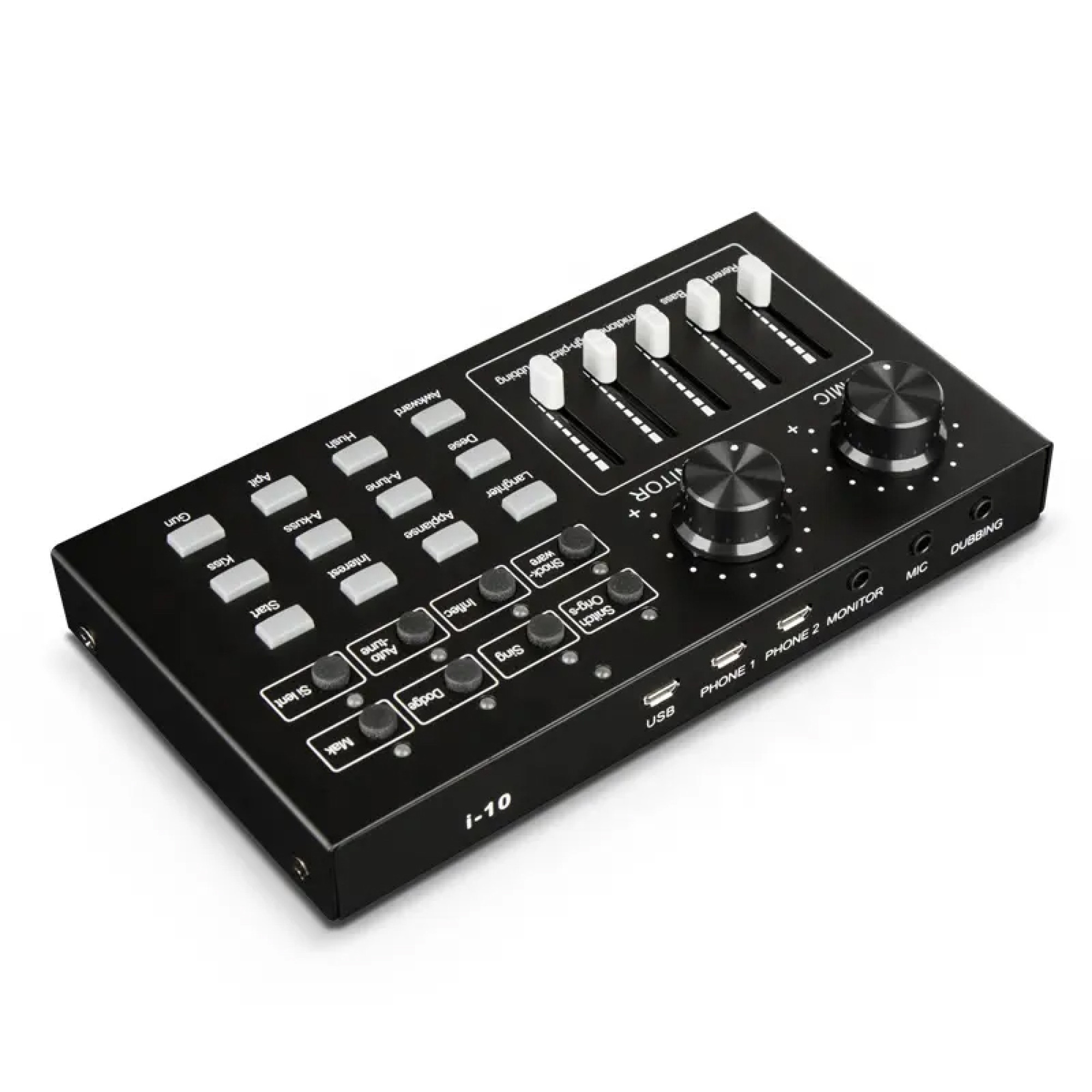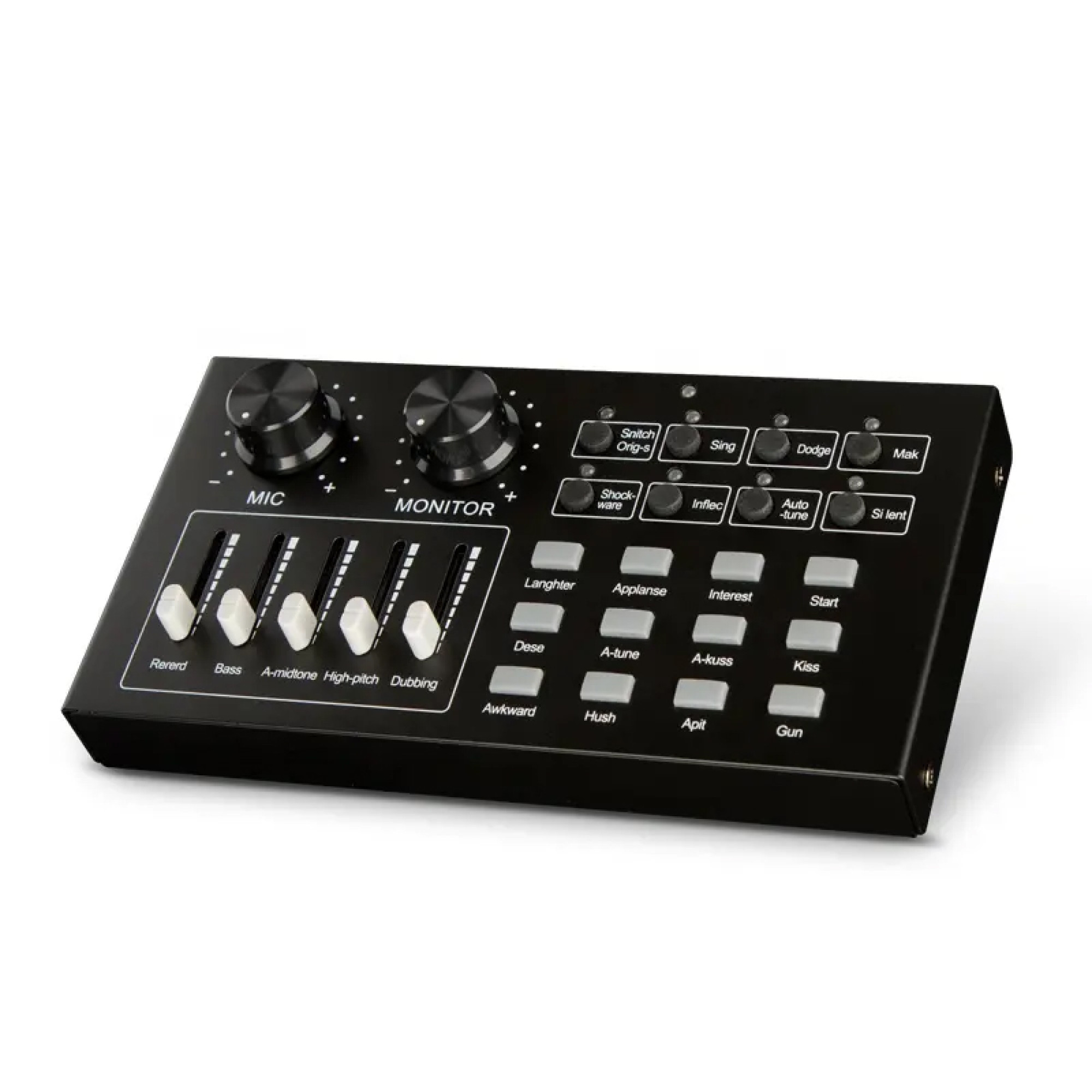 - Reverberation size adjustment, microphone volume adjustment, high bass adjustment, recording volume control, music volume control, monitoring volume control (earphone function)