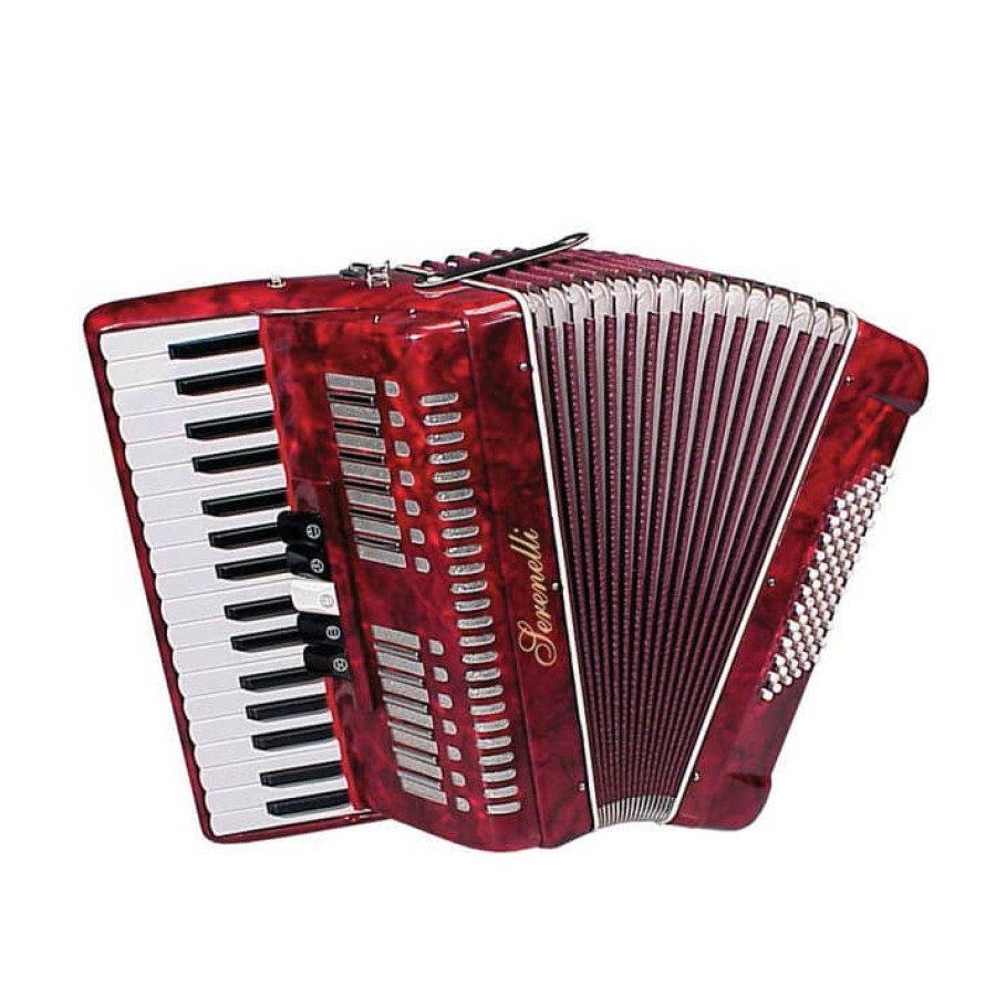 Акордеон Serenelli Y-7234 має 34 клавіші на правій клавіатурі, 72 басових клавіші на лівій, 3 акорди та 5 регістрів. Чохол з заплічними ременями та кишенею для нот або аксесуарів надається в комплекті з інструментом. Доступні варіанти кольору: червоний, чорний, сірий.