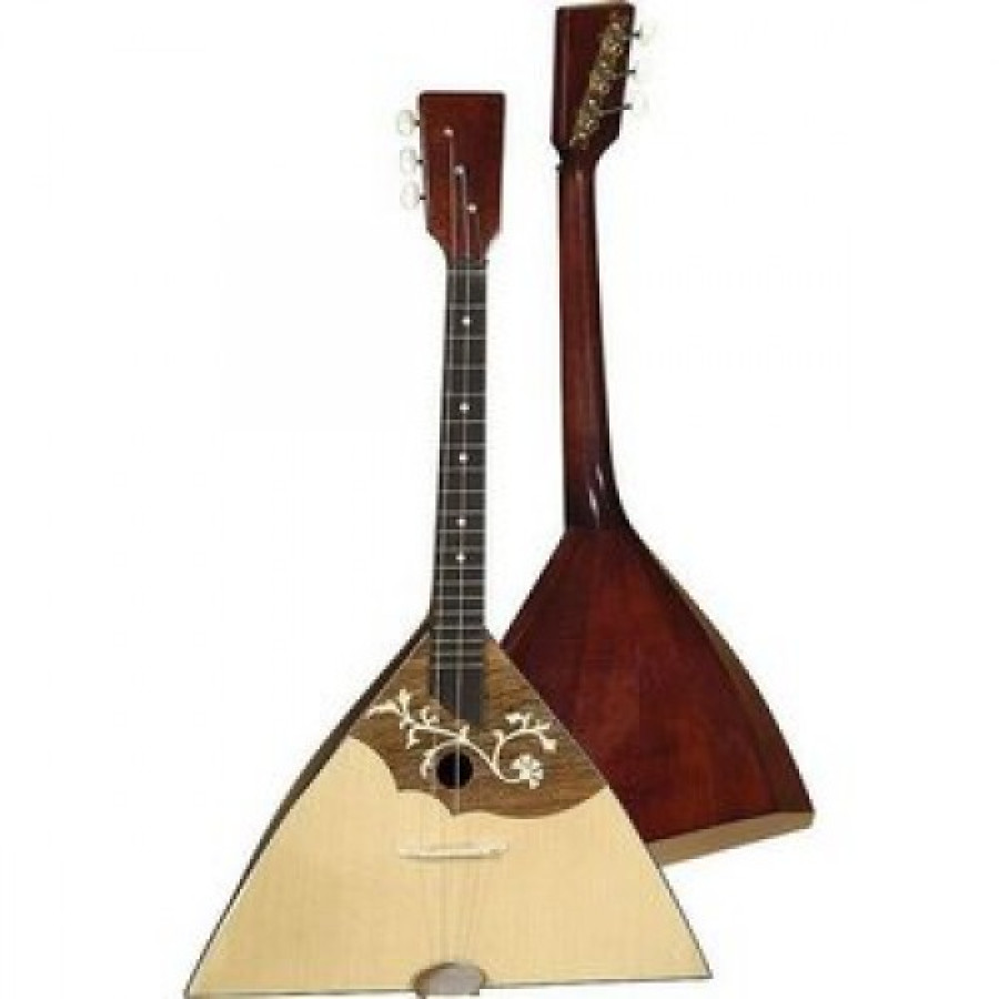 Балалайка прима з 6 струнами та інкрустацією розетки у вигляді панцира з горіхового дерева. Верхня дека виготовлена з цільного масиву ялини, нижня дека і гриф - з клена. Накладка грифа виконана з чорного дерева. Кілки мають нікельоване покриття. Колір натуральний, поверхня глянцева.