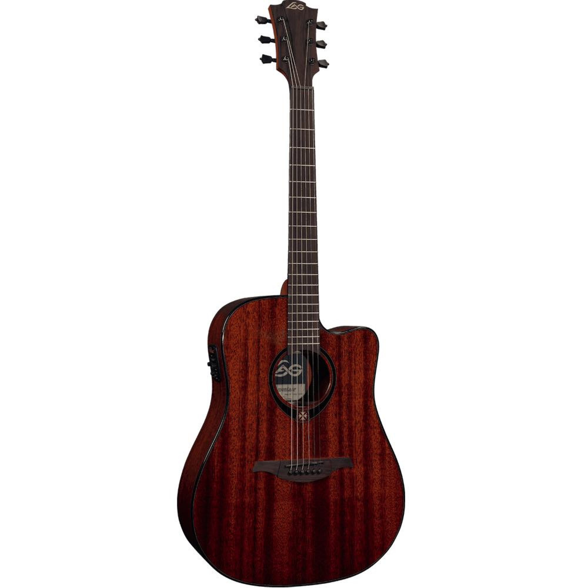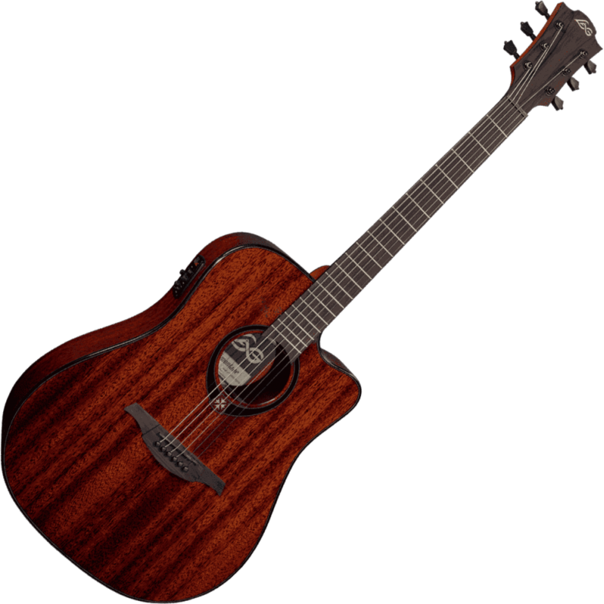 • Голова грифа: Браунвуд, інкрустація логотипа Lag виконана кленом