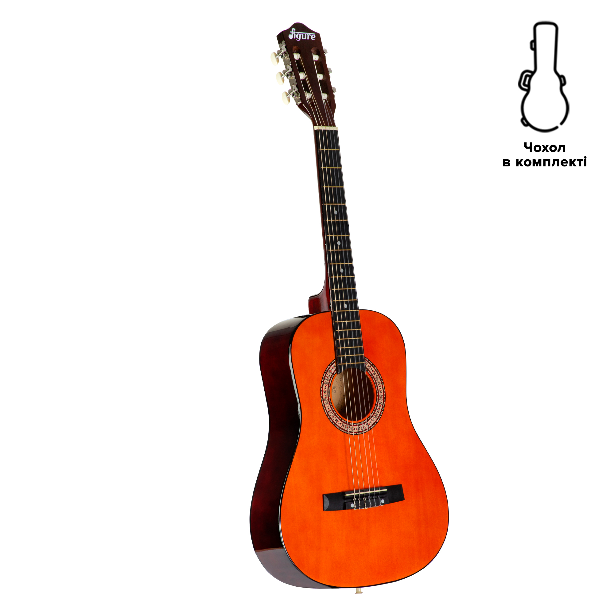 Figure 103OR – шестиструнна класична гітара зі зменшеним корпусом (3/4) з липи. Липа – це дуже легка і досить м'яка деревина, що забезпечує хороший збалансований звук. Нейлонові струни більш товсті і якісно м'які. Натяг невеликий, пальці відчувають себе дуже комфортно. Дзеркальний лак надає гітарі більш ошатний вигляд. Чохол в комплекті.