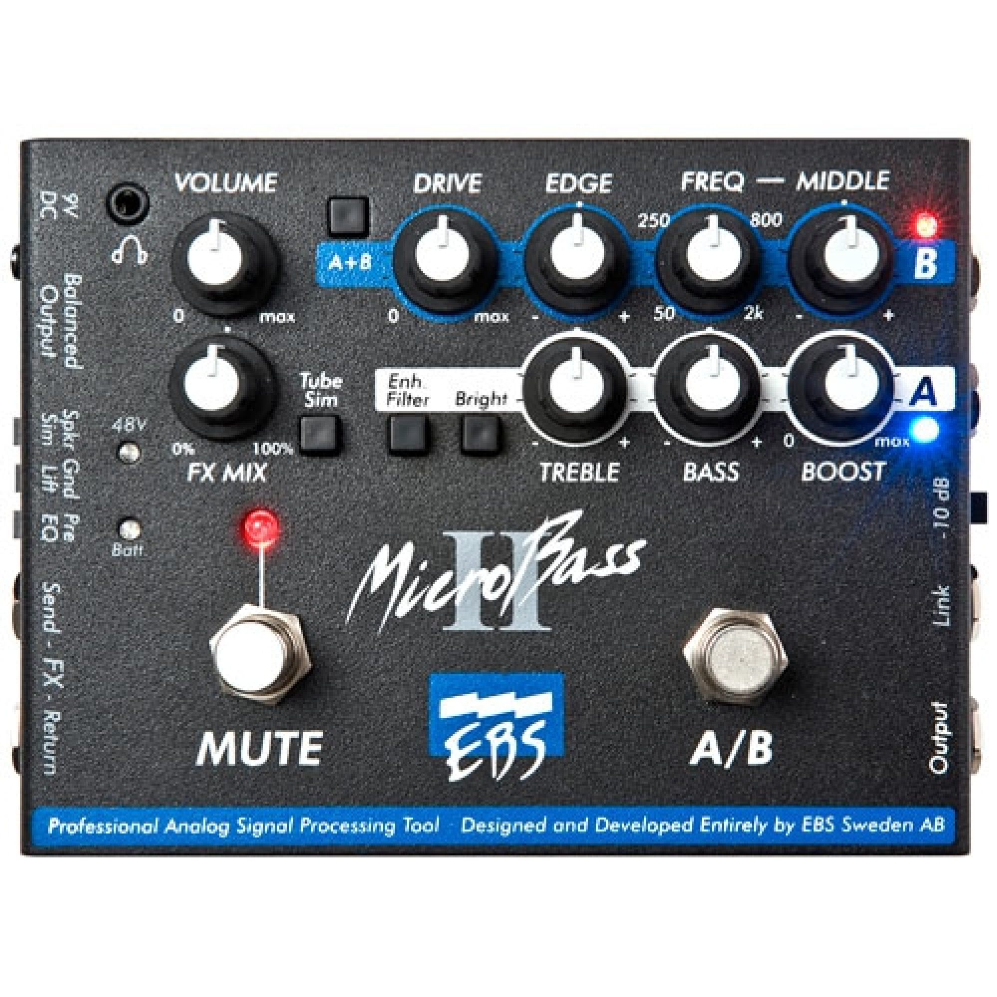 EBS Microbass II - універсальний передпідсилювач для бас-гітари. Має безліч налаштувань серед яких як популярні Volume, Drive, EDGE, Еквалайзер, Enchanser, так і незвичайні - Speaker Sim, Tube Sim, Gnd Lift.