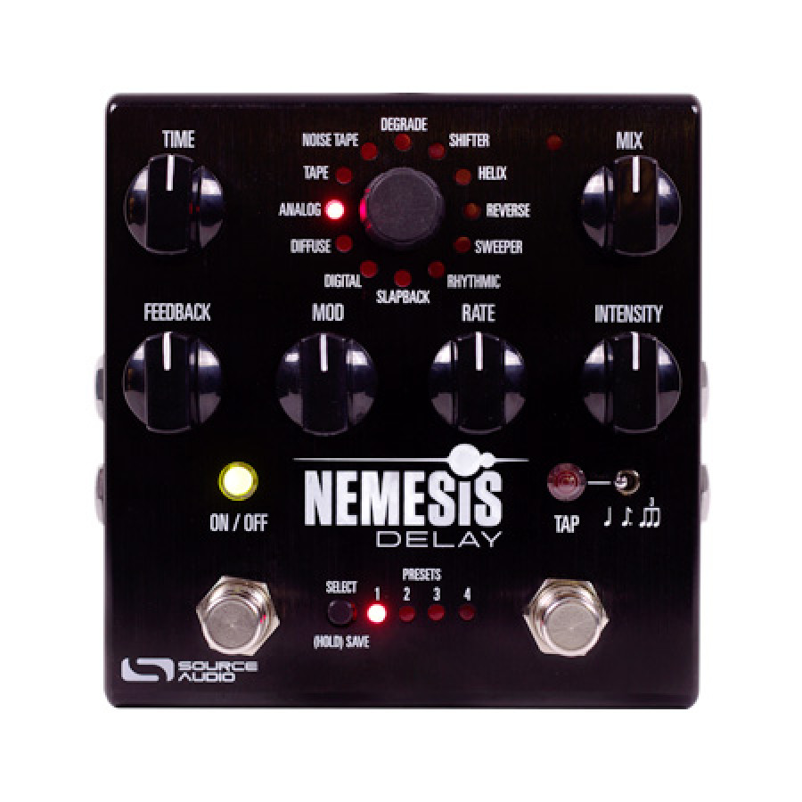 Nemesis охоплює повний спектр ефектів ділей, починаючи з великої колекції ретельно змодельованих звуків вінтажних ділеїв. Команда інженерів Source Audio провела більше року за вивченням численних знакових і затребуваних стрічкових ділеїв і ділеїв на основі чіпів bucket brigade, приділяючи величезну увагу всім нюансам. Tape, Noise Tape і Slapback ділеї Nemesis володіють всіма вібраціями, теплом і забарвленням, характерними для вінтажних стрічкових ділеїв, таких як Echoplex та Space Echo, з усім їх шармом. Аналоговий ділей прекрасно відтворює резонансні піки, символізуючи класичні педалі на bucket brigade чіпах. Цифровий ділей педалі відтворює чисті і чіткі повторення, створюючи звук подібний класичним рековим приладам.