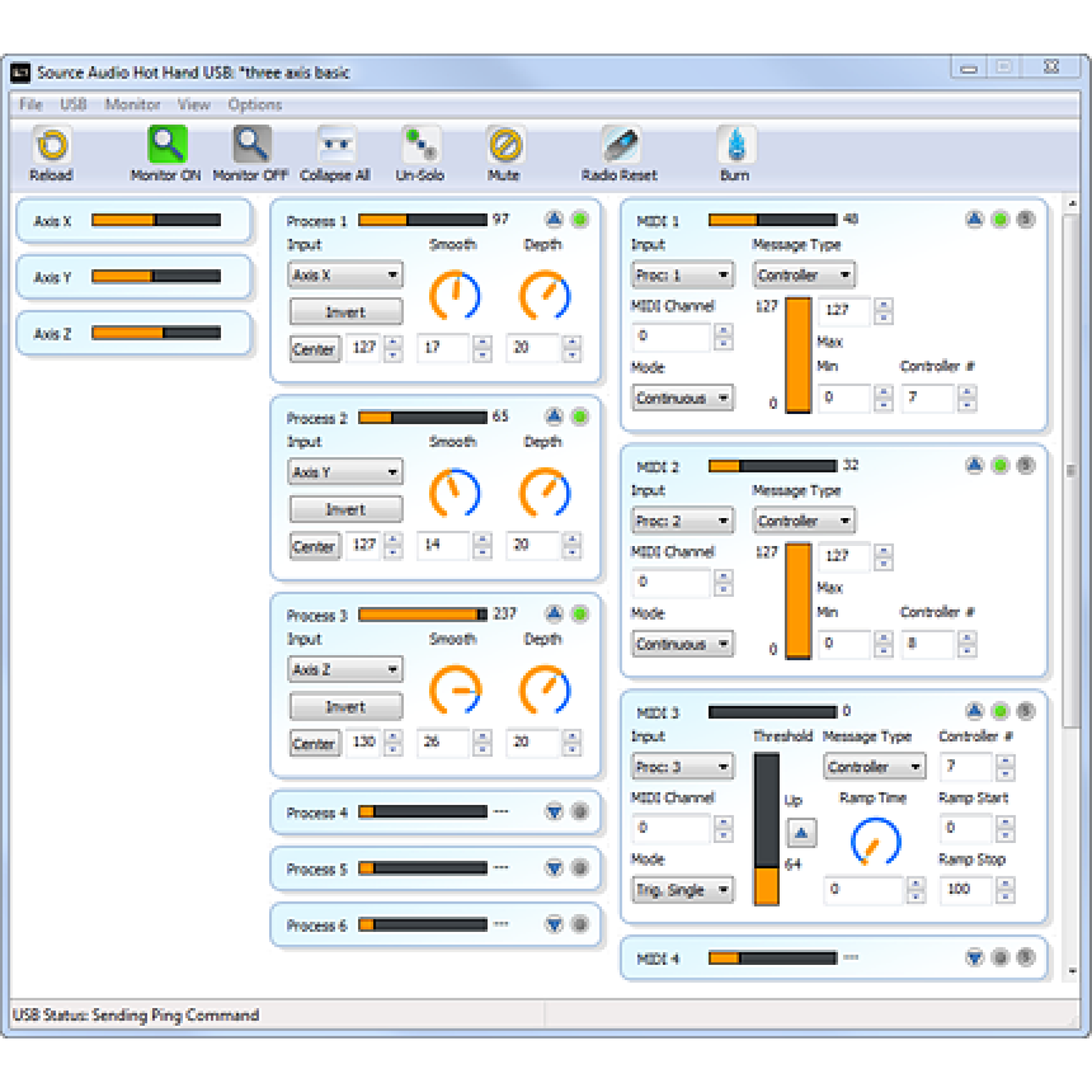 Редактор HOT HAND USB SOFTWARE EDITOR: конфігурування налаштувать Hot Hand USB можна здійснювати за допомогою програми-редактора, який дозволяє користувачам вибирати осі кільця, регулювати згладжування і глибину, призначати керуючі MIDI сигнали, вибирати тип MIDI повідомлень і багато іншого.